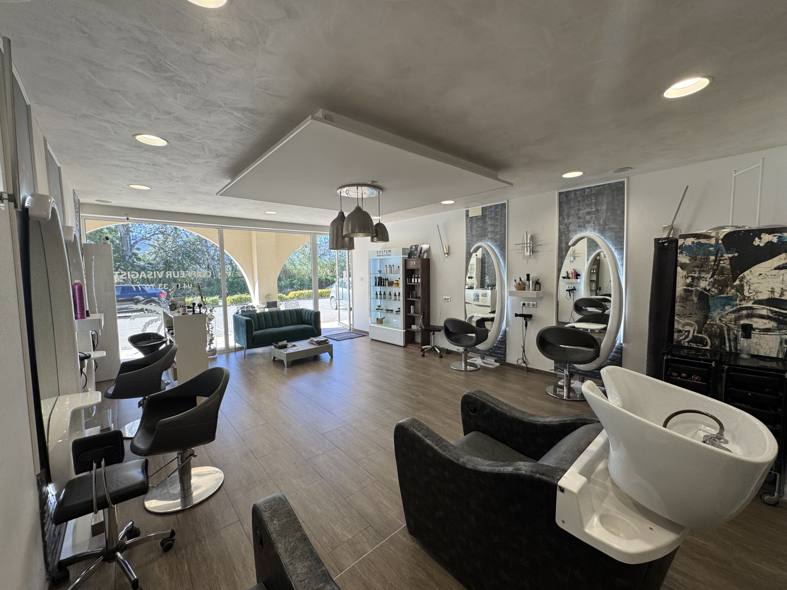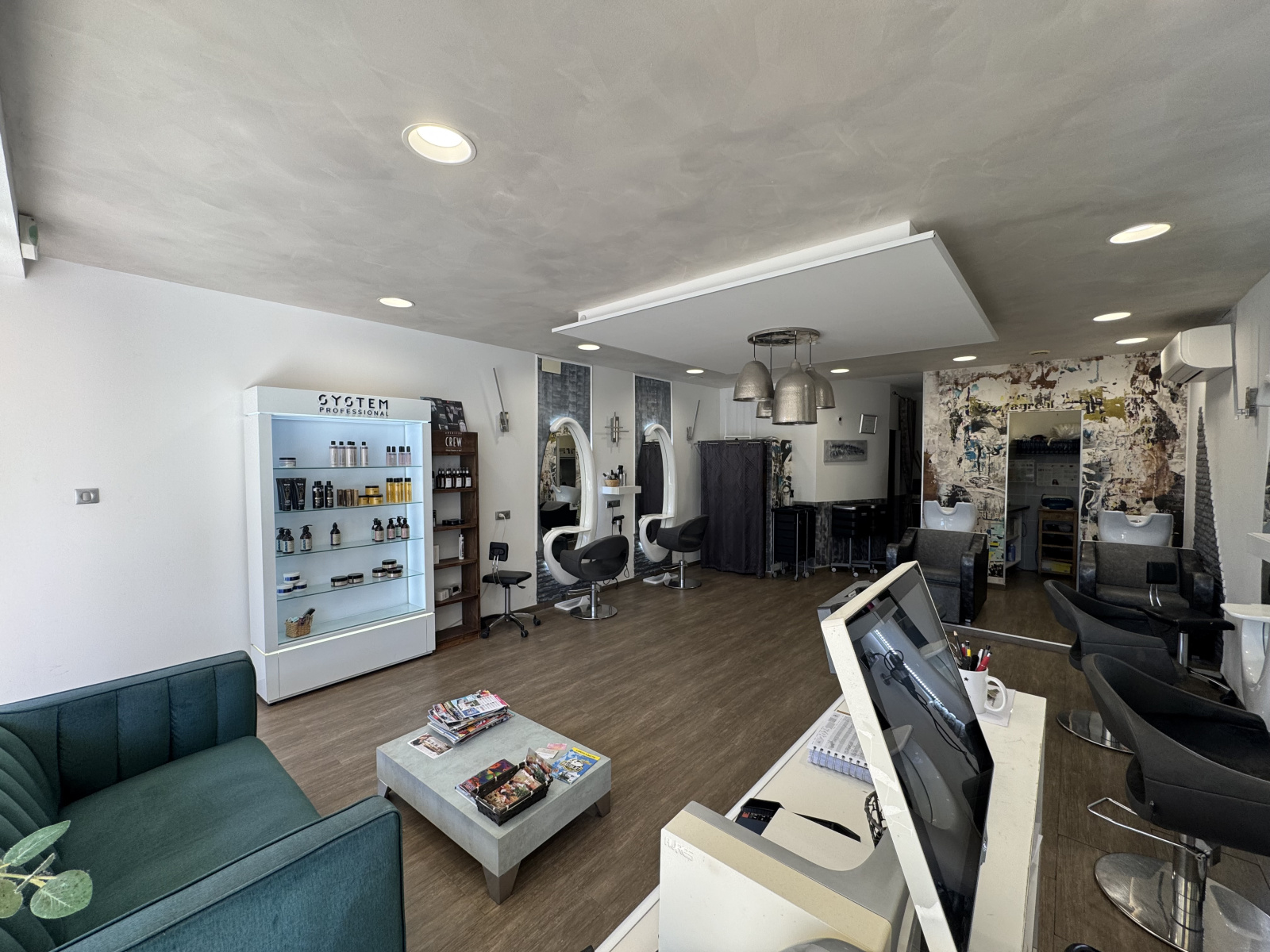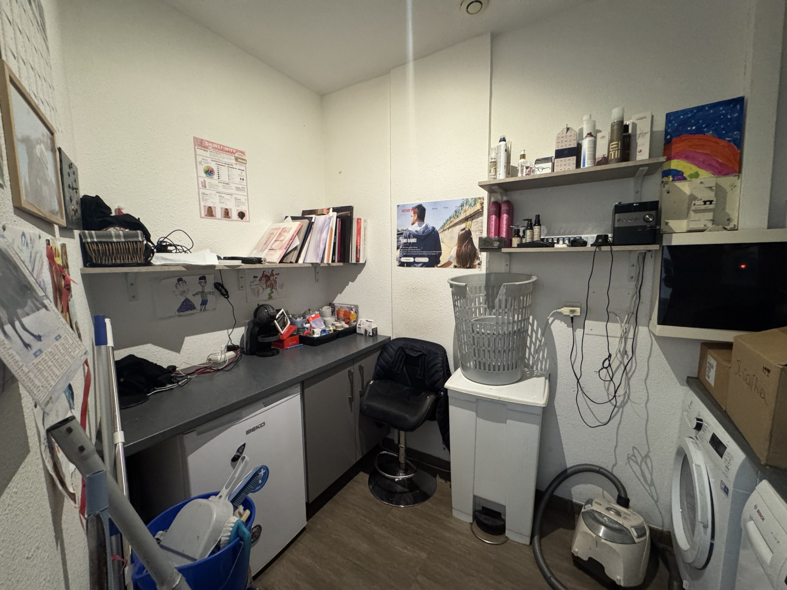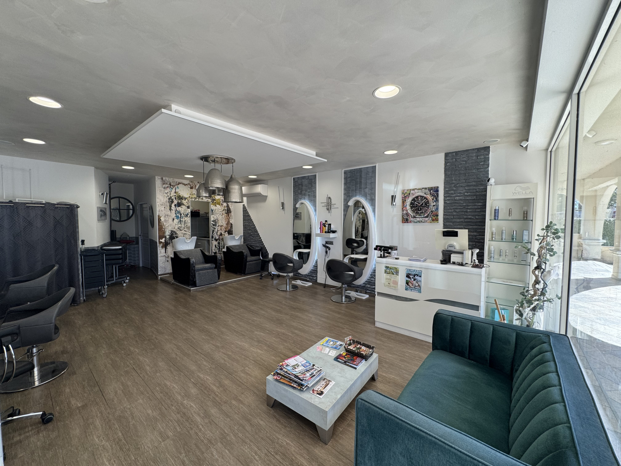 Il se comppose d'une pièce principale de 36m2 avec coin accueil/attente, 4 postes de coiffures, 3 bacs à shampoing avec fauteuils électriques allongés et massants, une première réserve est situé à l'arrirère.