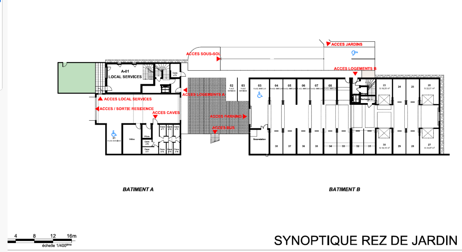 Ensemble constitué de 2 bâtiments en R+3 (rez-de-jardin inclus) avec 1 niveau de sous-sol sous le bâtiment B.