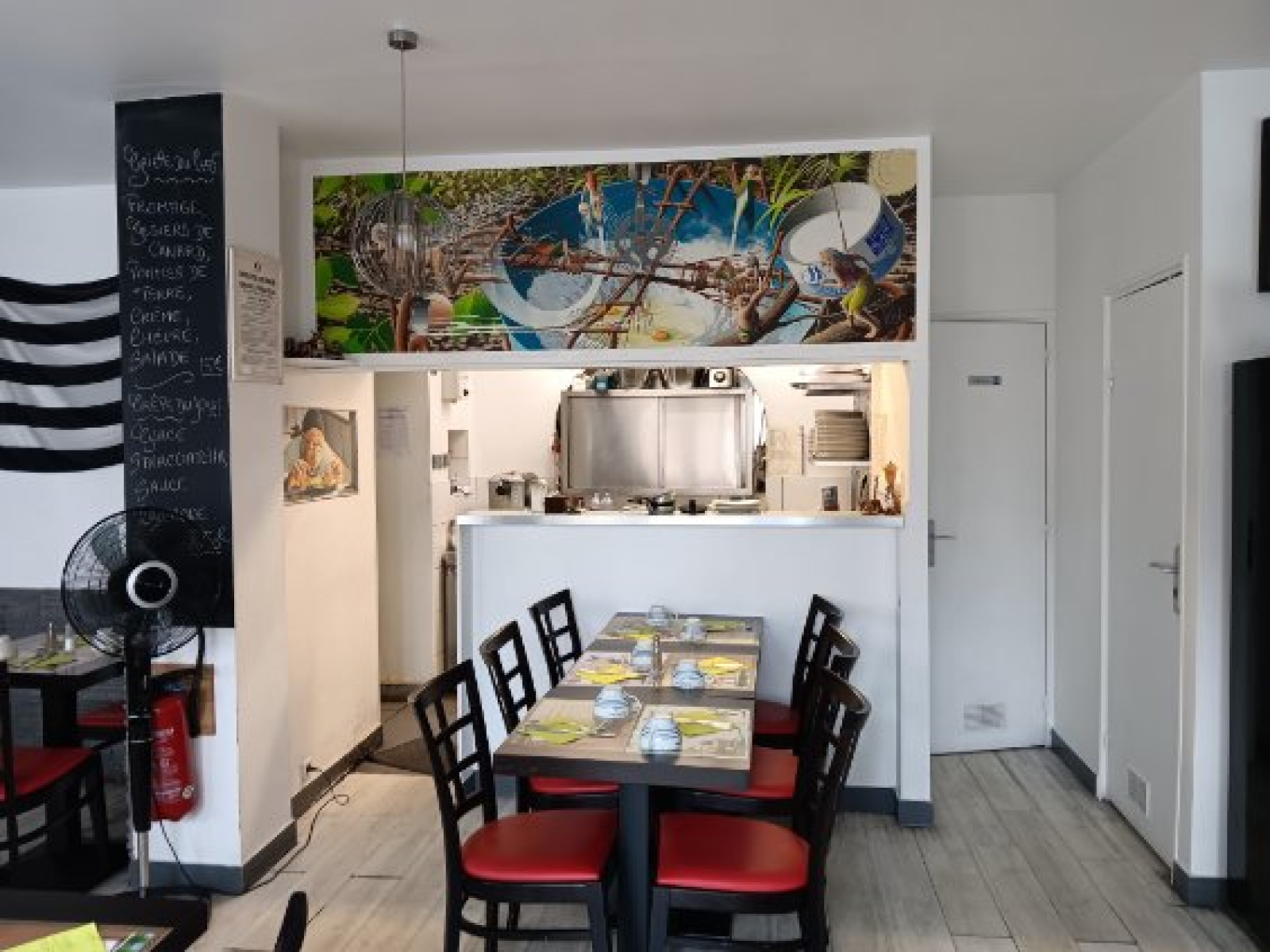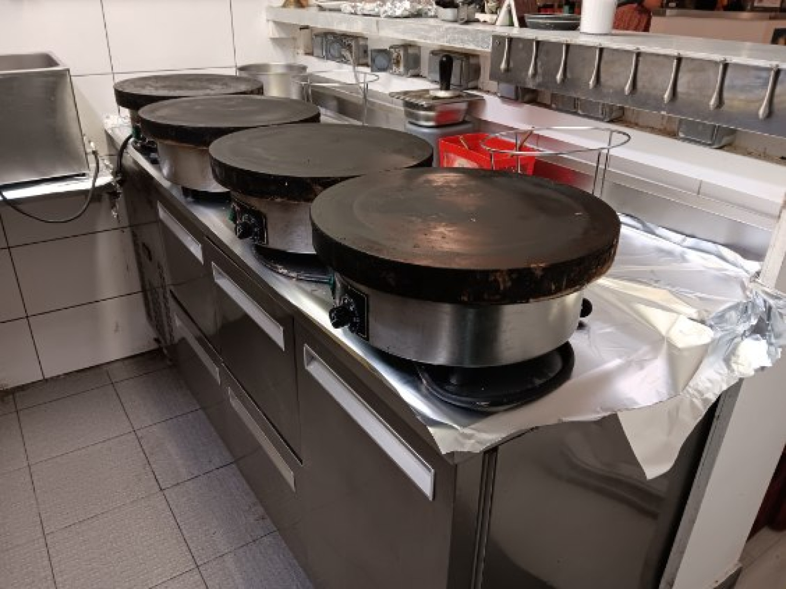 - Équipement de Cuisine : 4 plaques de cuisson spécial crêpe, arrière-cuisine pour les préparations et plonge