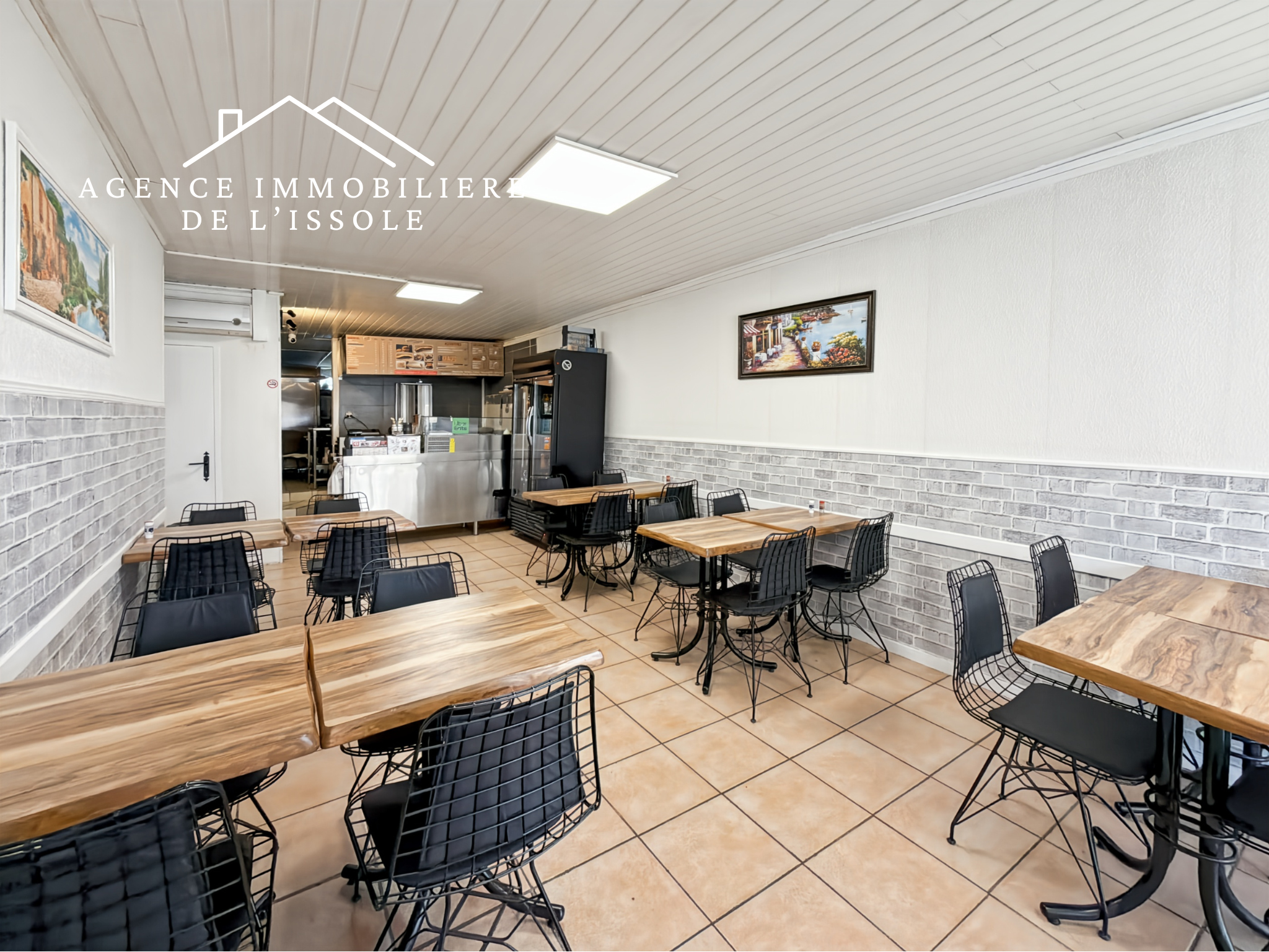 Fonds de commerce avec licence petite restauration, permettant de la restauration rapide sur place grâce à la salle d'environ vingt couverts et à une terrasse extérieure louée à la mairie lorsque le temps le permet, ou à emporter.