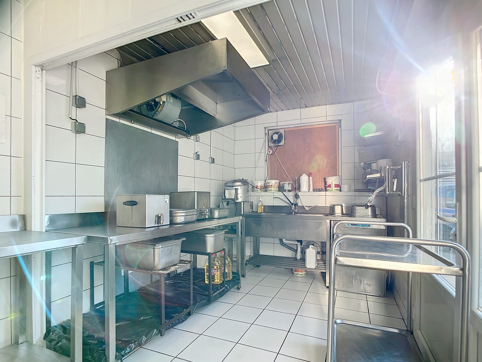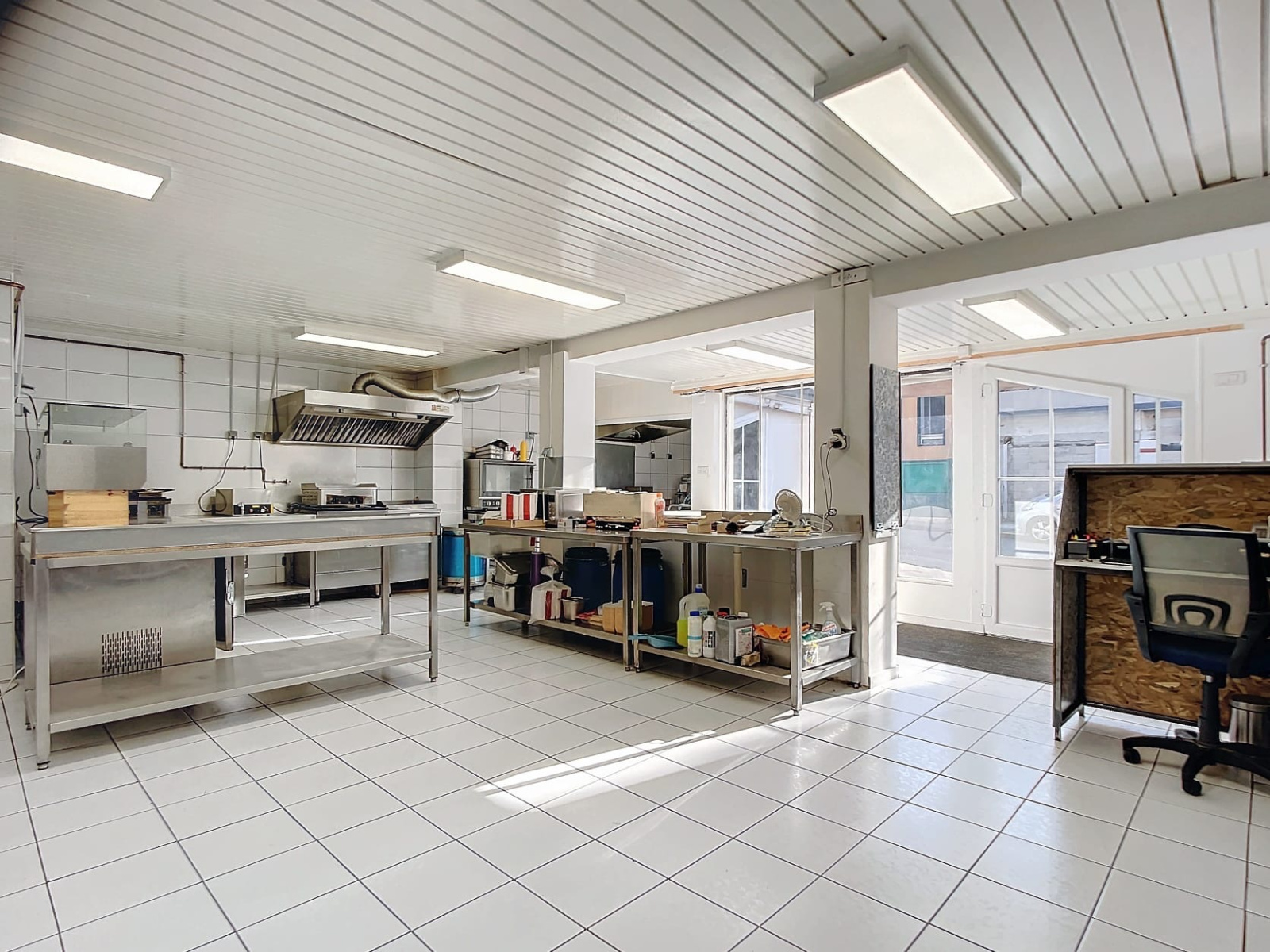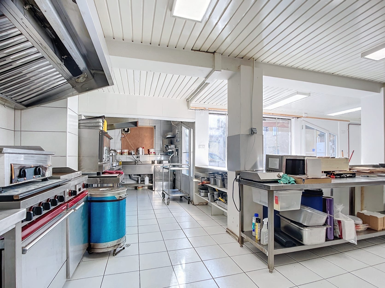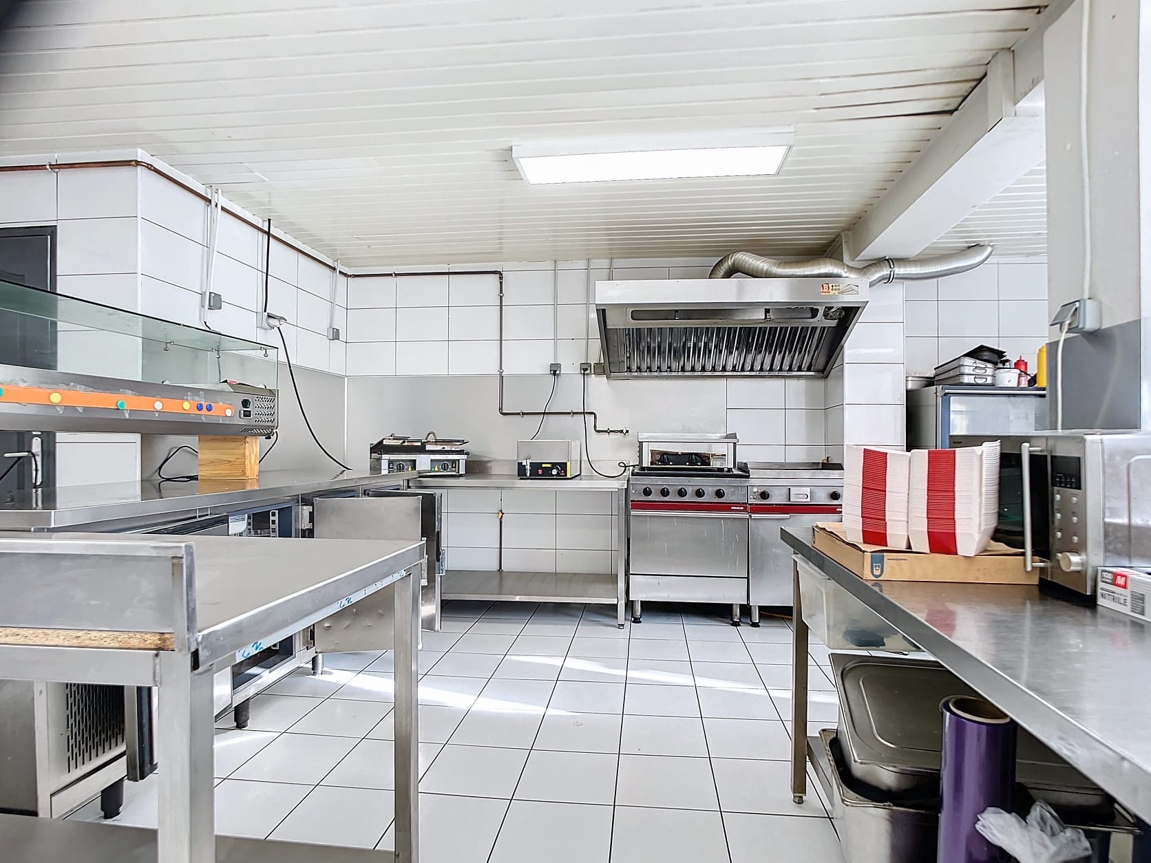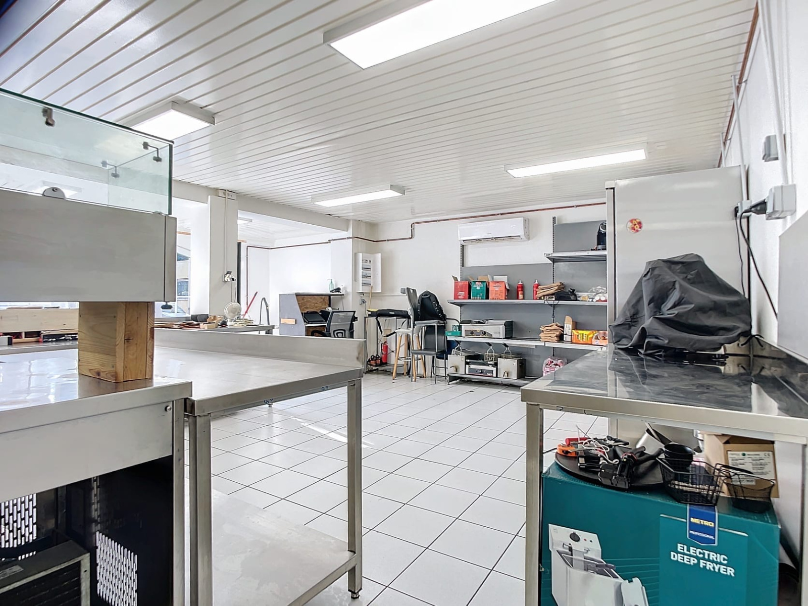 .3 frigo.Hotte .Congélateur .Plancha.Saladette.Lave vaisselleMaintien chaud.2 friteuses.Presse a planification.Four.Caisse électronique .Console Évier.6 tables inox