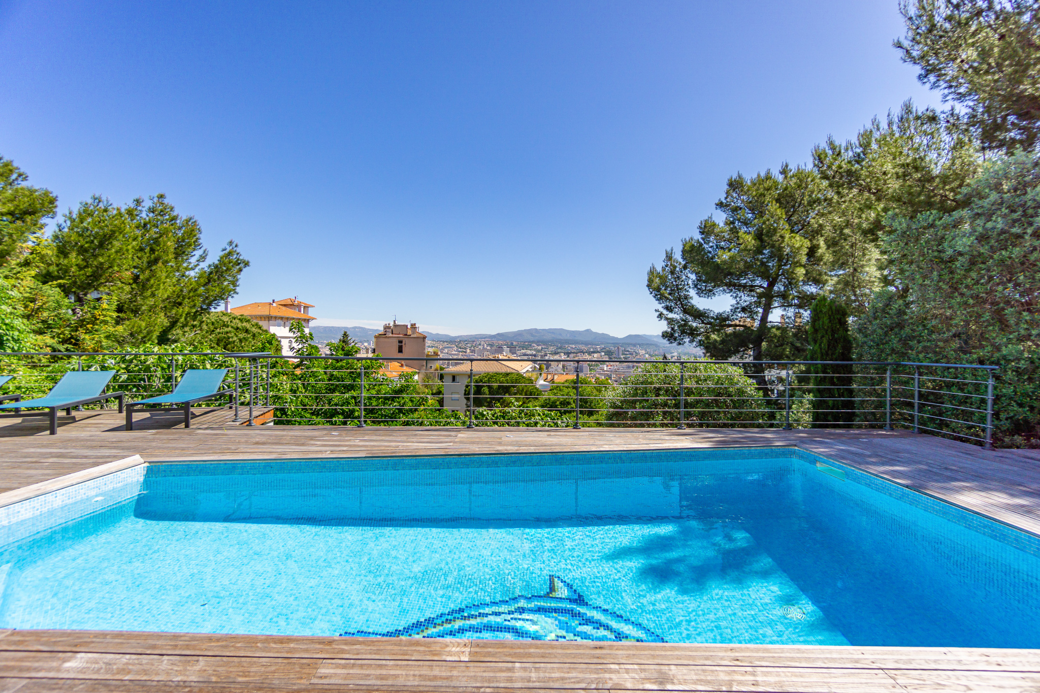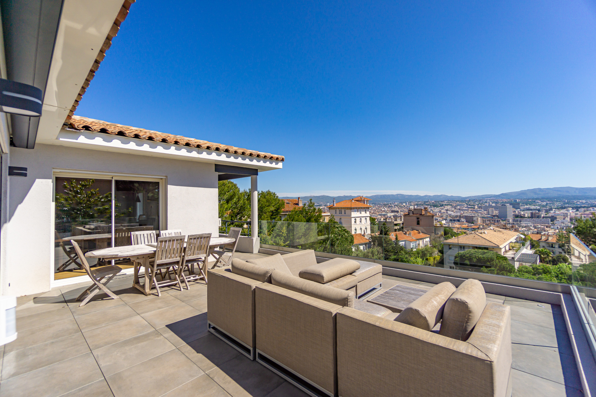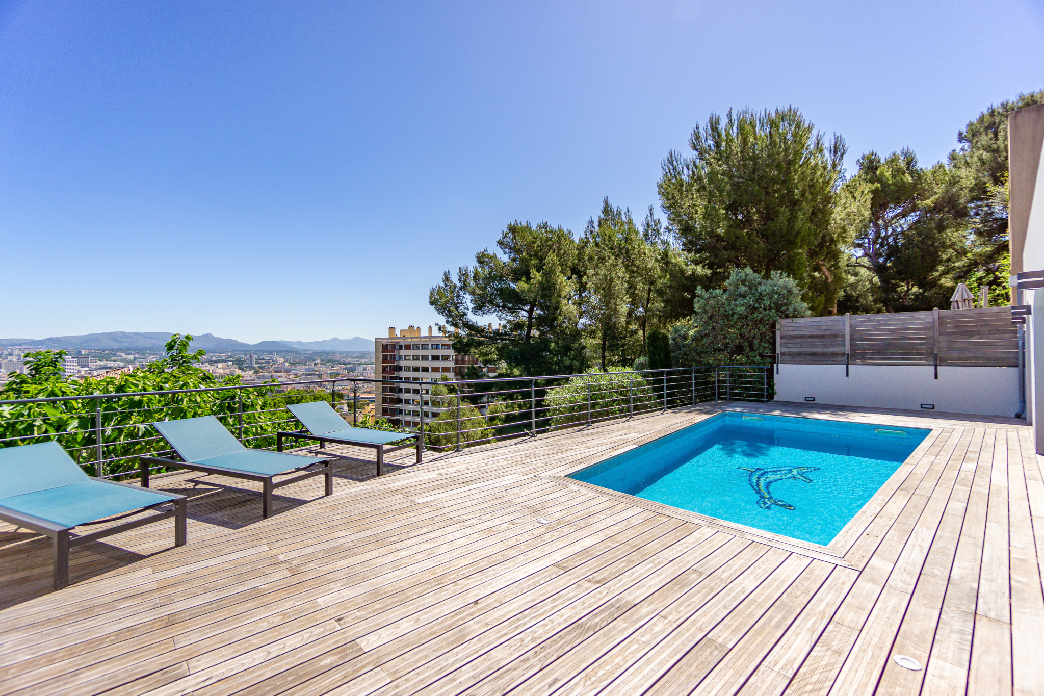 Sur les hauts de Perier, en position dominante, cette maison lumineuse de type 5 de 206 m2 et 60 m2 de dépendance entièrement revisitée en 2018 offre une vue panoramique sur la ville et Notre- Dame de la Garde. Cette maison bénéficie d'un bel espace de vie avec cheminée , une cuisine équipée ouverte sur la salle à manger , le tout donnant sur une très belle terrasse de plus de 60 m2 avec des gardes corps en verre afin de profiter pleinement de cette vue panoramique. En R_1 se trouve l'espace nuit dont 3 chambres avec une salle de bains et une salle d'eau , des rangements dans toutes les chambres ainsi qu'une suite parentale offrant de très beaux volumes avec sa salle de bains et son dressing. Une buanderie. En R_2 une belle piscine avec sa plage en teck , vous aurez la possibilité d'aménager les 60 m2 qui bordent la piscine en pool house , studio ou dépendance salle de sport . Un garage ainsi que 2 places de parkings viennent compléter ce bien. Chauffage et climatisation avec pompe à chaleur. Aucun travaux à prévoir. Au Calme. Pas de vis à vis. Expo sud/est.