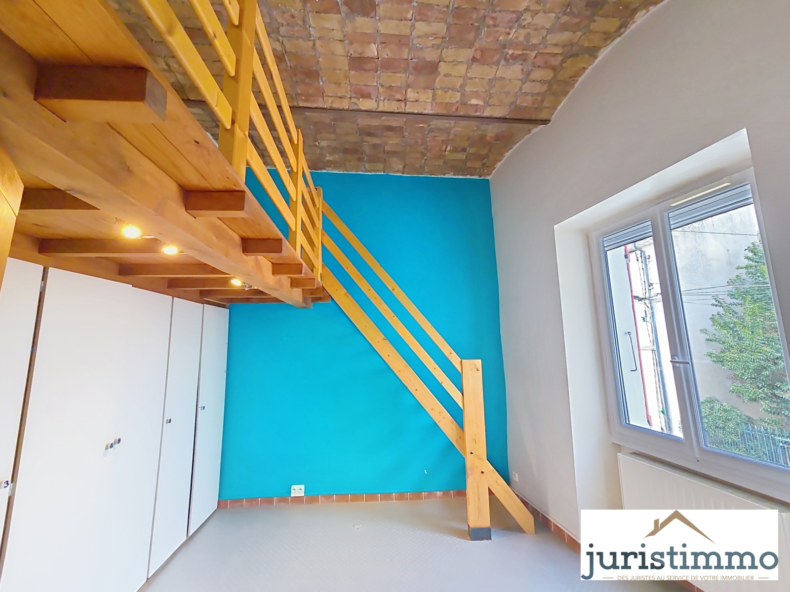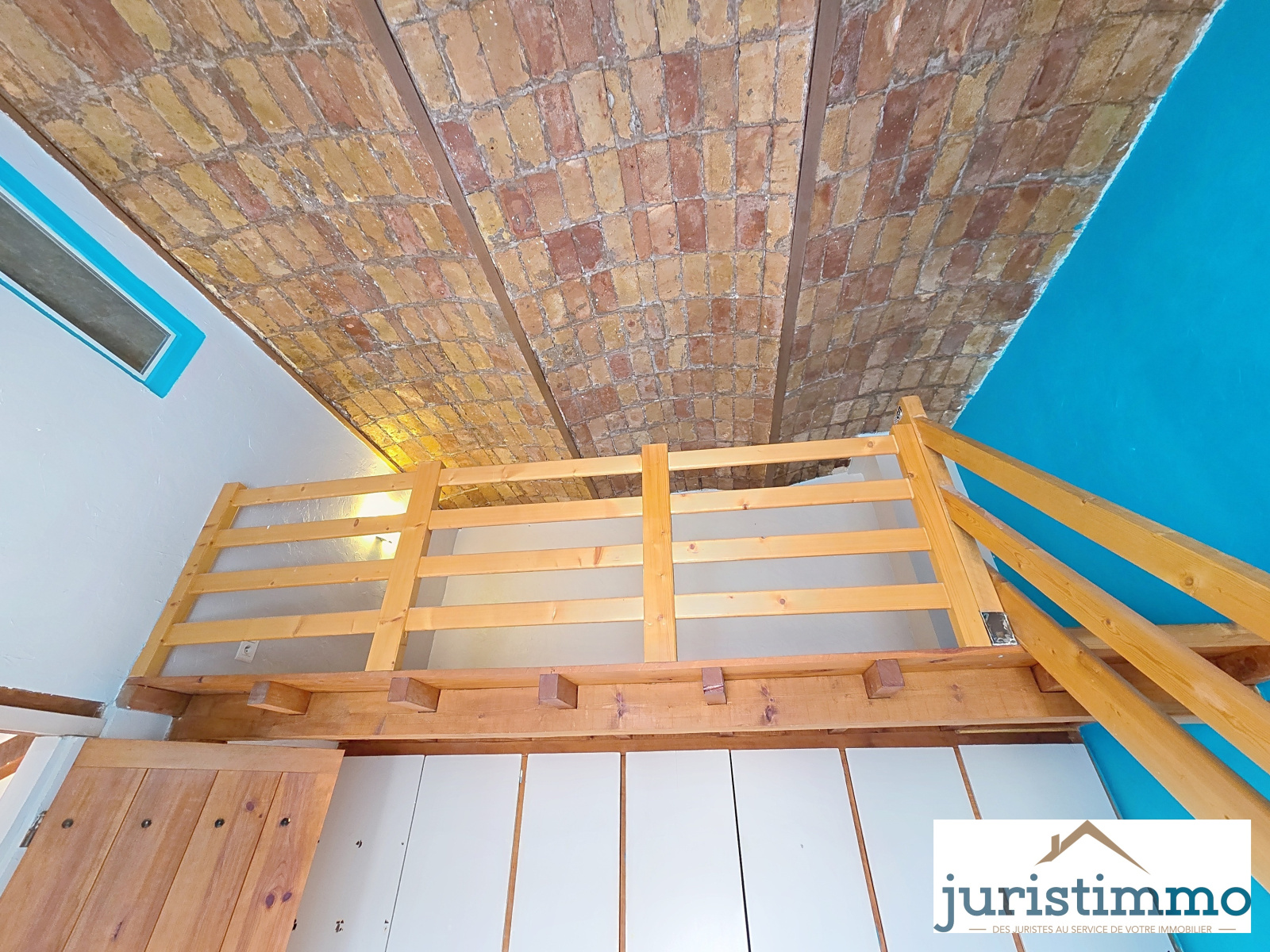 - Une chambre de 14,2 m², agrémentée d’une mezzanine de 5,5 m² (hauteur sous plafond de 1,5 m), avec un sol au style industriel et un plafond en briques, apportant une ambiance chaleureuse et unique.
