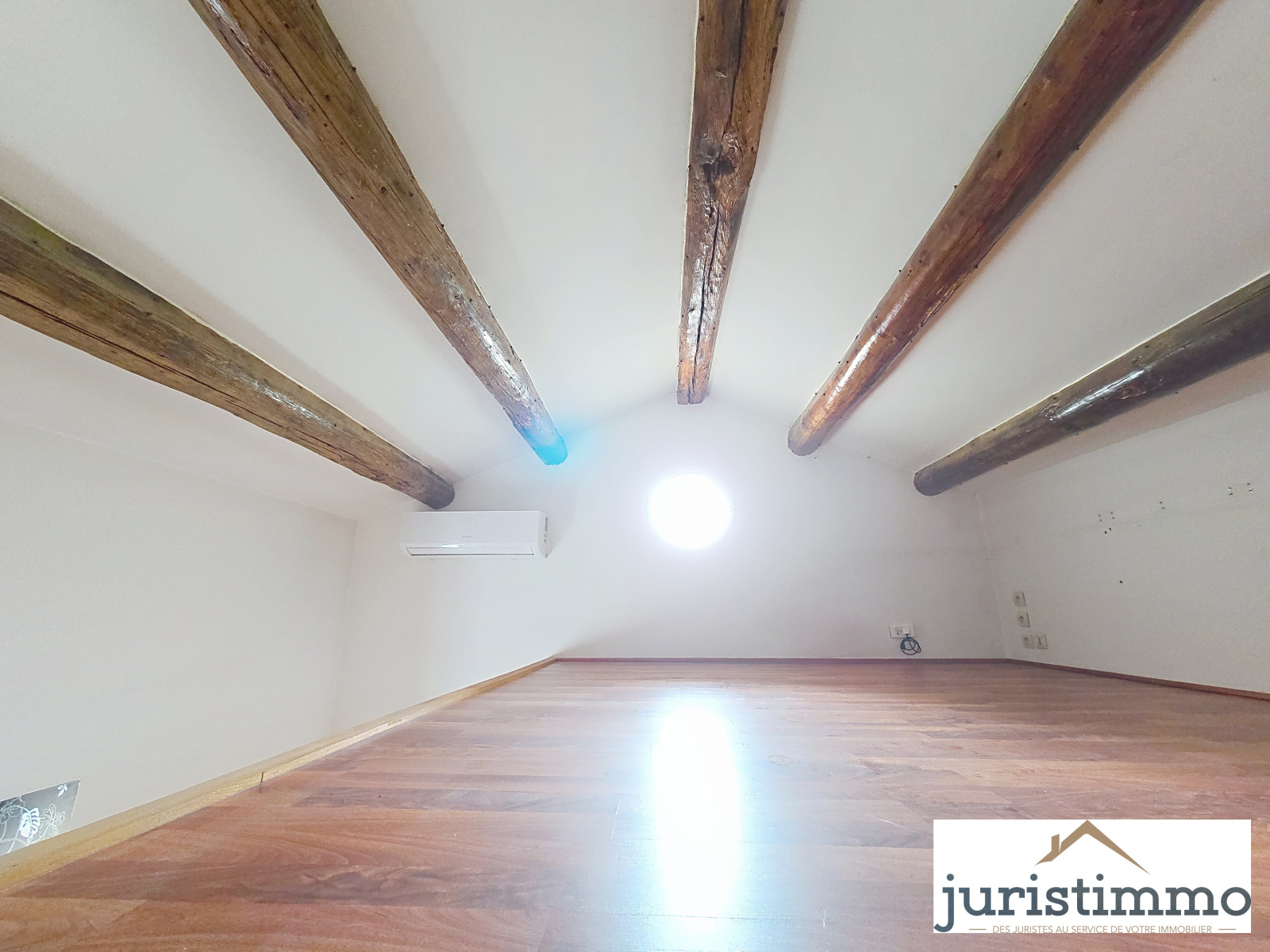 - Une chambre parentale de 19,3 m², lumineuse et traversante, avec poutres apparentes et salle de bain privative.