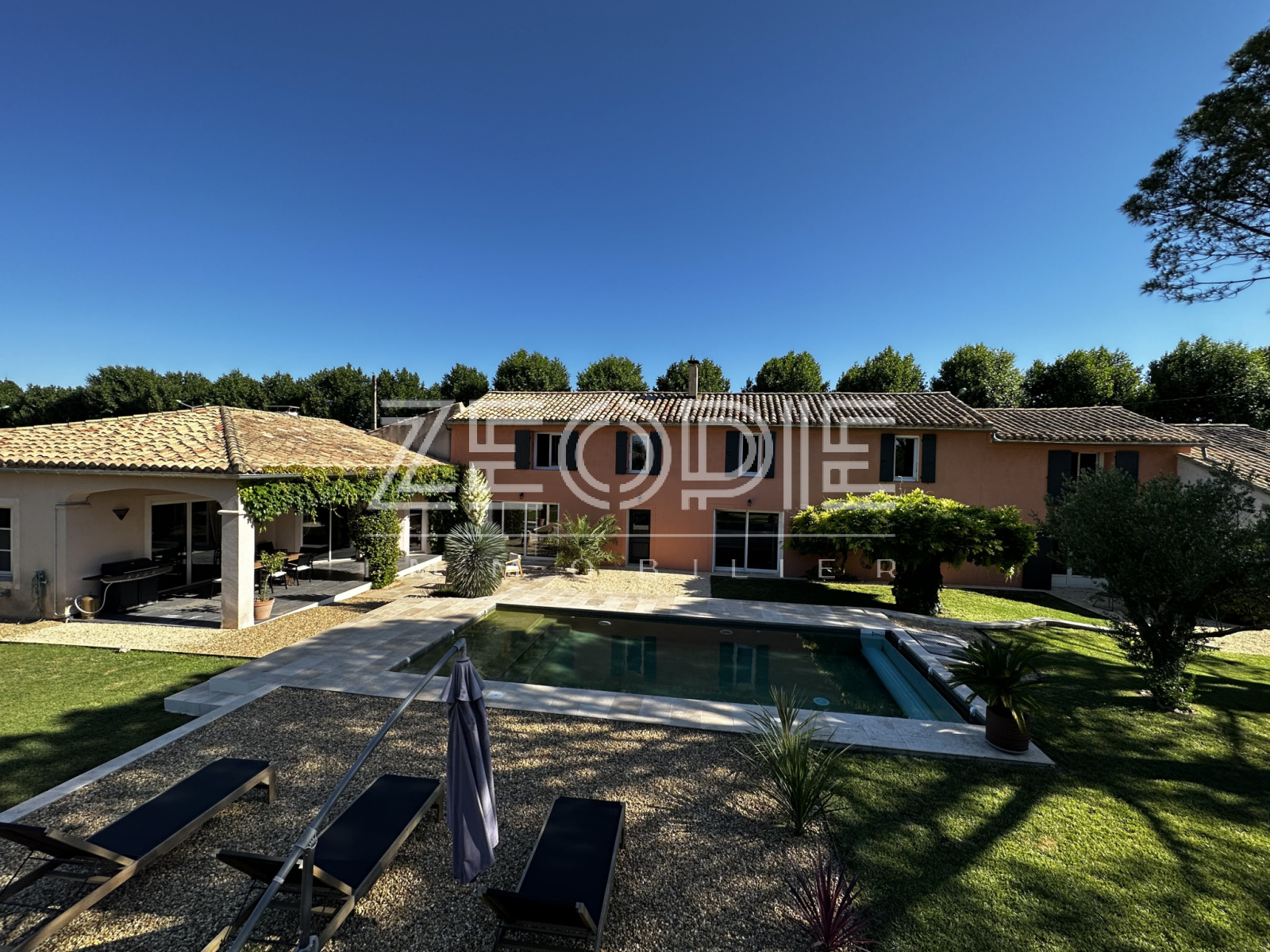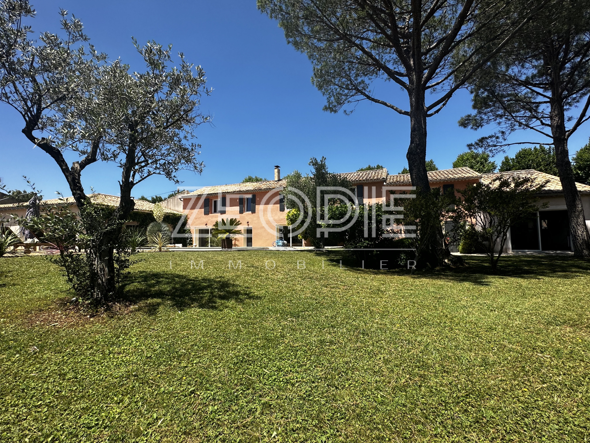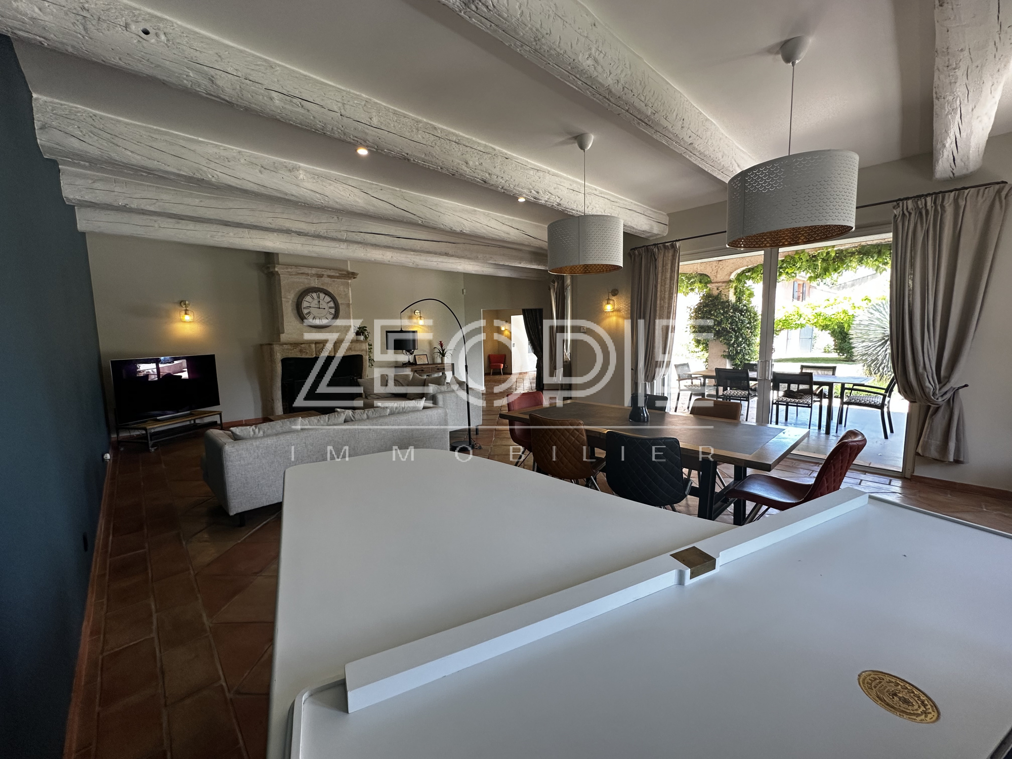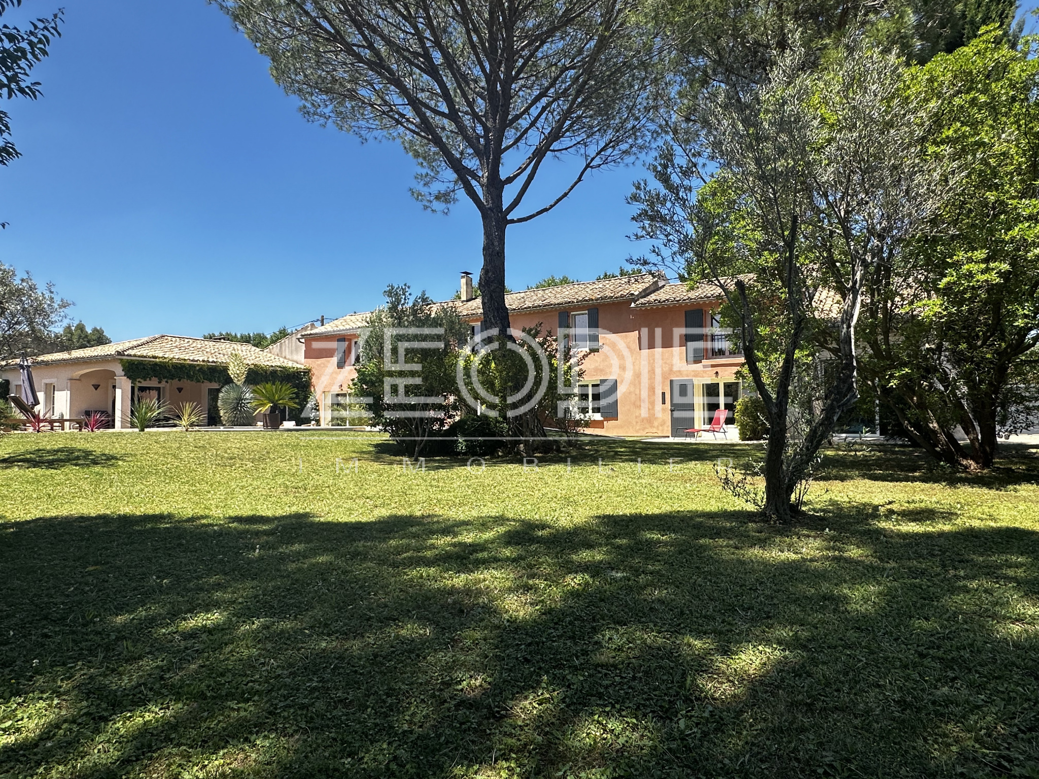 Ce mas ancien non mitoyen élevé d’un étage sur Rez de chaussé est implanté sur un jardin clos et paysage de 2000m2. Situé au calme et sans nuisance malgré sa proximité des commerces et du centre ville, ce mas ancien de 310 m2 habitables environ se compose en rez de chaussé d’un grand hall d’entrée avec placards, d’un salon / Sam de plus de 60m2 avec cheminée en pierre, d’une grande cuisine de 20m2 environ entièrement équipée et rénovée avec 2 arrières cuisine / buanderie pour le stockage et les machines à laver et sèche linge. Ensuite un petit salon / coin TV de 15m2 environ avec cheminée insert panoramique, un bureau de 15m2 et enfin une suite parentale de 25m2 environ avec placards, salle d’eau et WC privatif. Accès direct sur le jardin par porte fenêtre. A l’étage vous accéderez par un escalier central à 2 chambres sur votre droite, une de 16 m2 et l’autre de 25m2 environ. Ensuite de l’autre côté à l’étage 1 première chambre de 16m2 environ, une grande salle de bain de 13m2 avec double vasque, baignoire et douche à l’italienne. Enfin une 4eme chambre avec placards de 18m2 environ, un dressing aménagé de 10m2 et un WC séparé. La maison bénéficie de 3 garages, un premier de 40m2 environ avec 2 portes sectionnelles automatiques pour garer 2 véhicules, une cave à vin et un espace de rangement supplémentaire de 15m2 sous toiture. De l’autre côté de la maison un garage de 25m2 environ avec mezzanine en bois à l’étage de 15m2 environ. La maison a été rénovée très récemment, pour votre confort vous bénéficierez du double vitrage PVC KparK, d’un système de chauffage central par pompe à chaleur DAIKIN ( au sol au Rez de chaussé et radiateur alu à l’étage) + une climatisation réversible MITSUBISHI dans toute la propriété. Façades rénovées cette année, gouttières en zinc, toiture complètement rénovée également, tout à l’égout… Matériaux de qualités ( carrellage terre cuite, parquet, poutres… ) exposition plein sud, terrain de boules, arrosage automatique, raccordement à la fibre, forage et arrosage automatique, piscine traditionnelle chauffée de 9 mètres x 4, portail automatique, une terrasse couverte de 25m2 et une autre non couverte de 20m2. Parc arboré et clos de 2000m2 au calme et sans vis, possibilités d’agrandissements. Possibilité de vente entierement meublée et équipée.