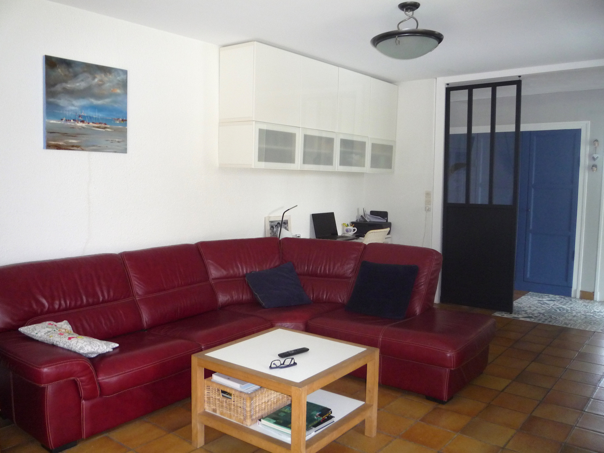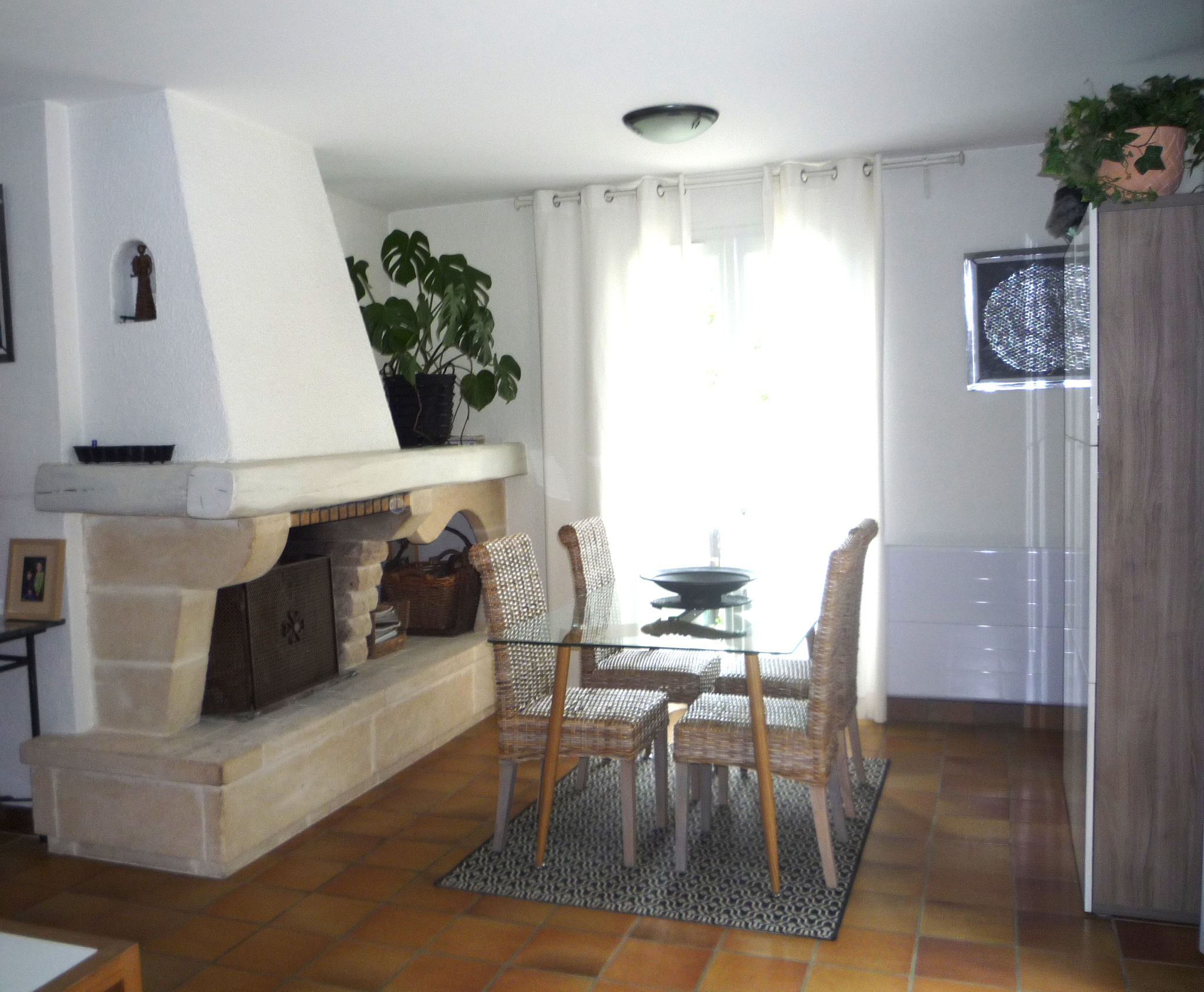 Salon séjour et espace bureau avec cheminée et accès direct à la terrasse.