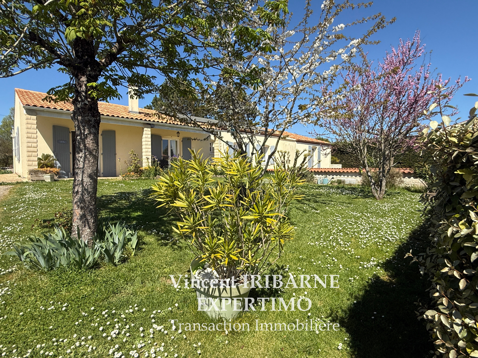 cette belle maison spatieuse de plain-pied sur sous-sol, situé dans un charmant village avec commerces, à quelques minutes de Saintes, offrant un cadre paisible sur un terrain d’environ 2 000 m².