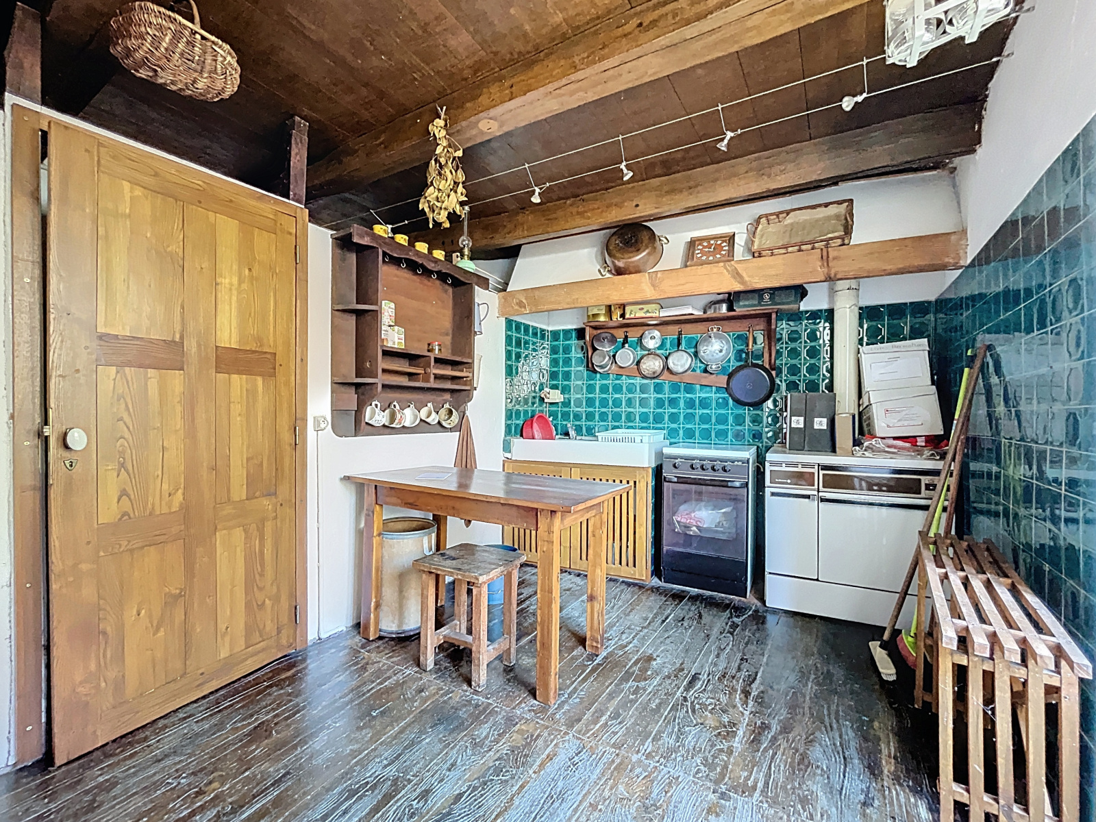 Une cuisine de 10 m² menant à une salle d’eau avec WC,