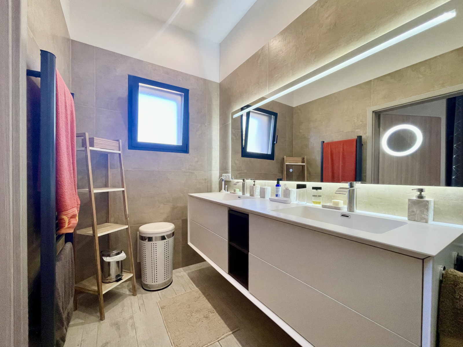 Dès l’entrée, la sensation d’espace s’impose : volumes généreux, circulation fluide, baies vitrées à galandage qui invitent la lumière à chaque instant. Le séjour, véritable cœur de la maison, s’ouvre sur une terrasse de 100m² à aménager selon vos envies : jardin d’hiver, espace lounge ou coin repas sous les étoiles… tout est possible.