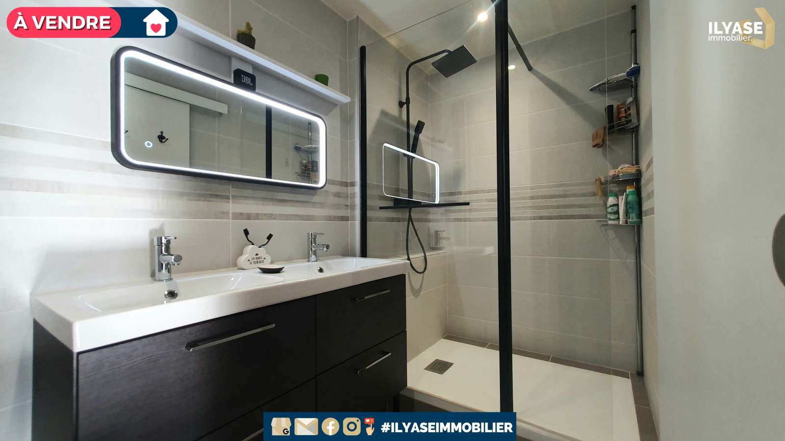 - Salle d’eau avec douche et vasque + miroir éclairé