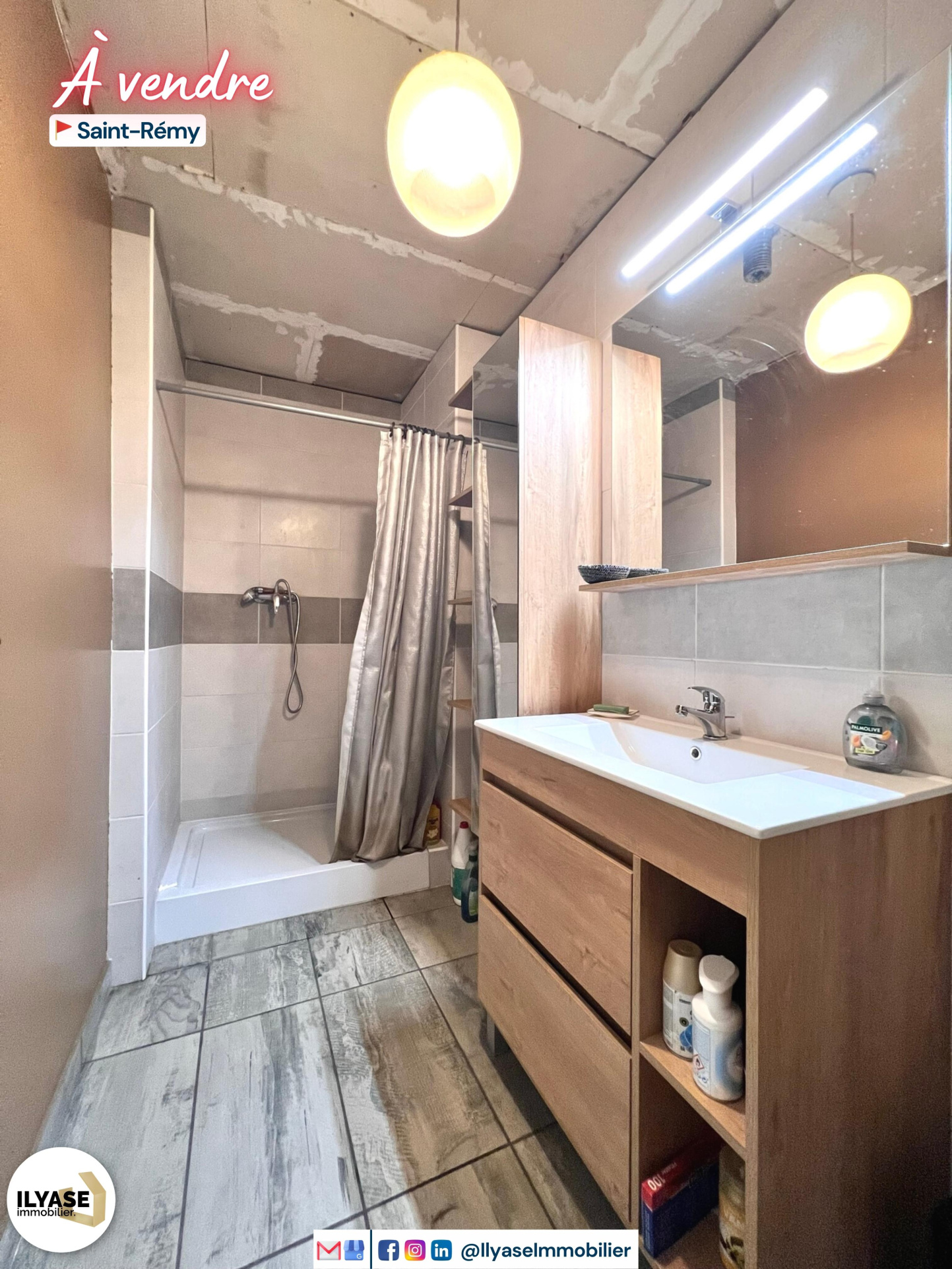 - 1 salle d'eau avec meuble vasque, miroir éclairé et WC,