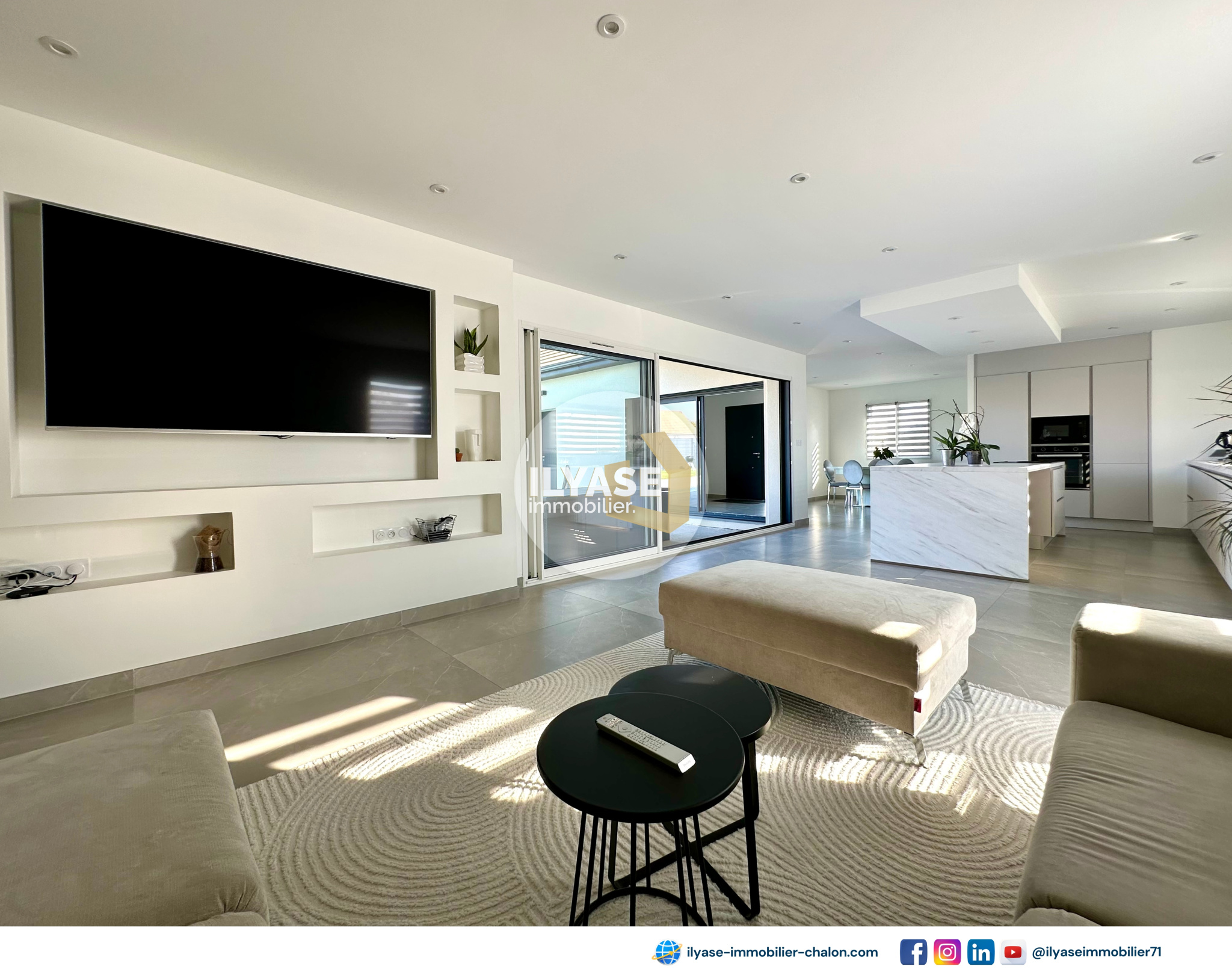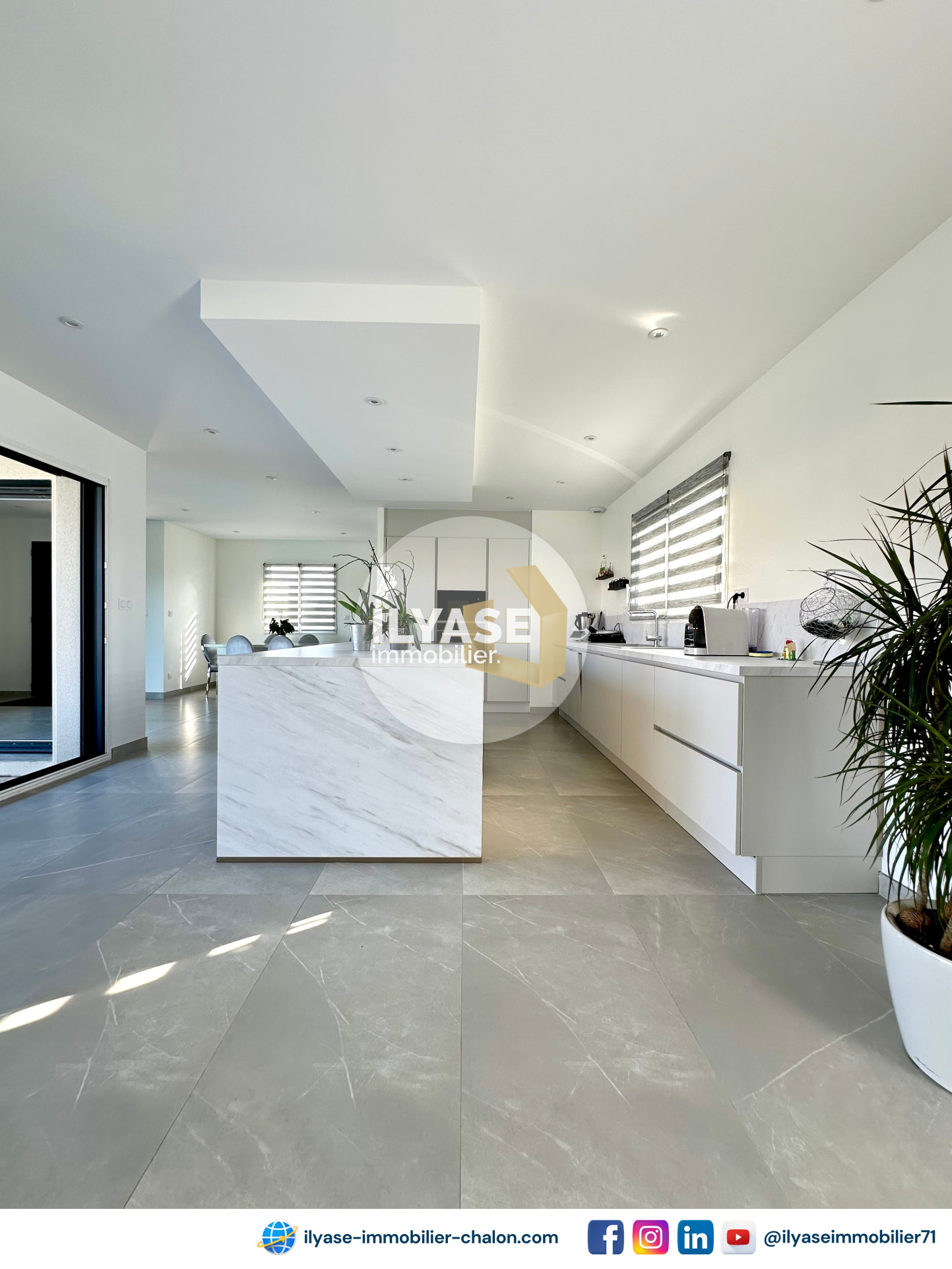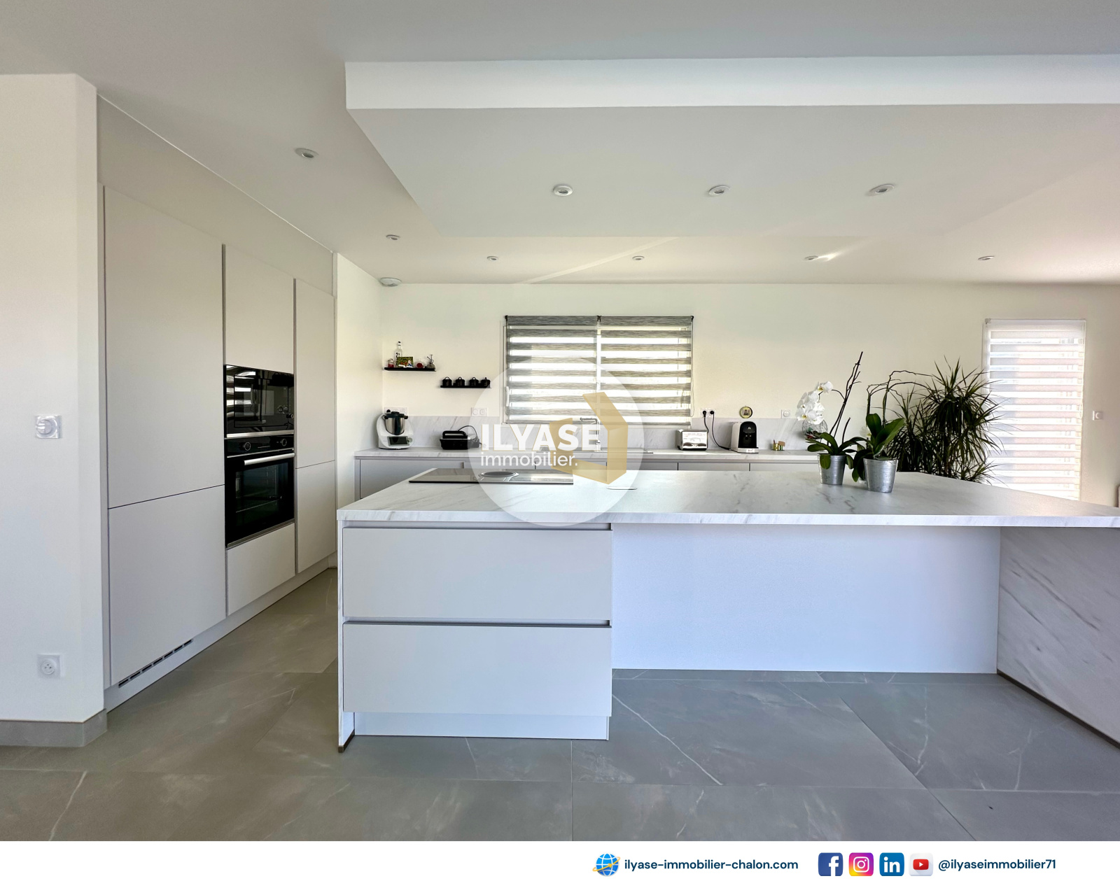 - 1 cuisine équipée spacieuse, avec un double ilôt, vous offrant une vue panoramique sur l'espace de vie, votre extérieur ainsi que la piscine,