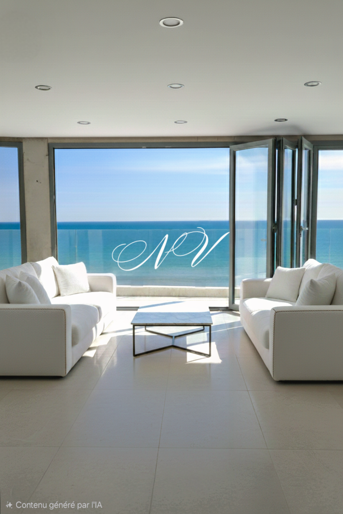 - Dès l’entrée, vous faite immersion dans la pièce de vie de 60 m², entièrement ouverte sur la mer. De grandes baies vitrées de près de trois mètres de hauteur s'ouvrent totalement et effacent toute frontière.