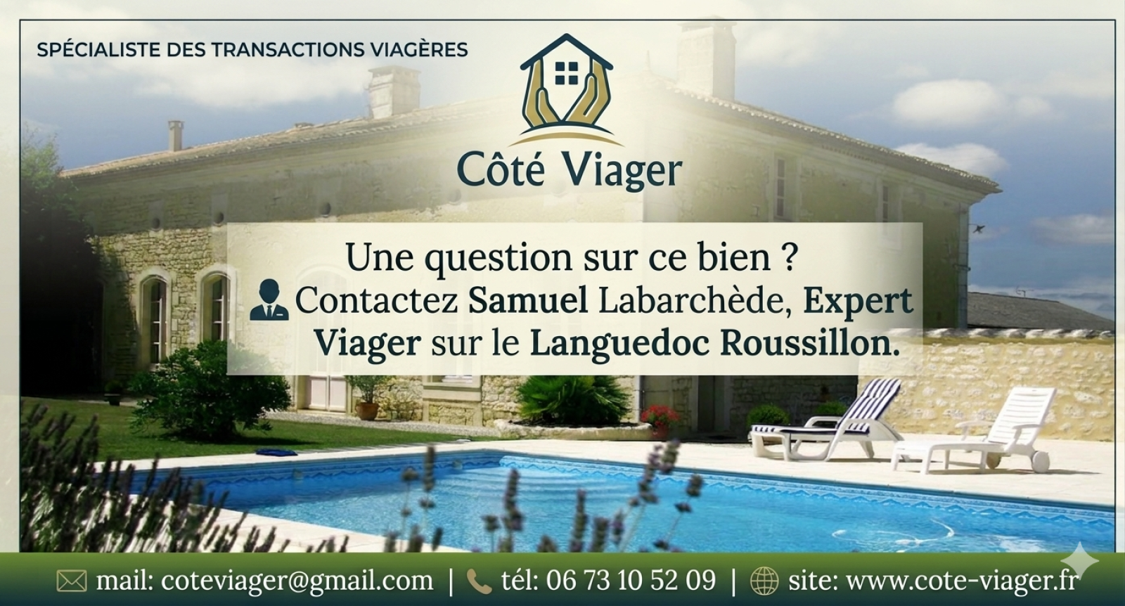 Contactez Samuel Labarchede réseau Expertimo / Cabinet Côté Viager SARLU au capital de 1000 € dont le siège social est situé au 7 rue de la source 34410 Sauvian N° 804 437 424 R.C.S Code NAF 6831 Z - carte professionnelle délivrée par le CCI de Montpellier N°CPI : 34012018000028680 ( transaction sur immeuble et fonds de commerce) . Caisse de garantie Galian rue de la boétie 75008 Paris pour un montant de 120000 euros- mail : coteviager@gmail.com site internet www.cote-viager.fr