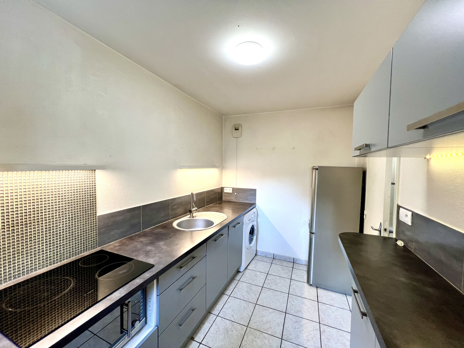 On retrouve à l'intérieur : une entrée avec placards, un grand séjour avec placards, cuisine équipée (lave linge séchant, plaque de cuisson électrique, frigo, congélateur, micro ondes), salle de bain avec wc