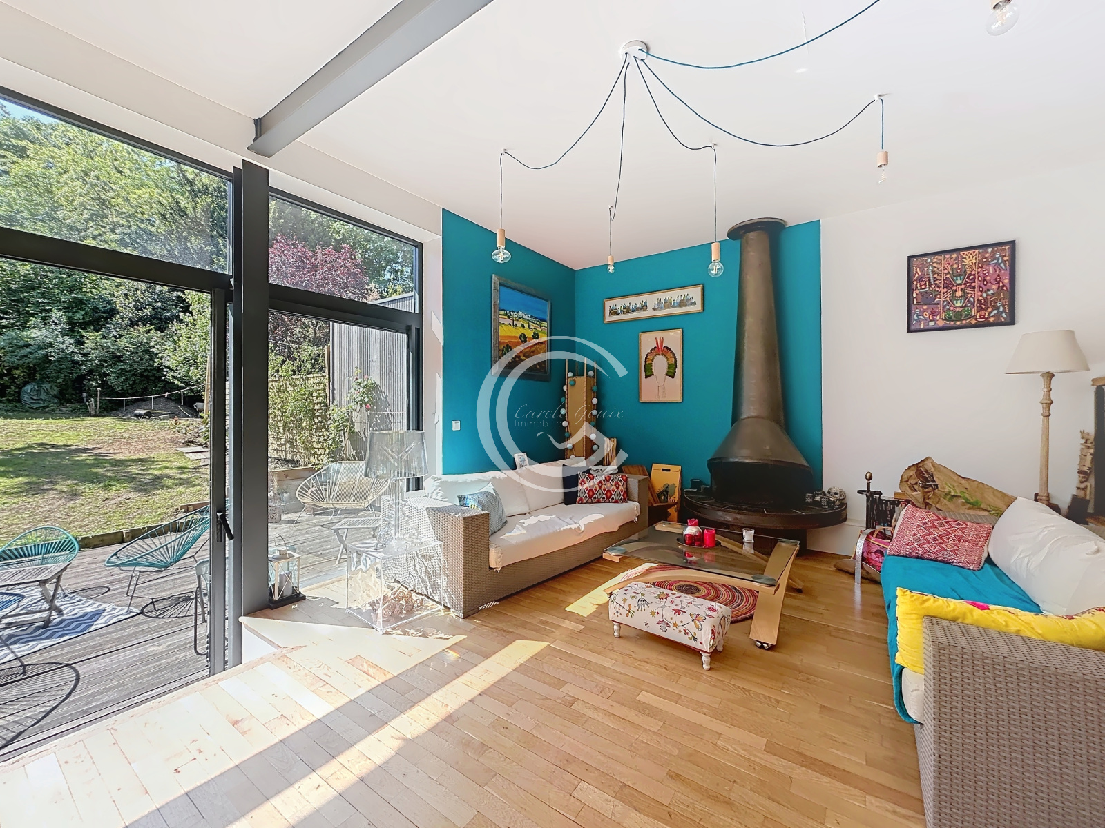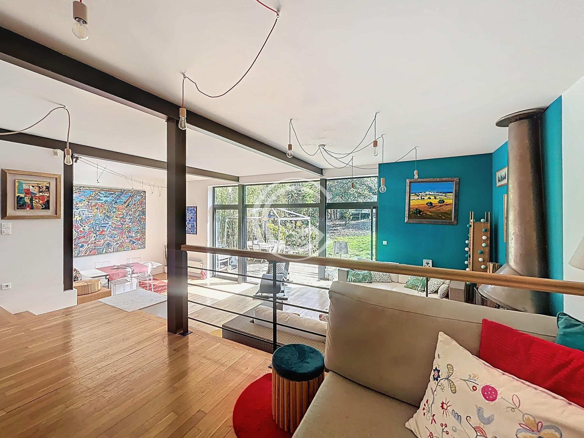 > Au REZ-DE-JARDIN, passé le hall d’entrée cathédrale, la vue des hautes et grandes baies vitrées du triple salon de 60m² environ vous projettera directement sur la terrasse en bois de 50m² donnant sur le jardin. La hauteur sous plafond jusqu'à 3m50 conforte l'esprit loft et le caractère exceptionnel et rare de cette maison. Une cheminée en acier brossé agrémente chaleureusement de belles soirées d’hiver dans le salon. A ce niveau également, une cuisine dînatoire semi ouverte (fermeture possible) de 17m² et sa buanderie attenante, un bureau de 12m² (ou 5è chambre) et des WC.