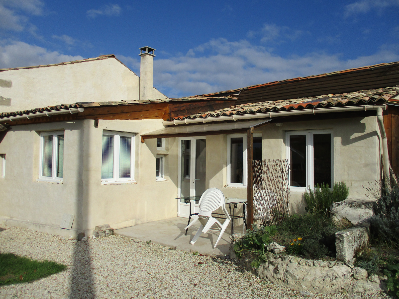 Proche de Mirambeau, dans un hameau, ensemble de 2 maisons charentaises rénovées dans une démarche écologique avec double vitrage, sur une parcelle de 1250 m² avec un puit.
