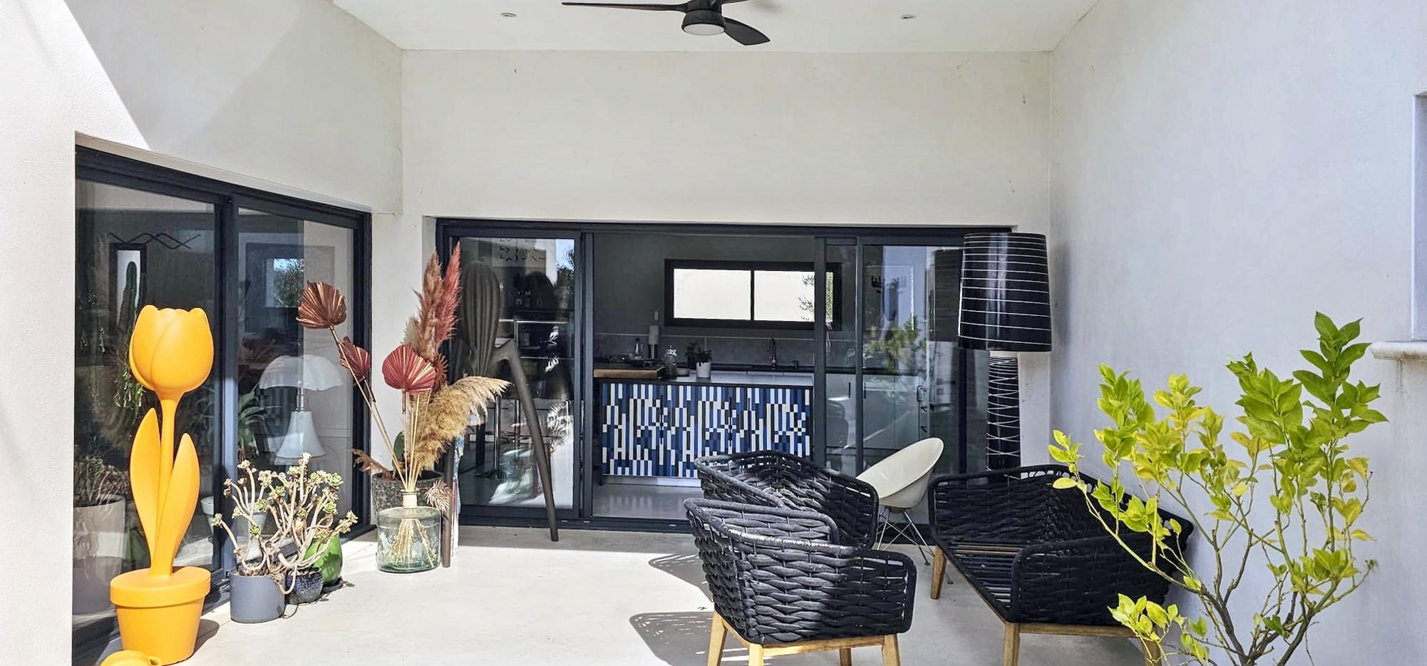 La villa bénéficie de prestations haut de gamme : domotique intégrale, climatisation gainable, grandes baies vitrées à galandage et système d’alarme, garantissant confort et sécurité au quotidien.
