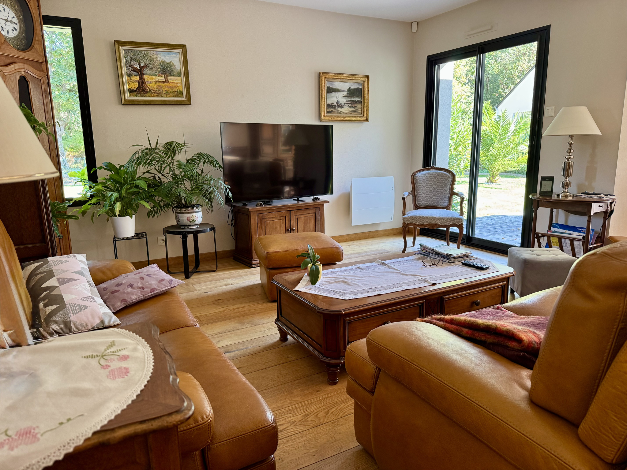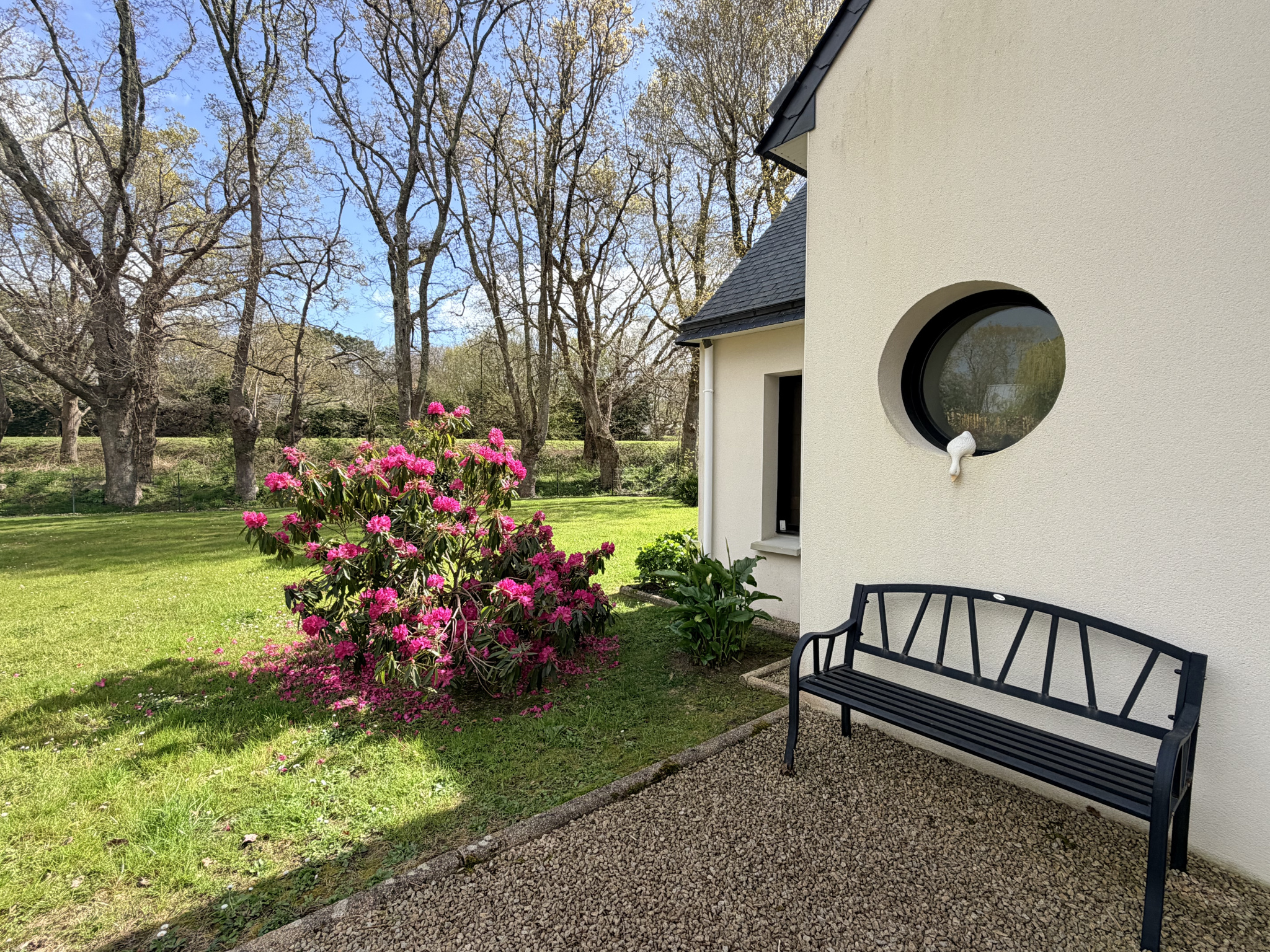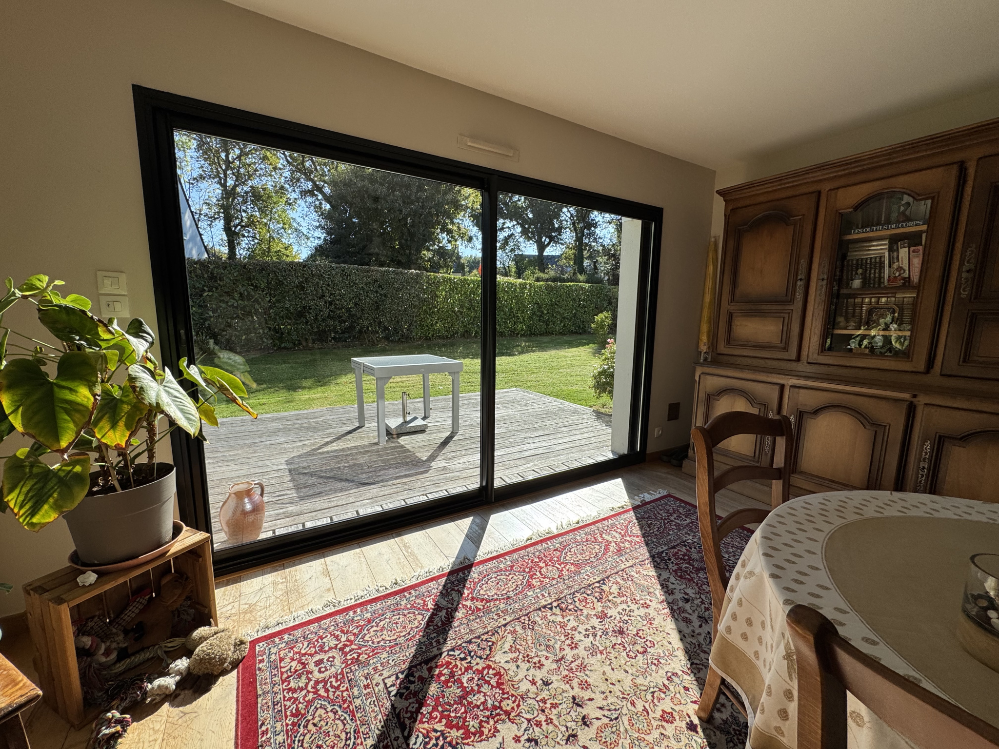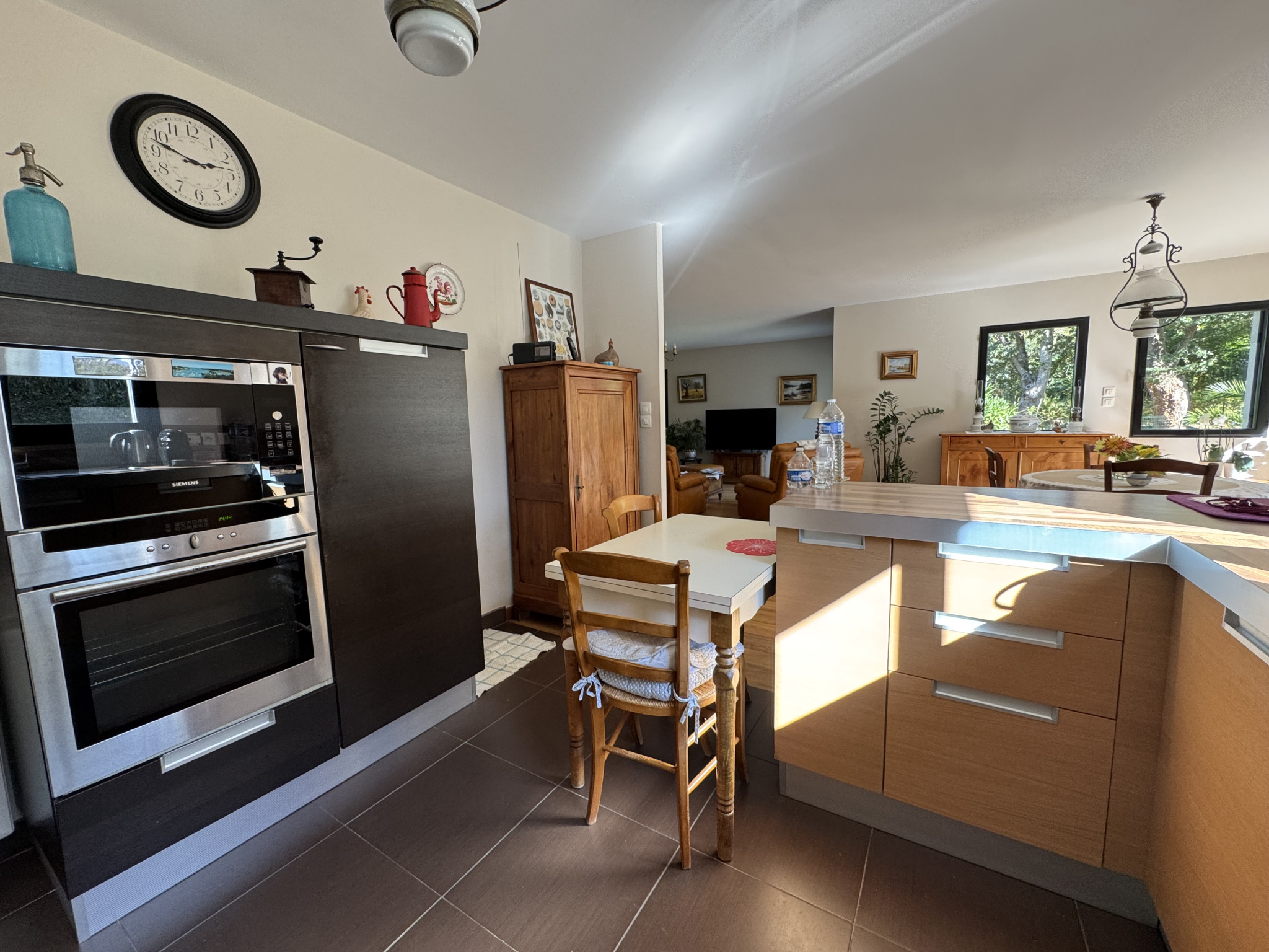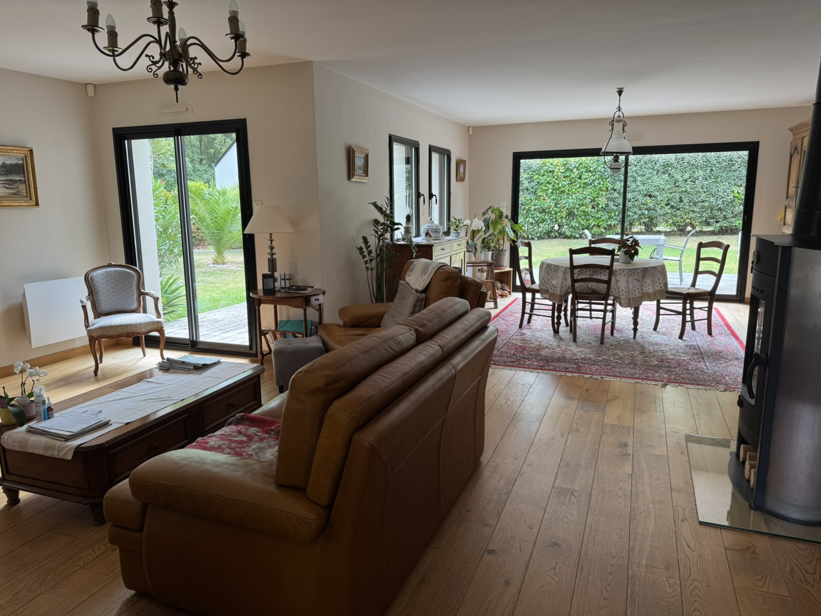 Le rez de chaussée dispose d'un grand séjour de 60 m 2 avec poêle à bois Godin sur parquet massif , buanderie garage et car port pour abriter votre bateau complètenet cette maison familiale.
