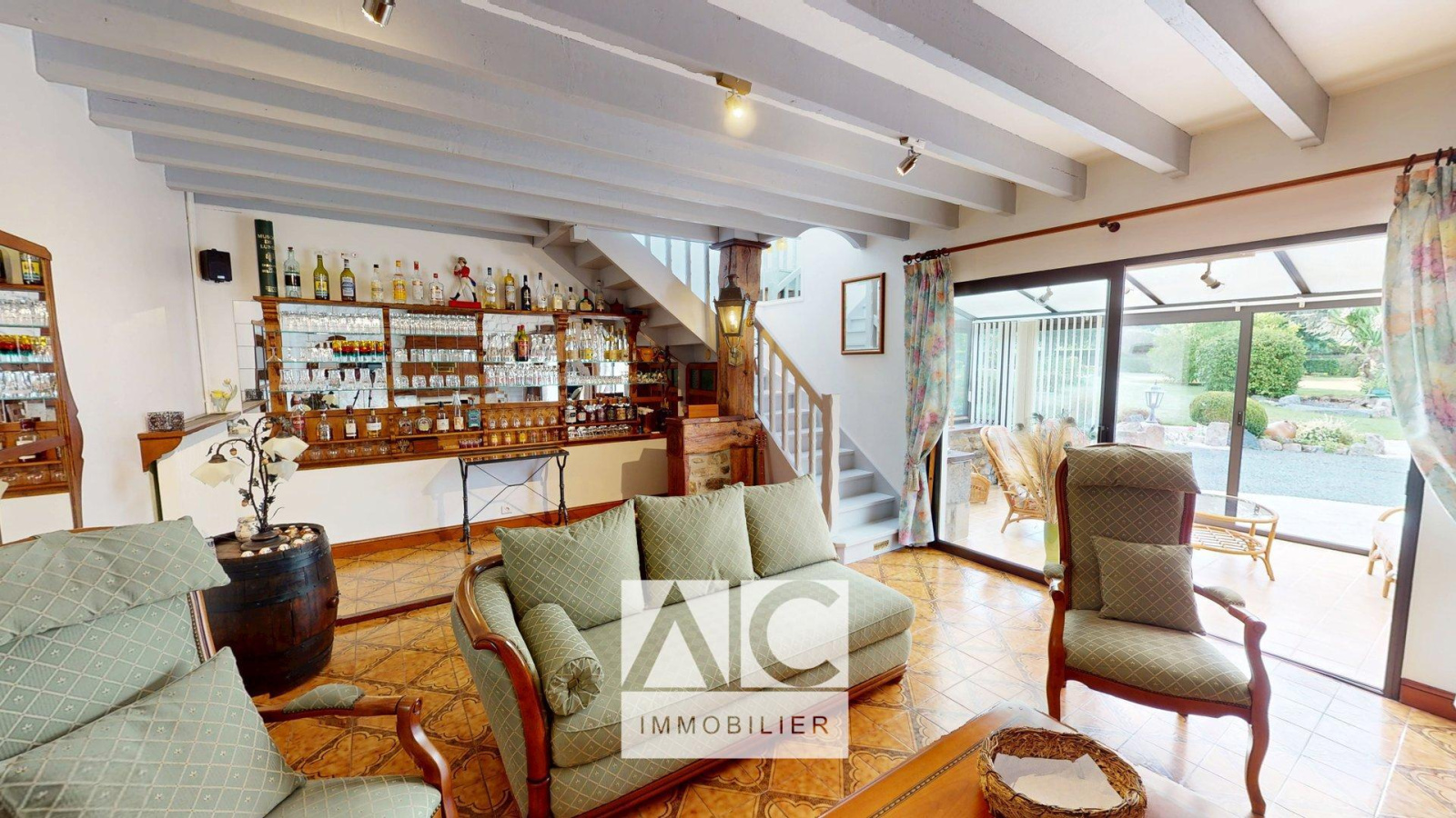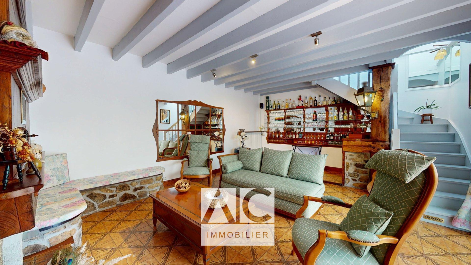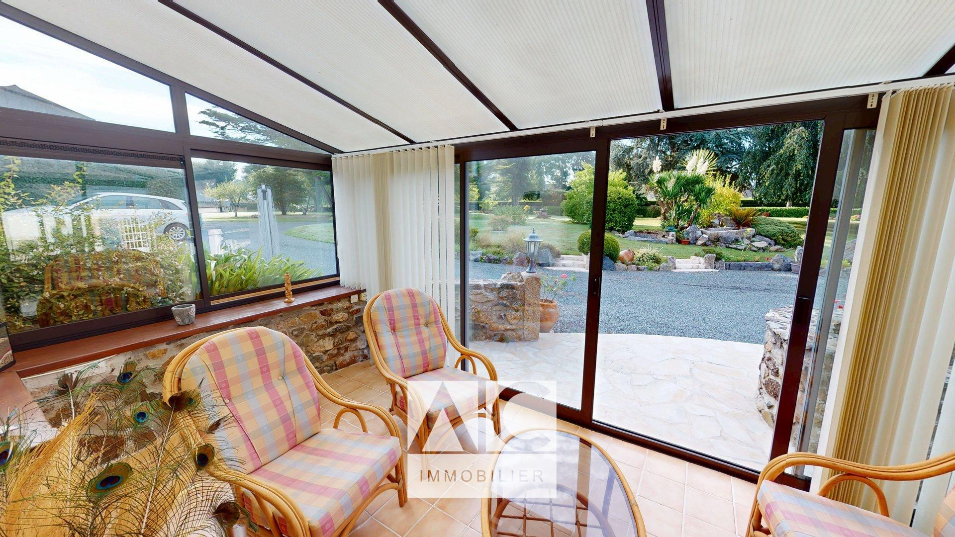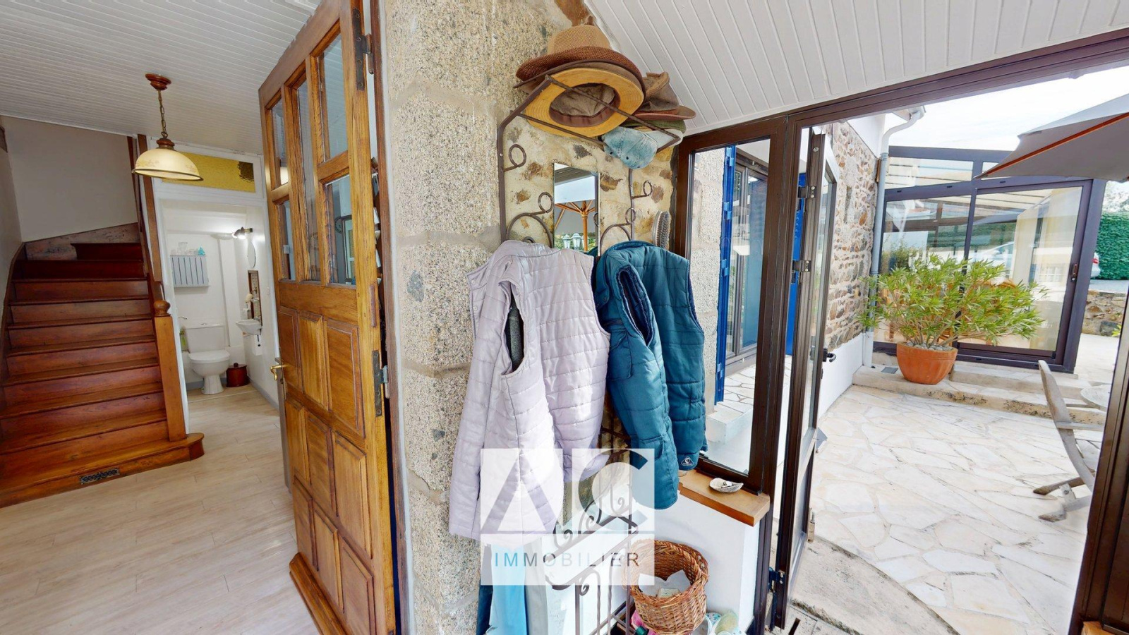 Partie 1 = Entrée / Cuisine / WC / Accès n° 1 sur l'étage par escalier / Séjour avec insert bois à foyer traversant sur un salon / Véranda / Accès n°2 sur l'étage par escalier.