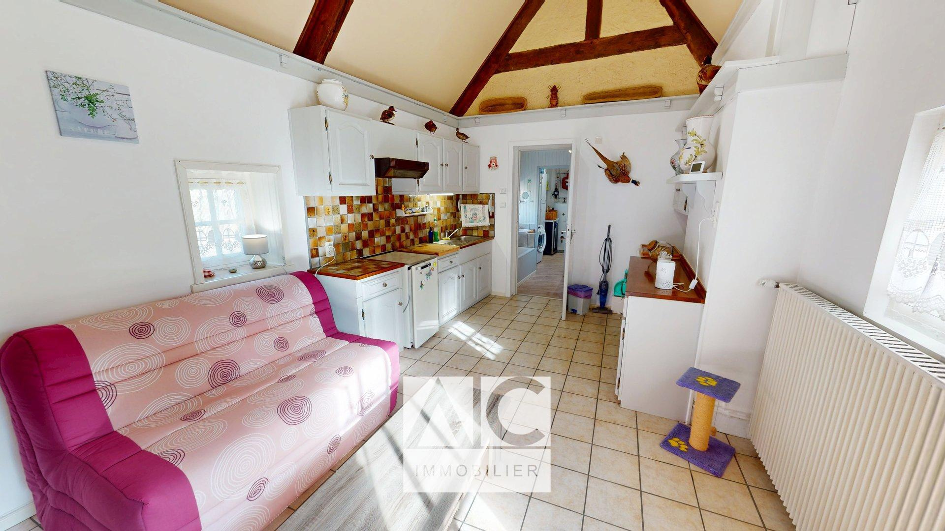 Partie 2 = Buanderie-chaufferie / Salle de bains avec WC / Séjour avec cuisine / Chambre