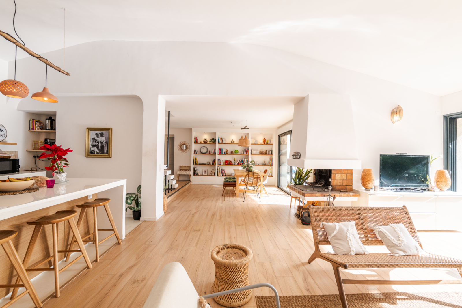 Son espace de vie principal est un bijou ! Le séjour et la salle à manger se partagent la cheminée centrale et la cuisine ouverte, offrant des perspectives au regard qui continuera vers la piscine.