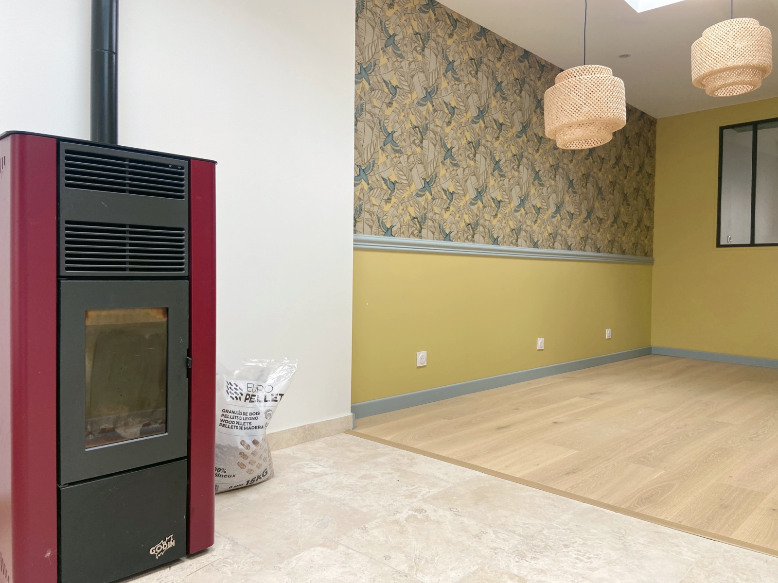 - À l'étage, profitez d'une spacieuse terrasse et d'une pièce à vivre de 55 m² environ, agrémentée d'un poêle à granulés GODIN, idéale pour des moments conviviaux.