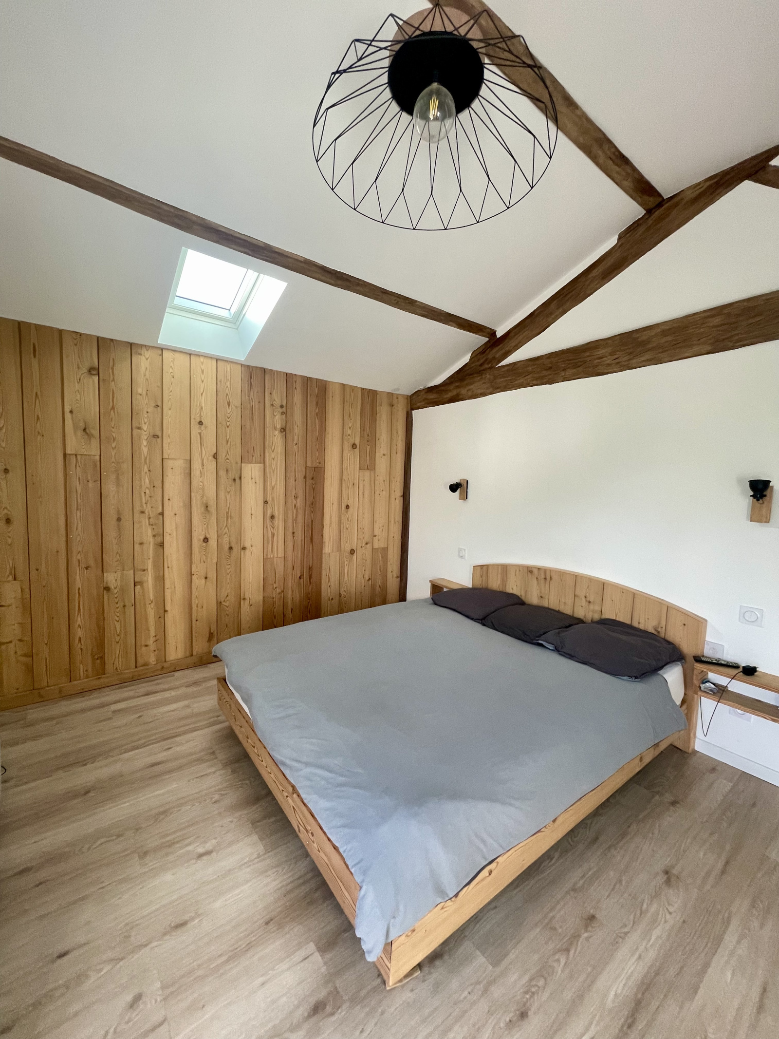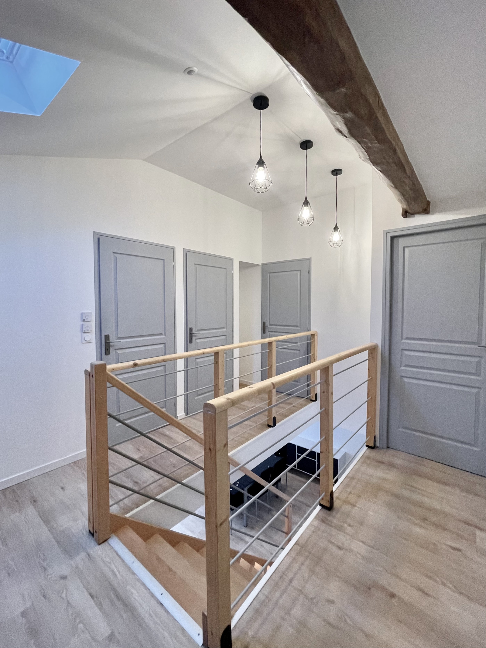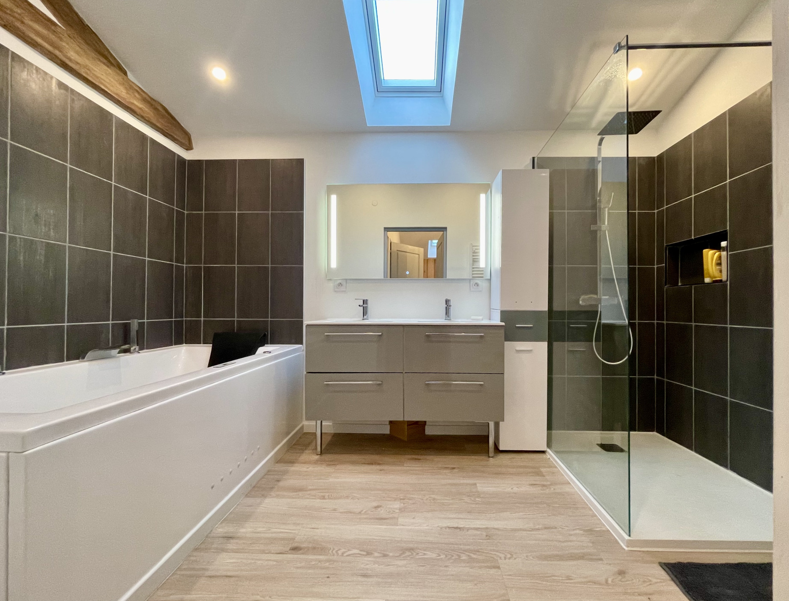 A l’étage, le palier dessert 3 grandes chambres, dont une suite parentale de 22,5 m2 avec salle-d ’eau privative et dressing. Les 2 autres chambres sont également très spacieuses et offrent respectivement 14,4 m2 et 14,2 m2. Pour le confort de chacun, il y a une autre salle de bains neuve avec douche et baignoire balnéo.