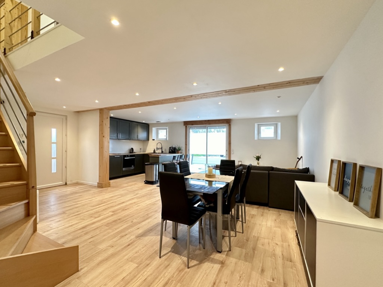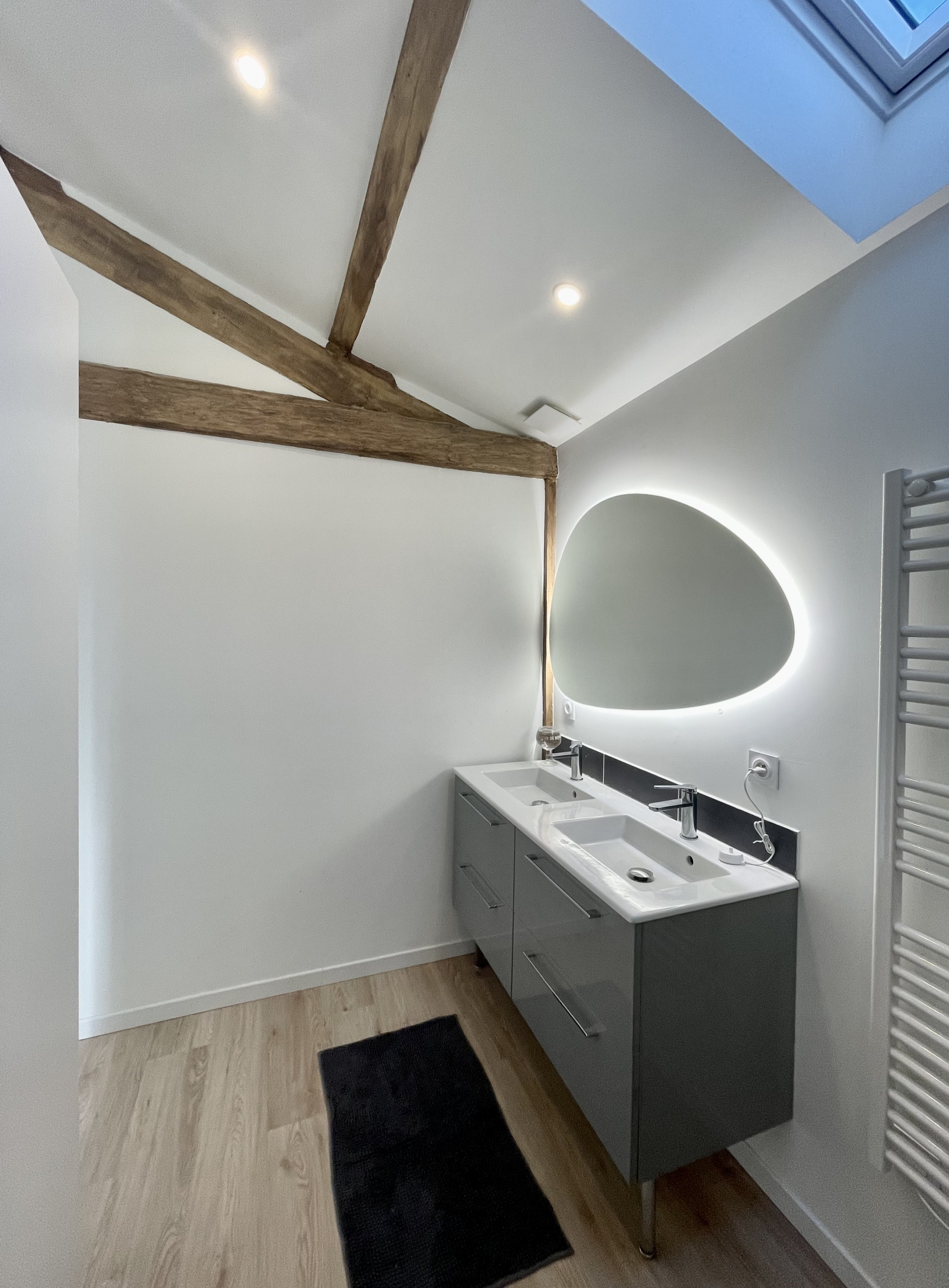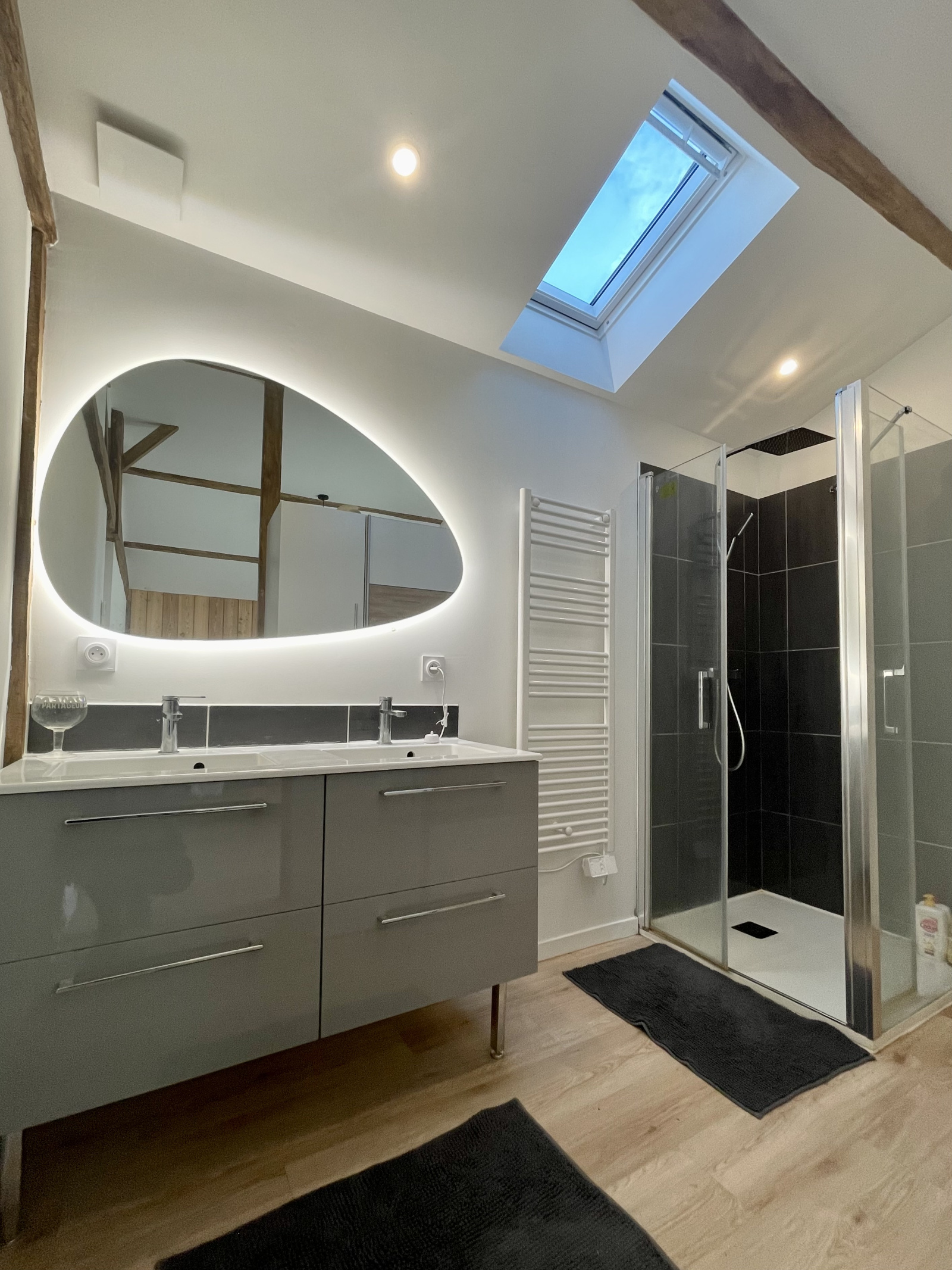 A l’étage, le palier dessert 3 grandes chambres, dont une suite parentale de 22,5 m2 avec salle-d ’eau privative et dressing. Les 2 autres chambres sont également très spacieuses et offrent respectivement 14,4 m2 et 14,2 m2. Pour le confort de chacun, il y a une autre salle de bains neuve avec douche et baignoire balnéo.
