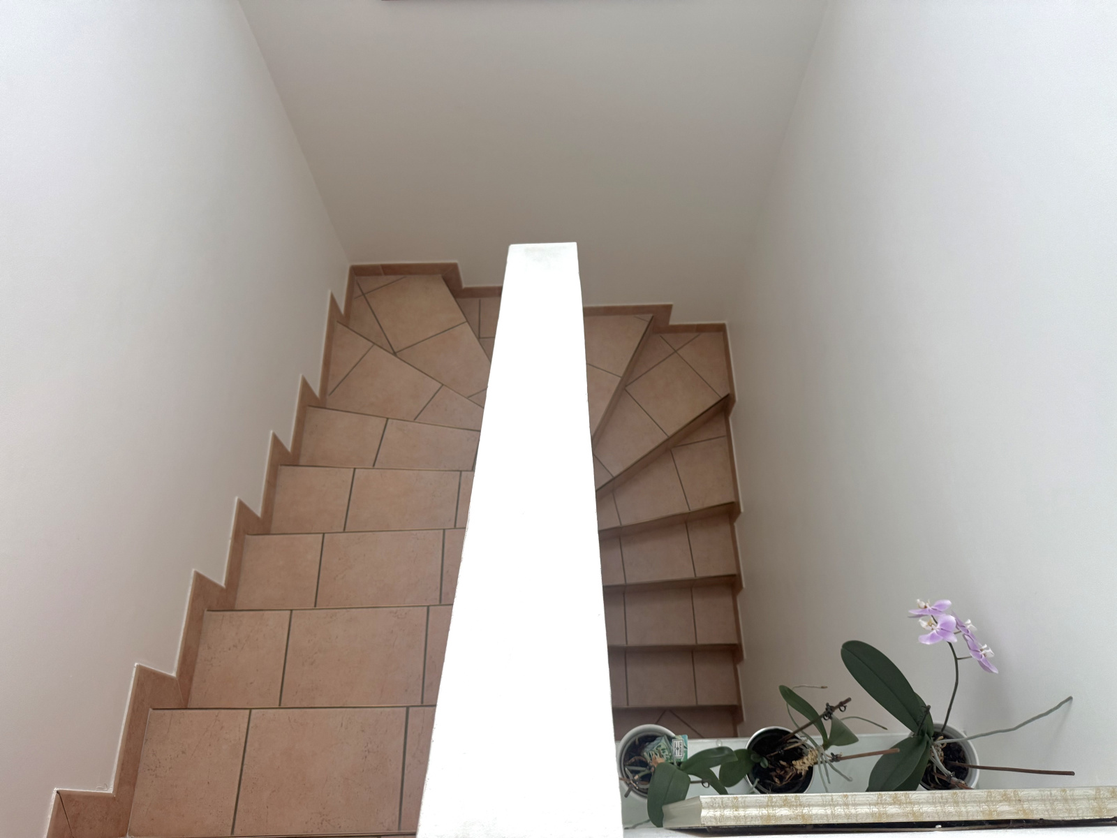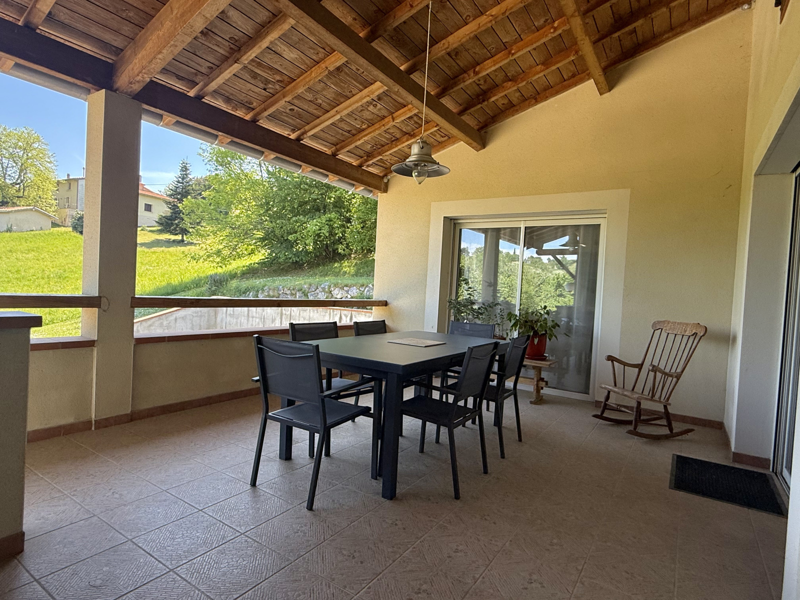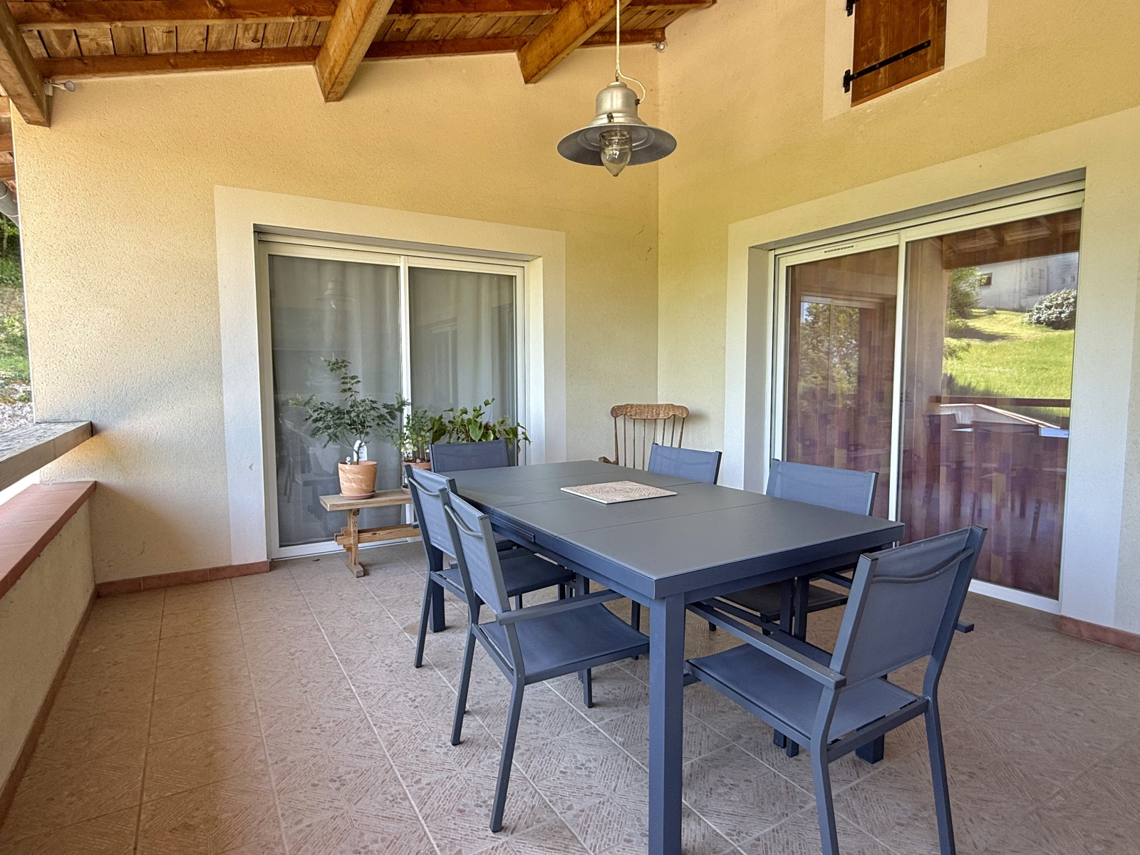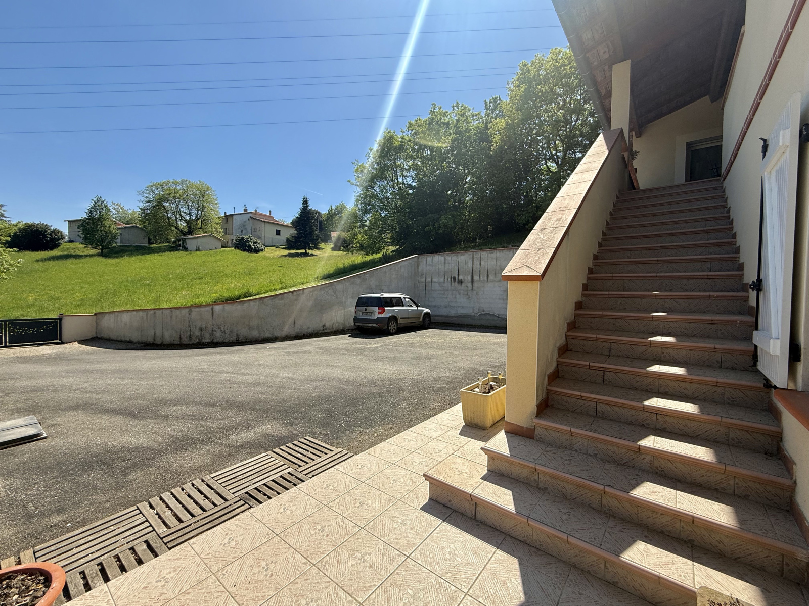 L’accès se fait par un portail électrique avec de nombreuses places de stationnement à l’avant. Un escalier extérieur mène à une terrasse couverte d’environ 25 m², offrant plusieurs accès à la maison, notamment vers la cuisine, le séjour principal par deux baies vitrées, ainsi qu’un accès direct à la chambre principale.
