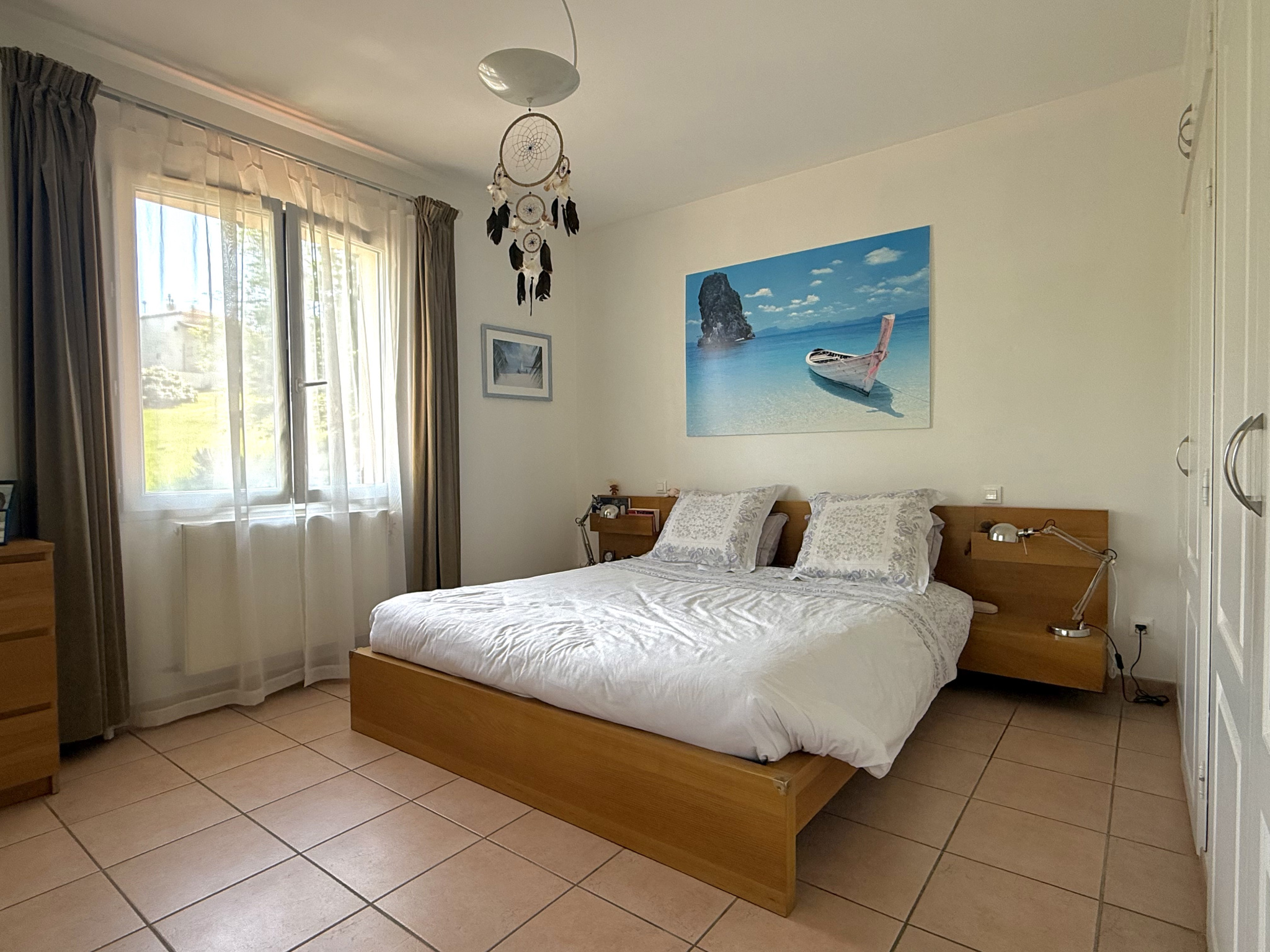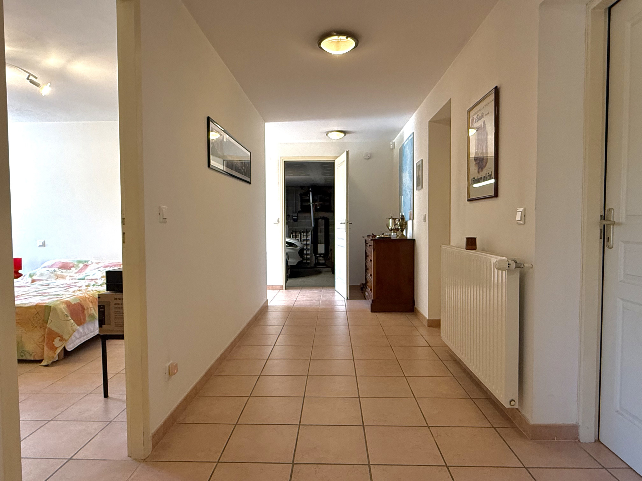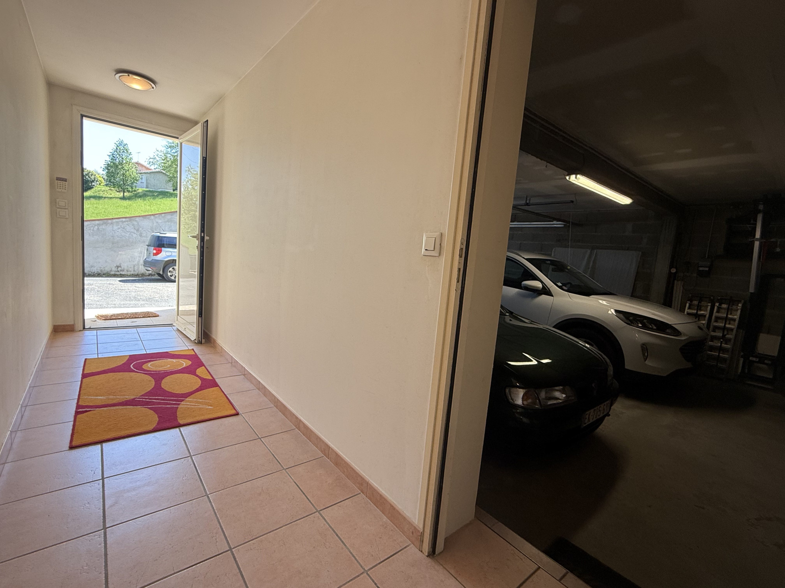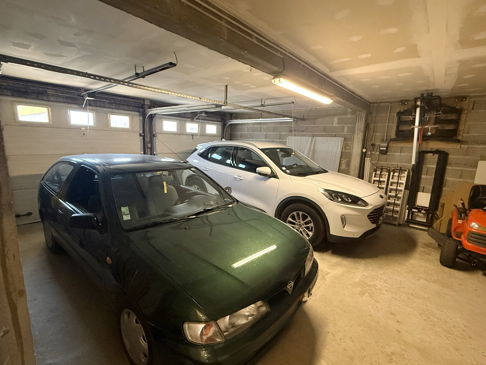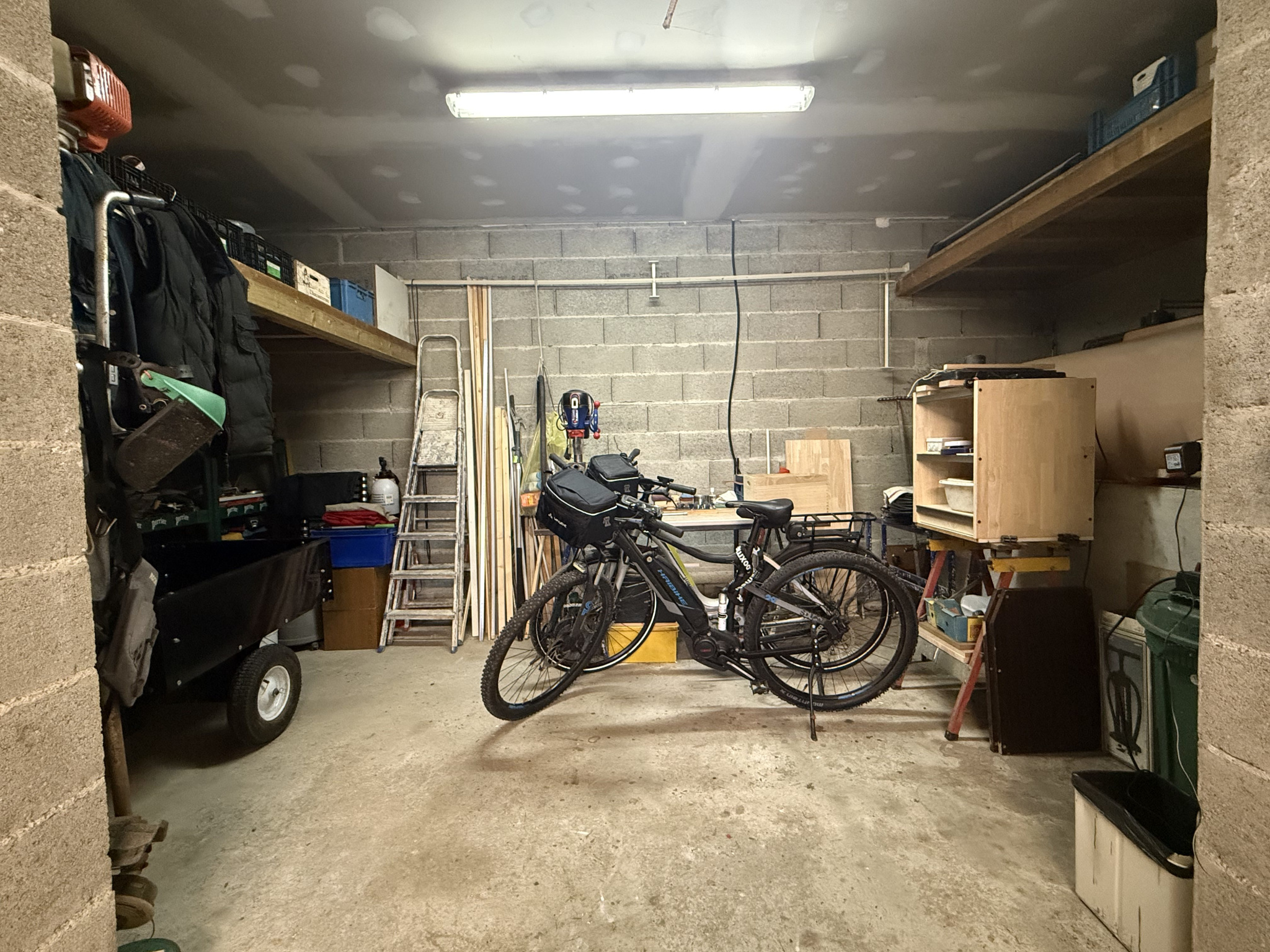 au rez-du-jardin, avec une hauteur sous plafond d’environ 2,30 m, propose trois chambres supplémentaires, une salle d’eau, un WC indépendant, un couloir central et une chaufferie. Un accès secondaire mène directement au parking avant, permettant un usage indépendant de ce niveau si souhaité. Un accès intérieur conduit également à un double garage avec portes automatiques et à un espace atelier avec cuve à fioul.