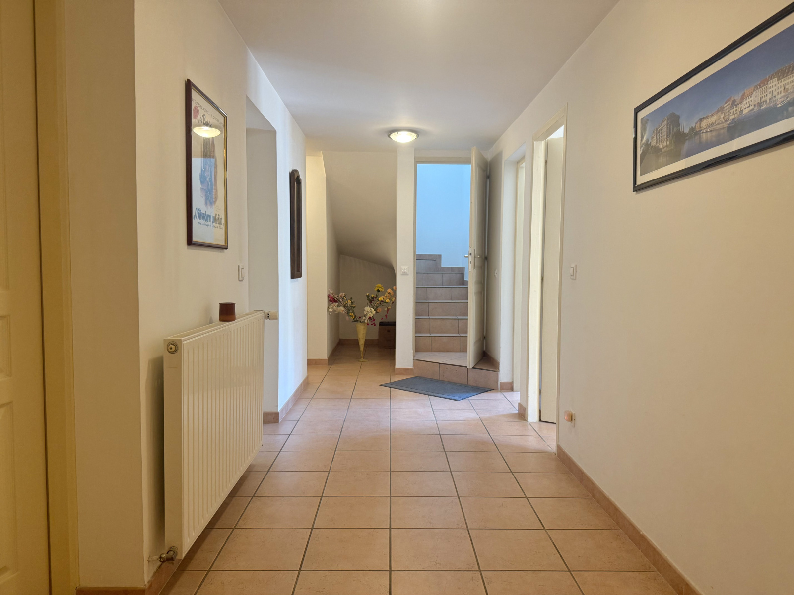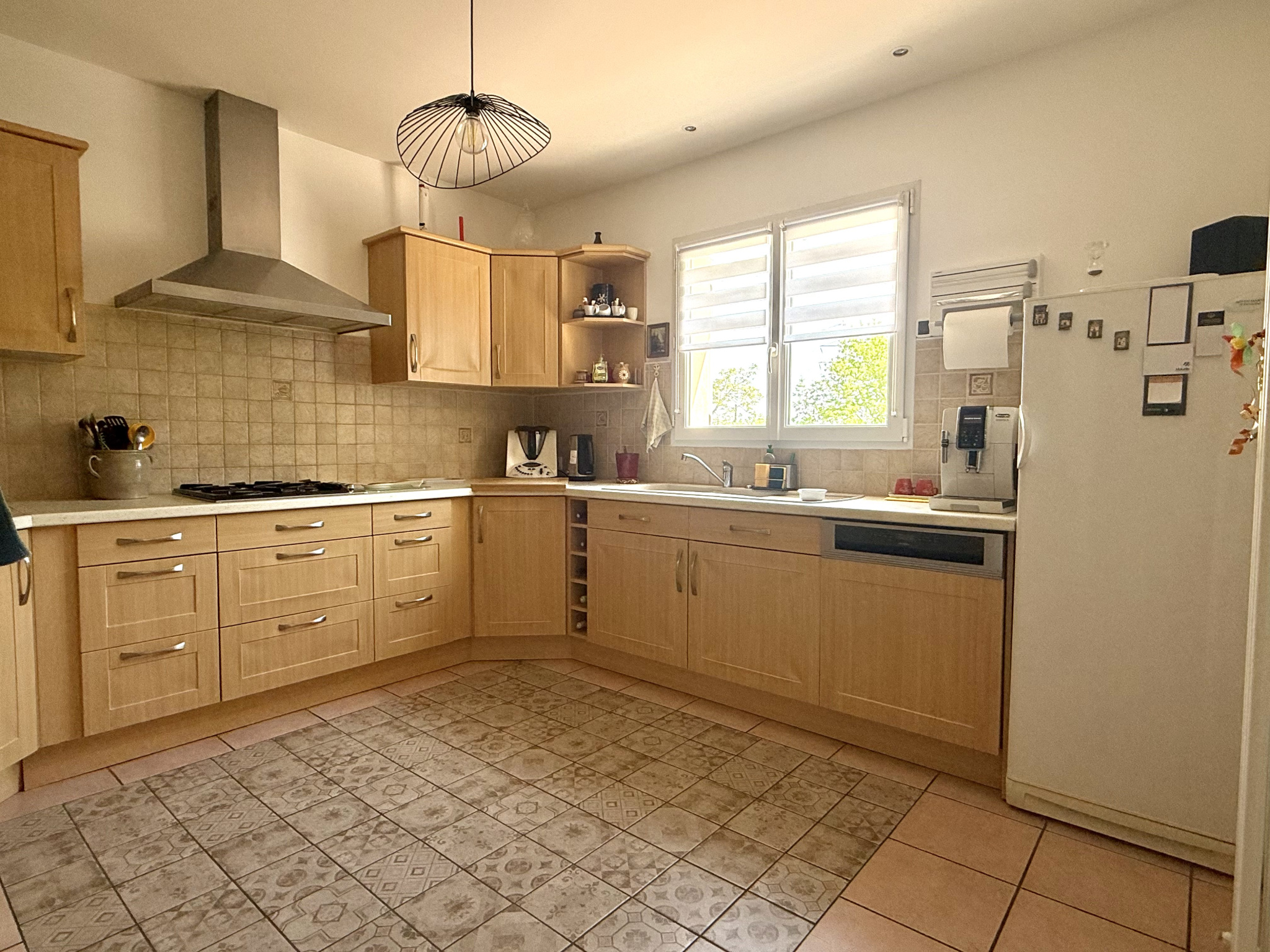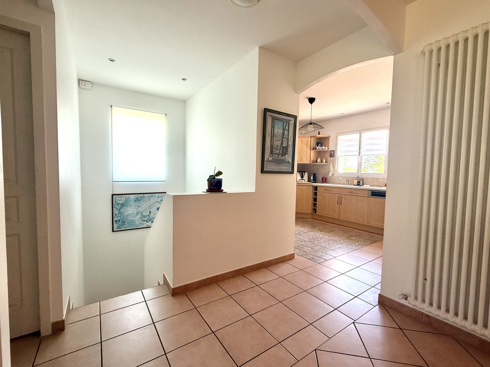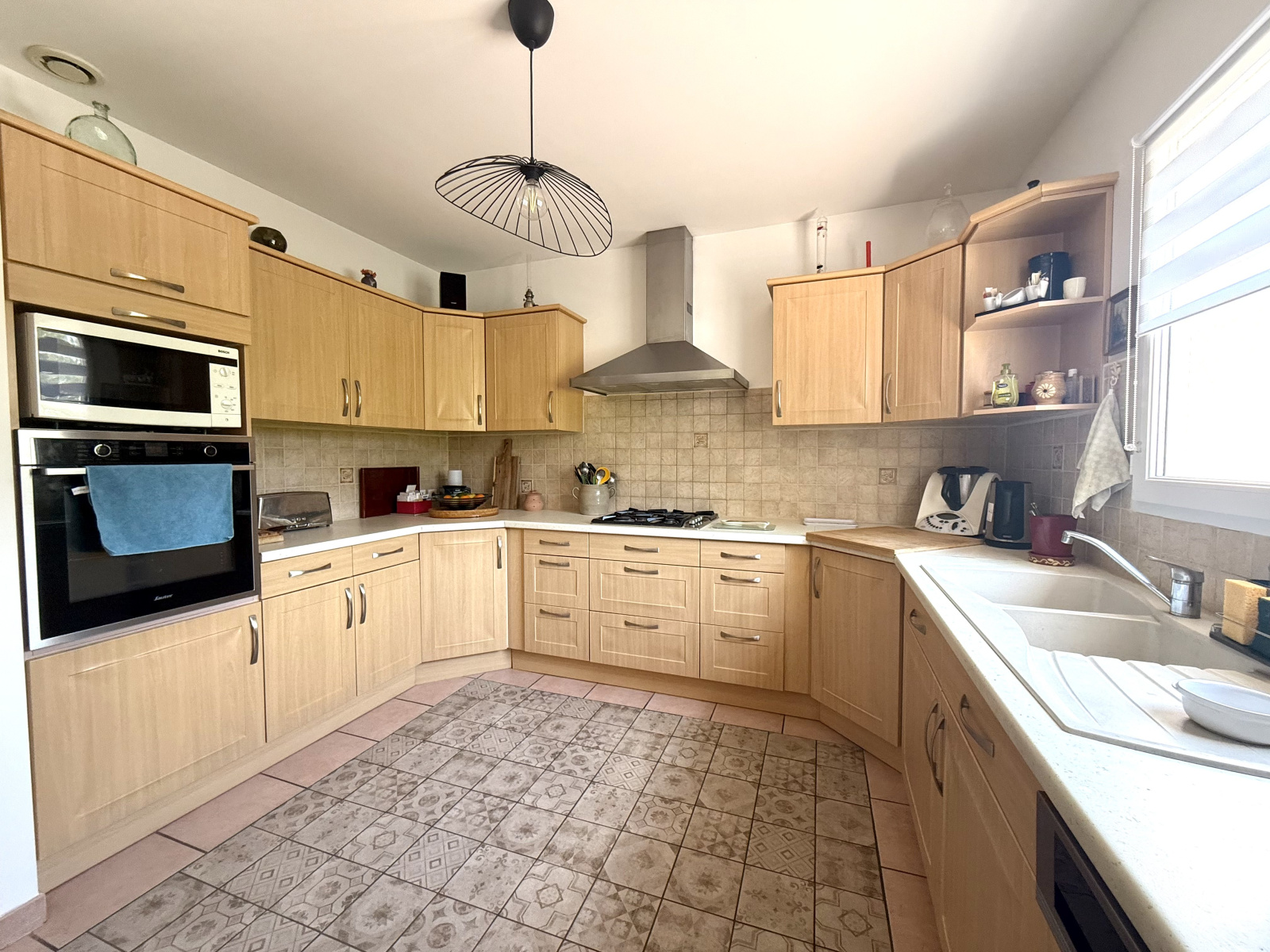Le niveau principal comprend une cuisine entièrement équipée de 11 m² avec une fenêtre au-dessus de l’évier donnant sur l’allée d’entrée. Un couloir dessert un dressing avec placards intégrés, une buanderie fonctionnelle, ainsi qu’un escalier menant au sous-sol. L’espace de vie se compose d’un grand séjour/salle à manger ouvert de plus de 42 m², lumineux grâce aux baies vitrées situées de part et d’autre.