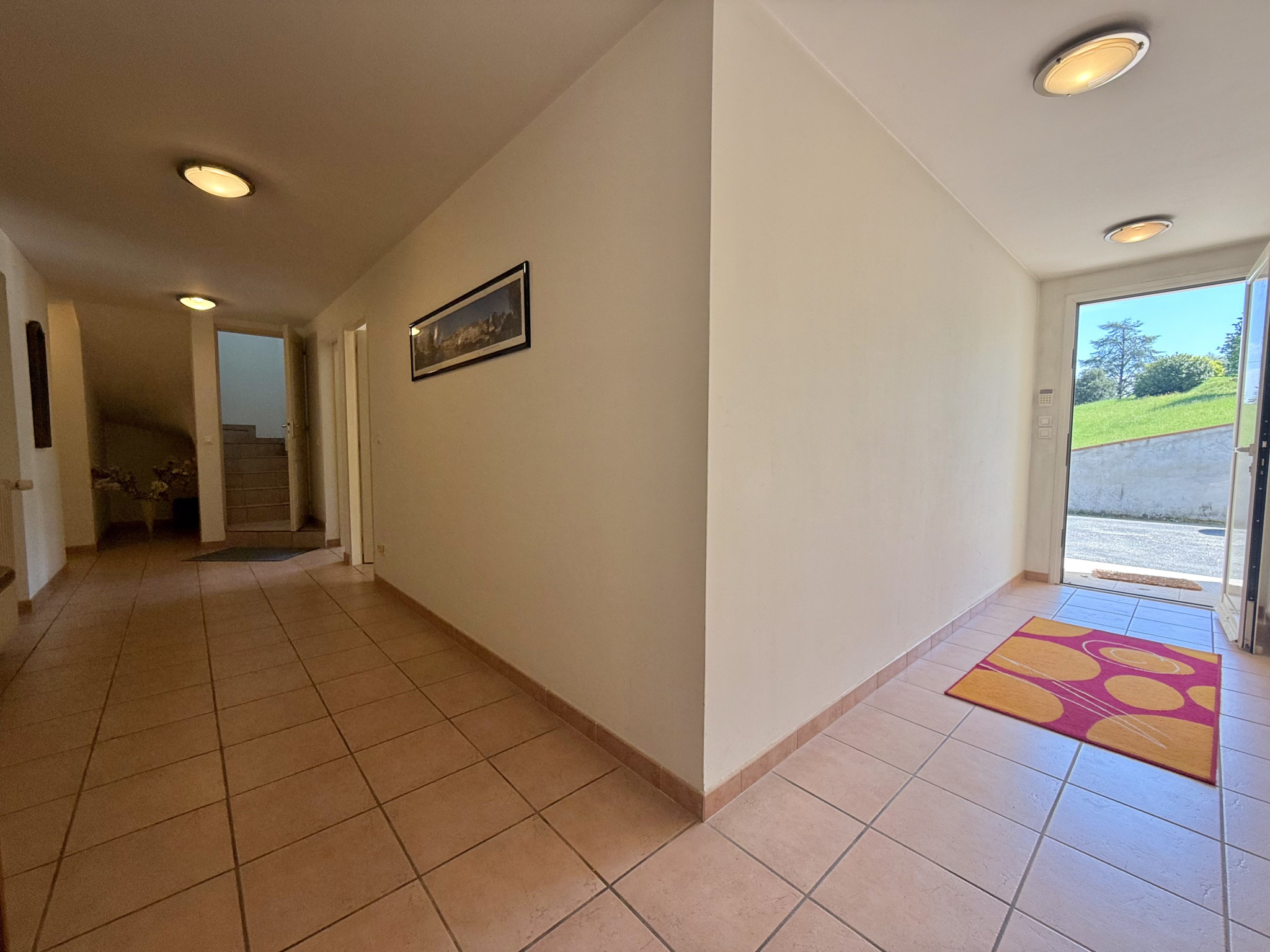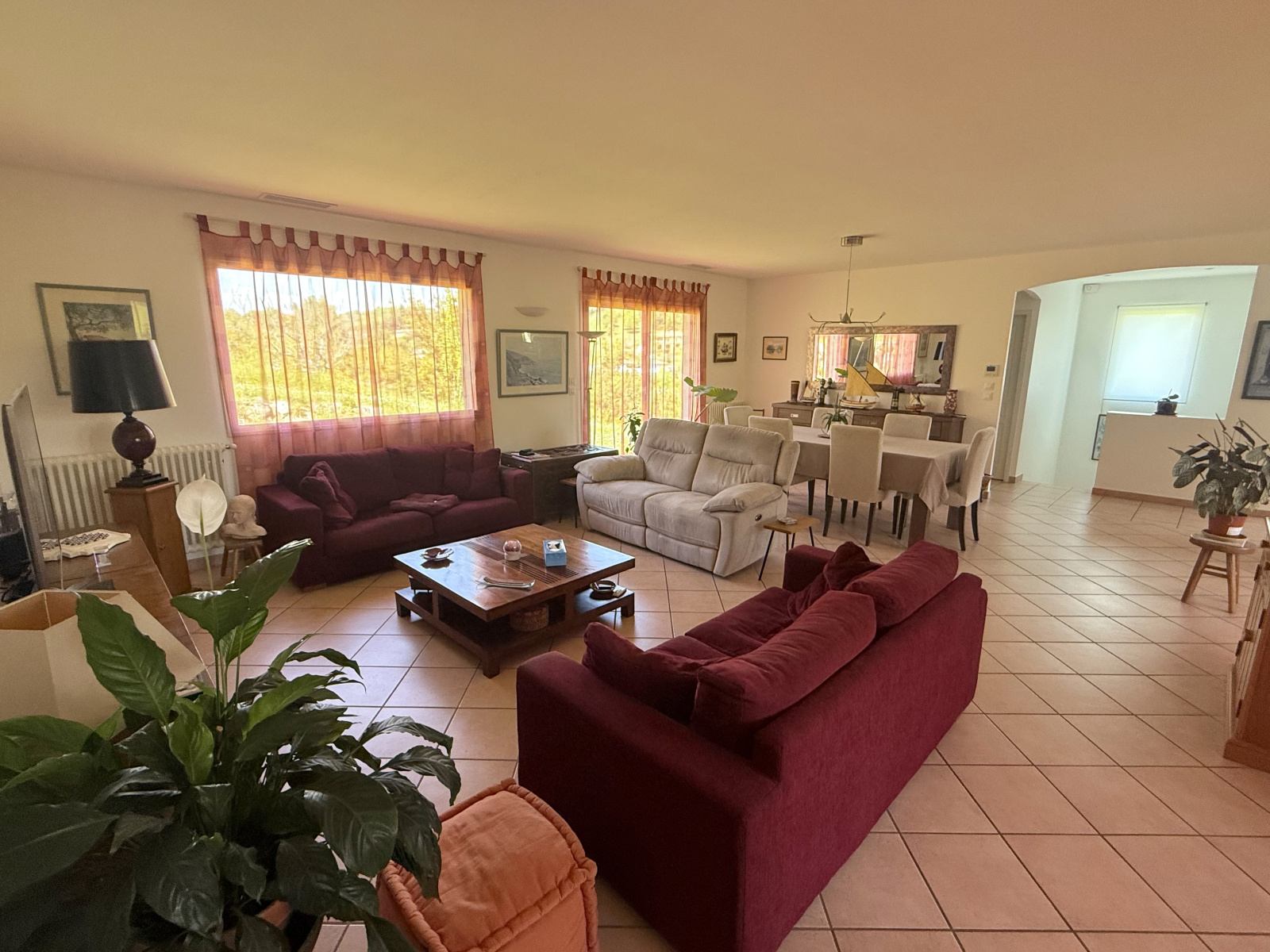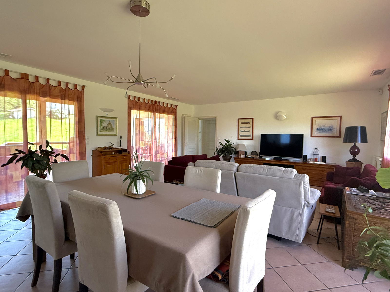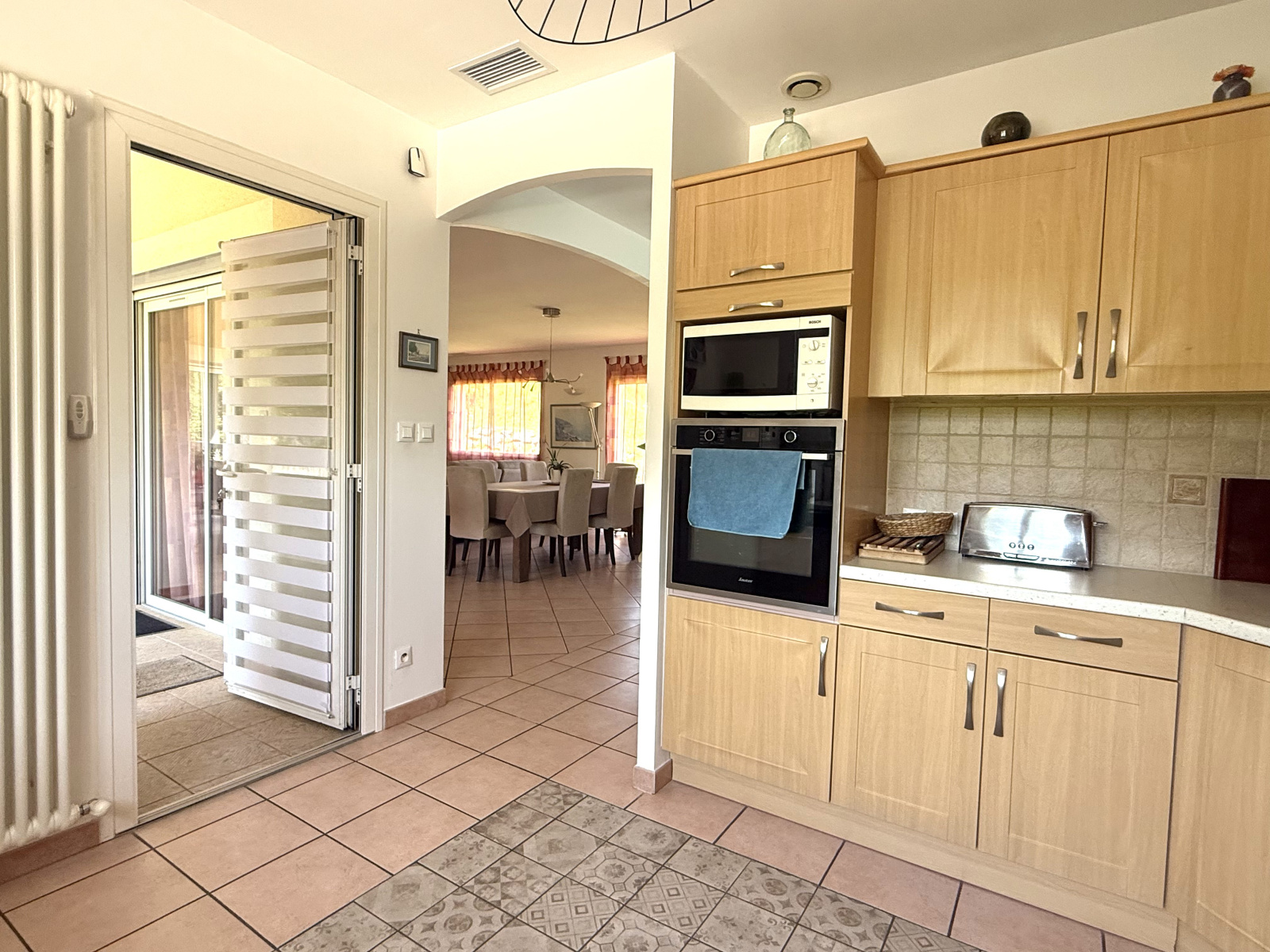 Le niveau principal comprend une cuisine entièrement équipée de 11 m² avec une fenêtre au-dessus de l’évier donnant sur l’allée d’entrée. Un couloir dessert un dressing avec placards intégrés, une buanderie fonctionnelle, ainsi qu’un escalier menant au sous-sol. L’espace de vie se compose d’un grand séjour/salle à manger ouvert de plus de 42 m², lumineux grâce aux baies vitrées situées de part et d’autre.