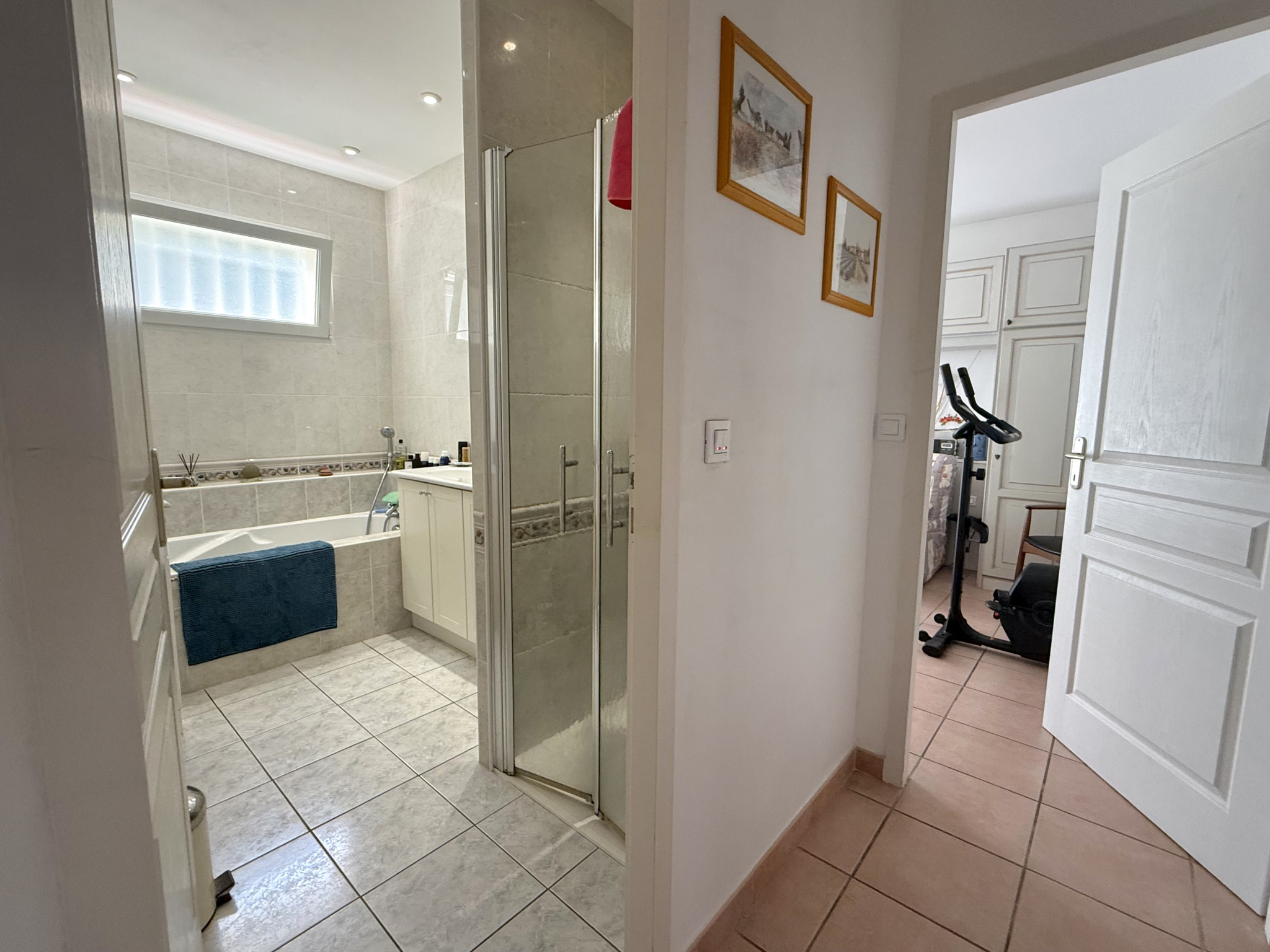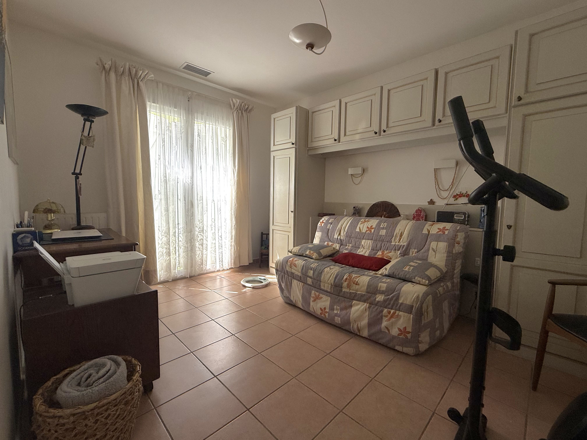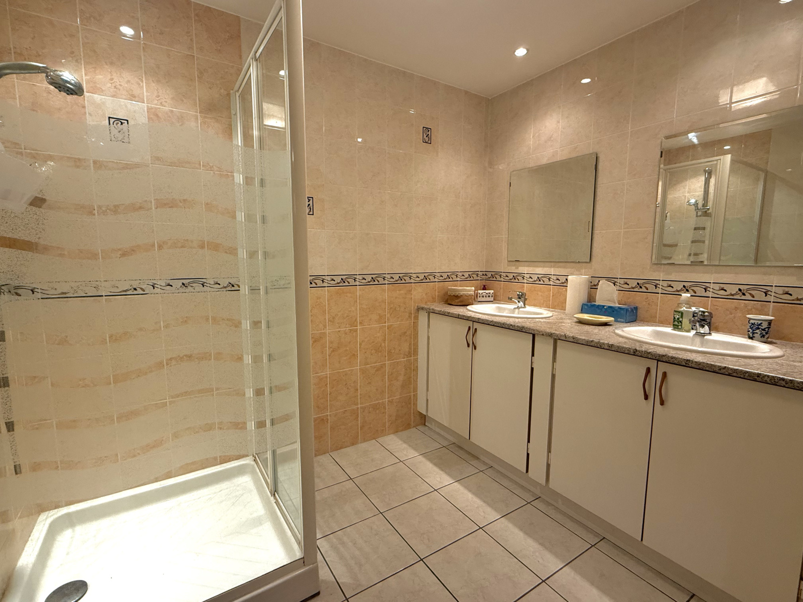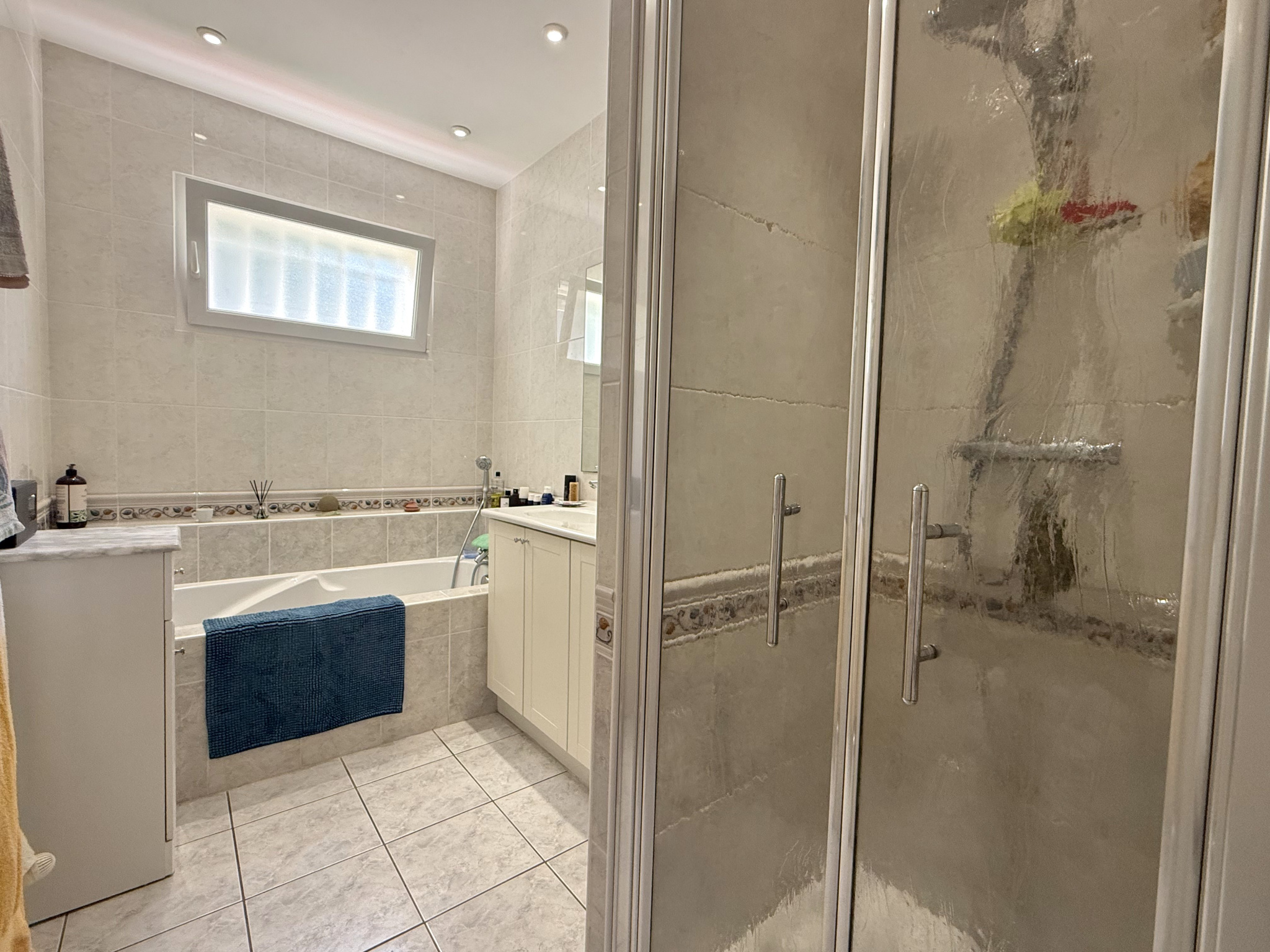 Ce niveau dispose de deux chambres : une chambre de 16 m² côté façade avec accès direct à la terrasse, et une seconde chambre de 12,5 m² actuellement utilisée comme bureau et salle de sport. Une salle de bain avec baignoire et douche séparée, ainsi qu’un WC indépendant avec lave-mains, complètent cet étage.