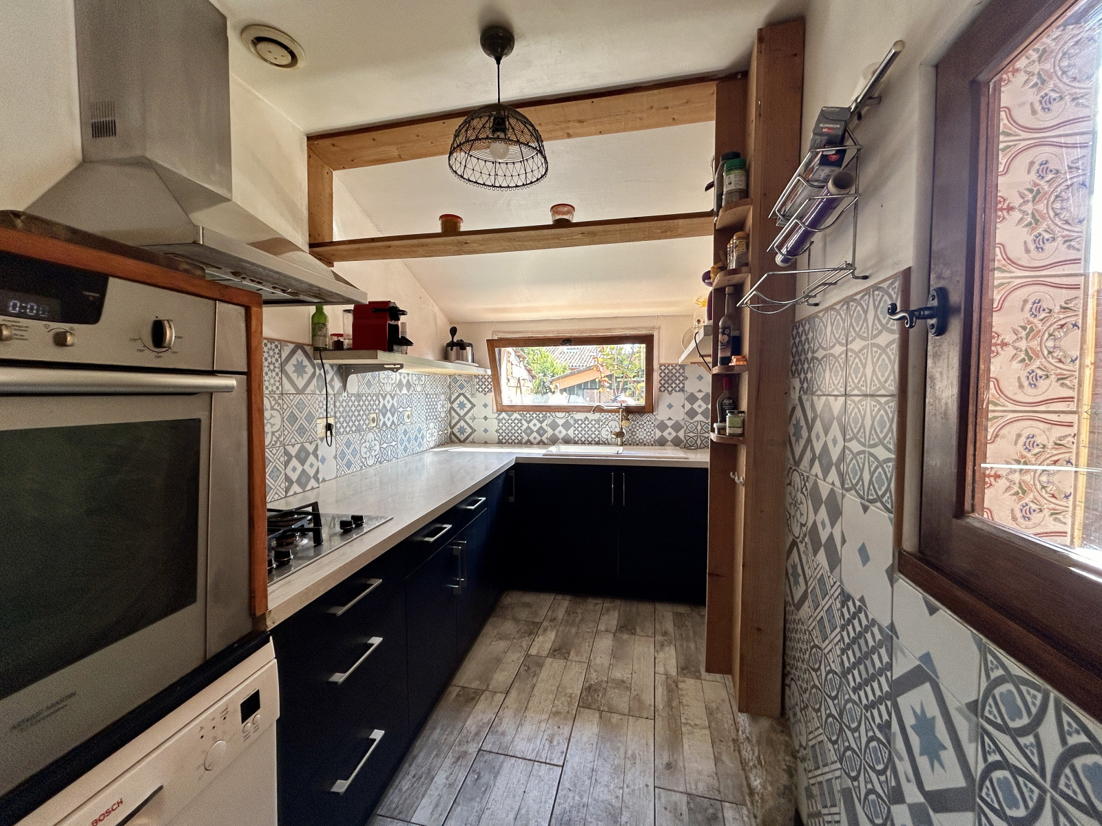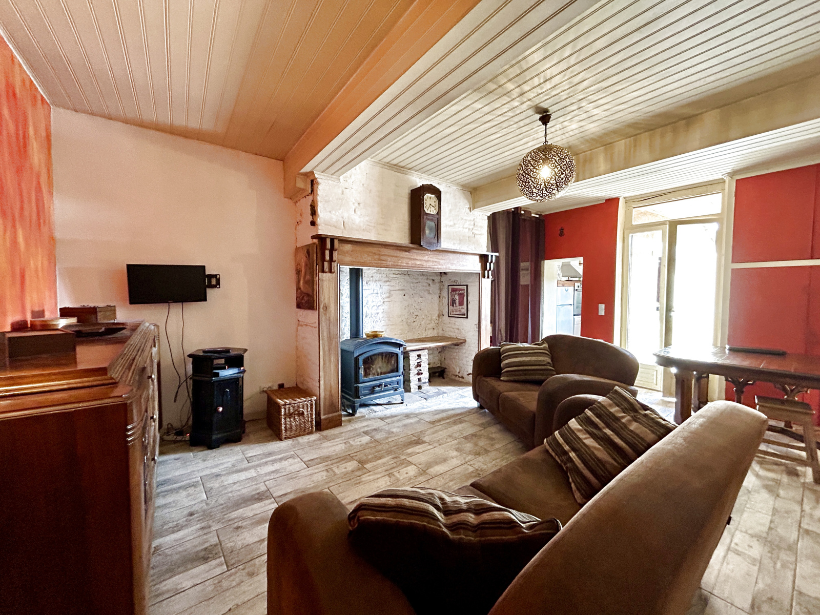Au rez de chaussée, le long couloir dessert une chambre de 12 m2, une buanderie avec wc, le salon avec son poêle à bois et la cuisine donnant sur le jardin.
