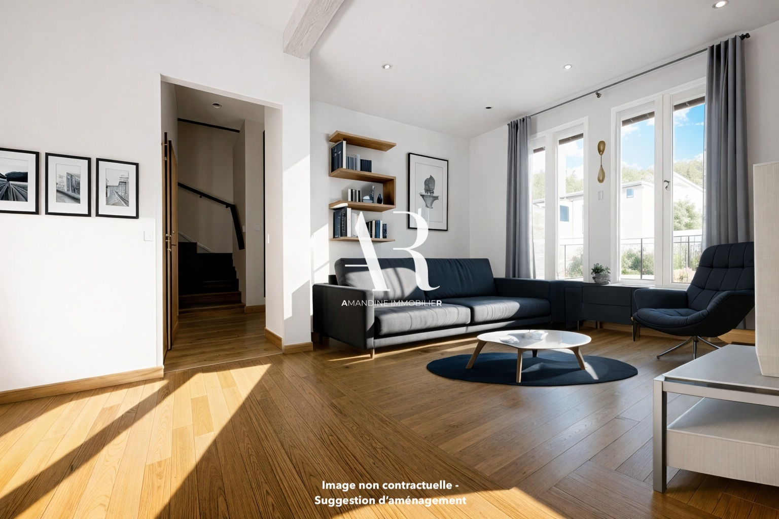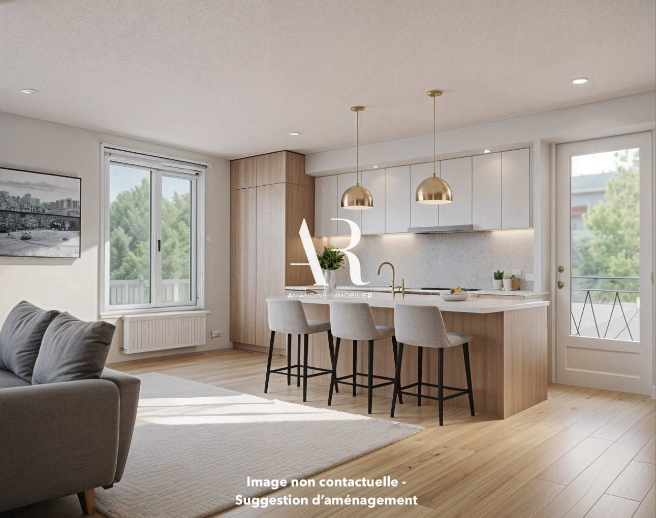 Au rez-de-chaussée, un séjour agréable de 24 m², baigné de lumière, ainsi qu'une cuisine indépendante entièrement équipée. Celle-ci s'ouvre directement sur une terrasse et un jardin intimiste, parfaits pour les repas en extérieur et les moments de détente.