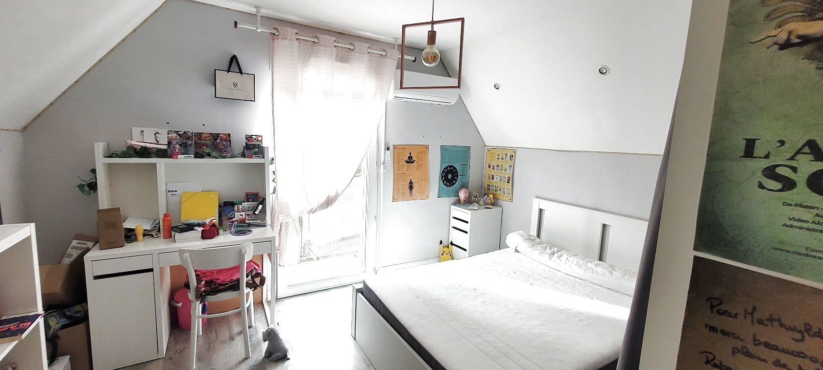 Elle dispose d'une entrée, un salon avec insert bois et distribution de chaleur , une cuisine semi-équipée, une véranda en alu de 20 m² et une salle d'eau , une toilette indépendante sur ce premier niveau en semi-rez-de-chaussée . Au premier étage trois chambres , un bureau, une toilette,étage climatisé .