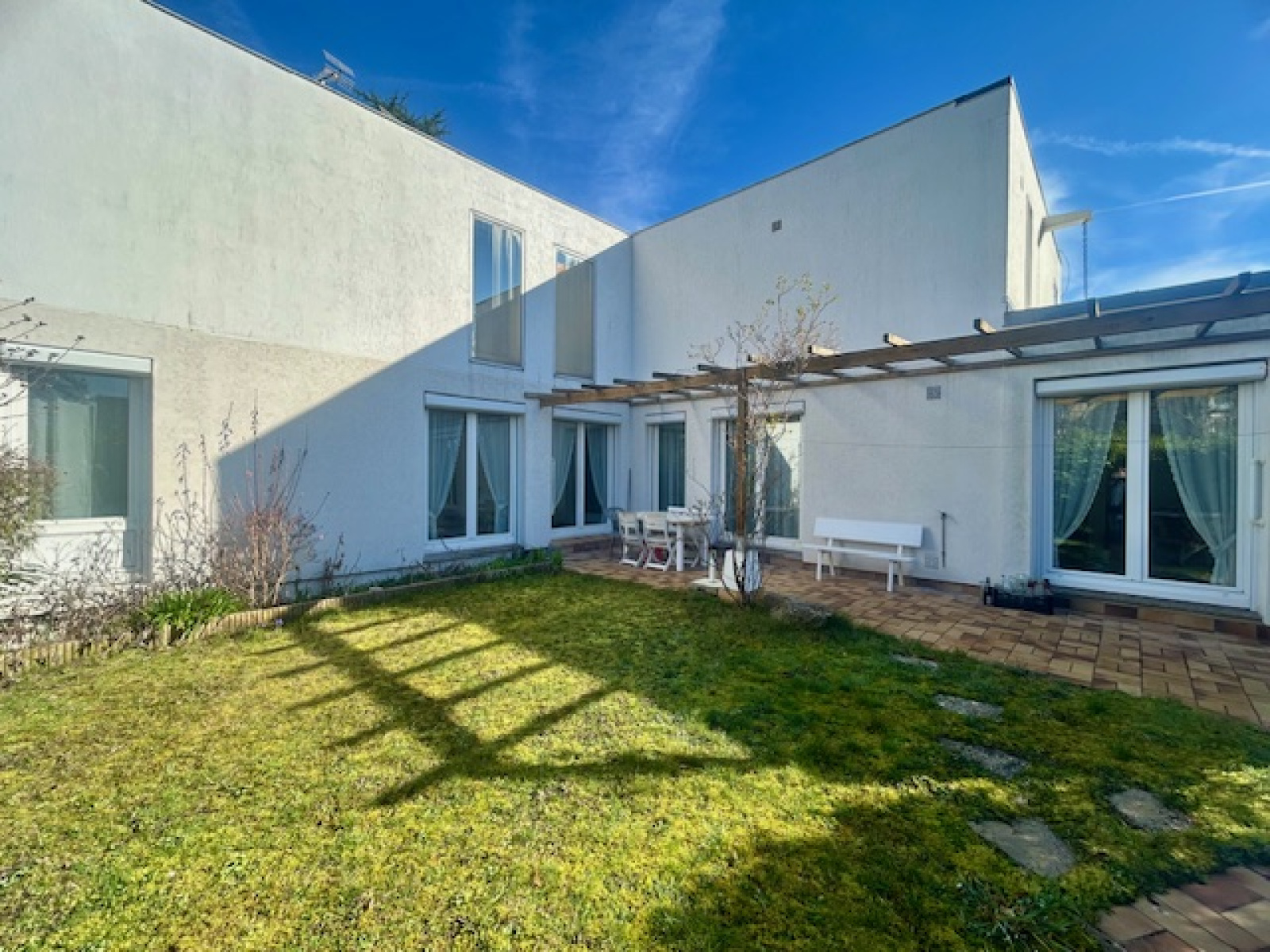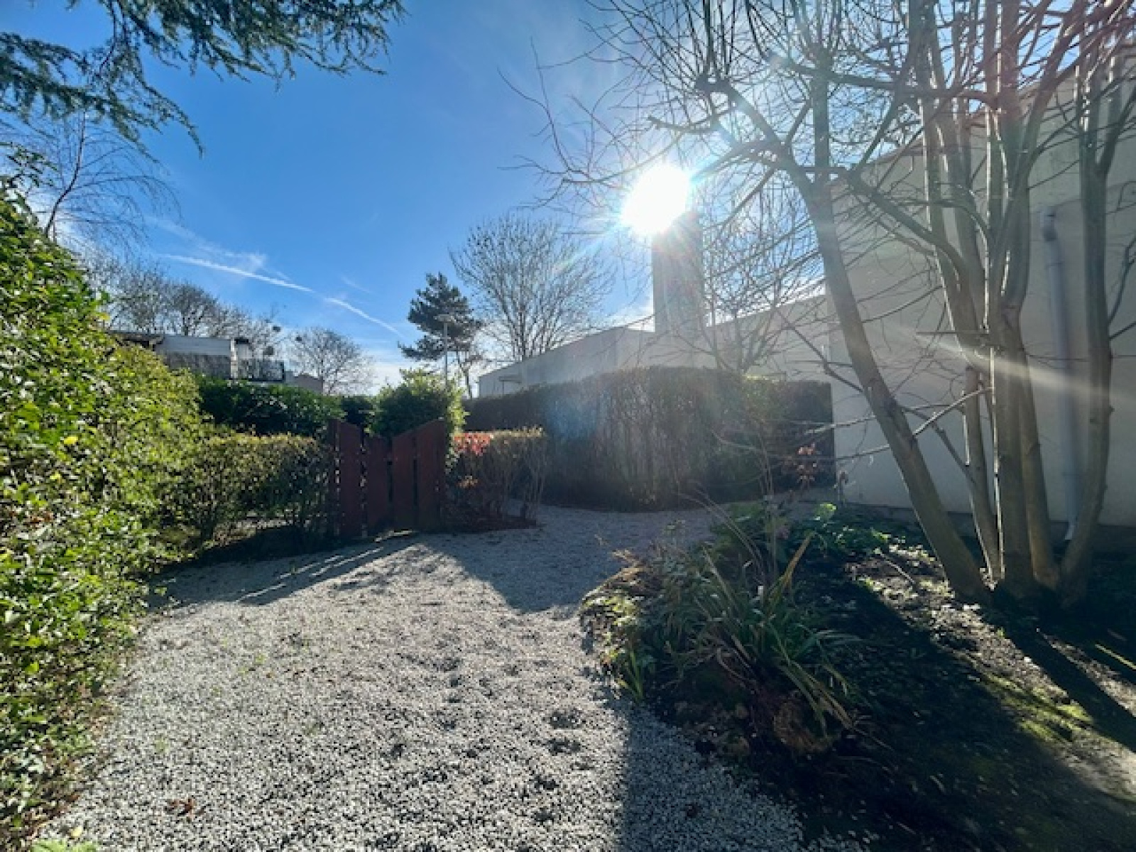 Elle se compose de deux jardinets : le premier se situe à l’avant et est accessible par un portillon donnant sur l’extérieur. Le second (principal) se situe à l’arrière, dispose d’une terrasse et propose un accès direct de la pièce de vie.