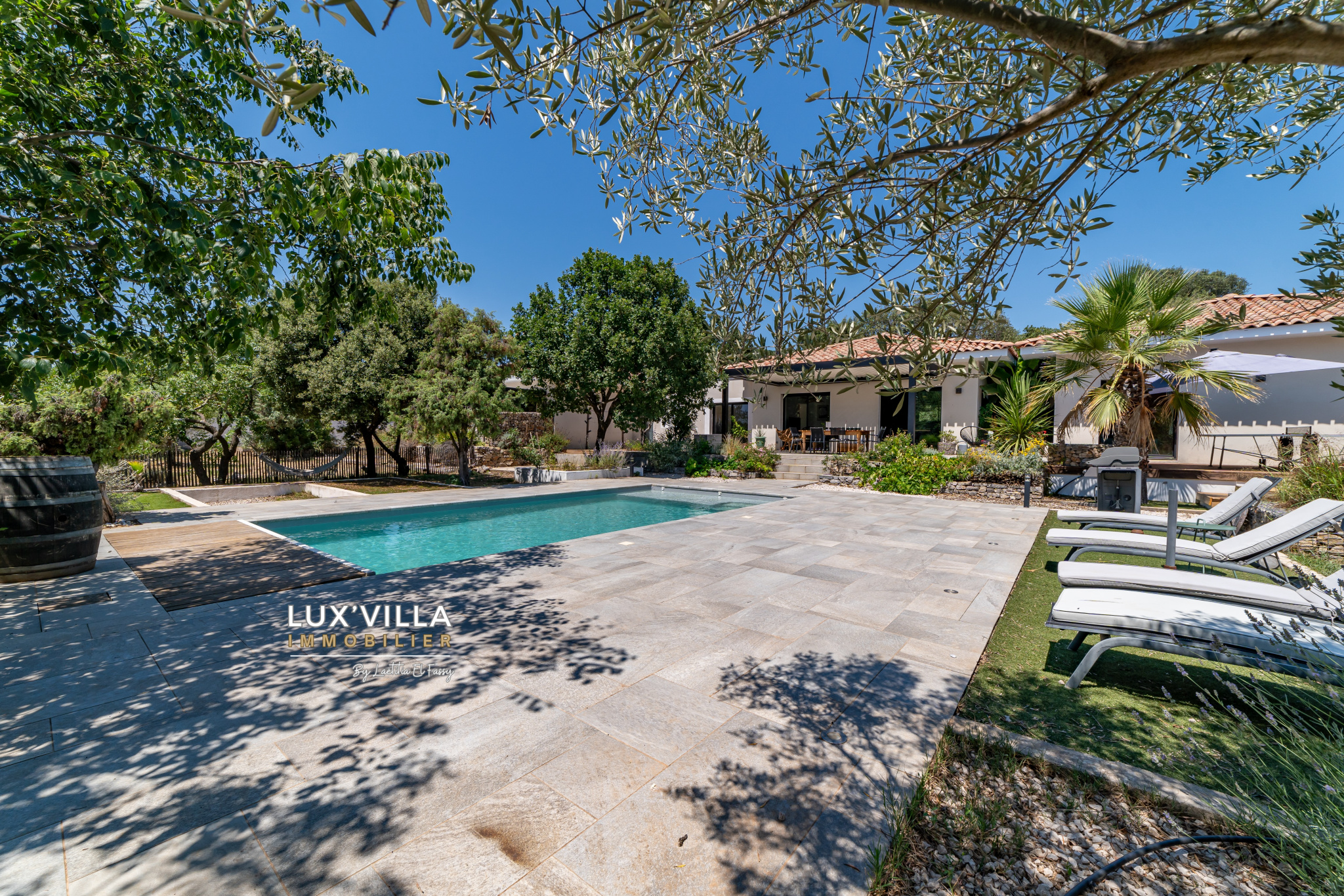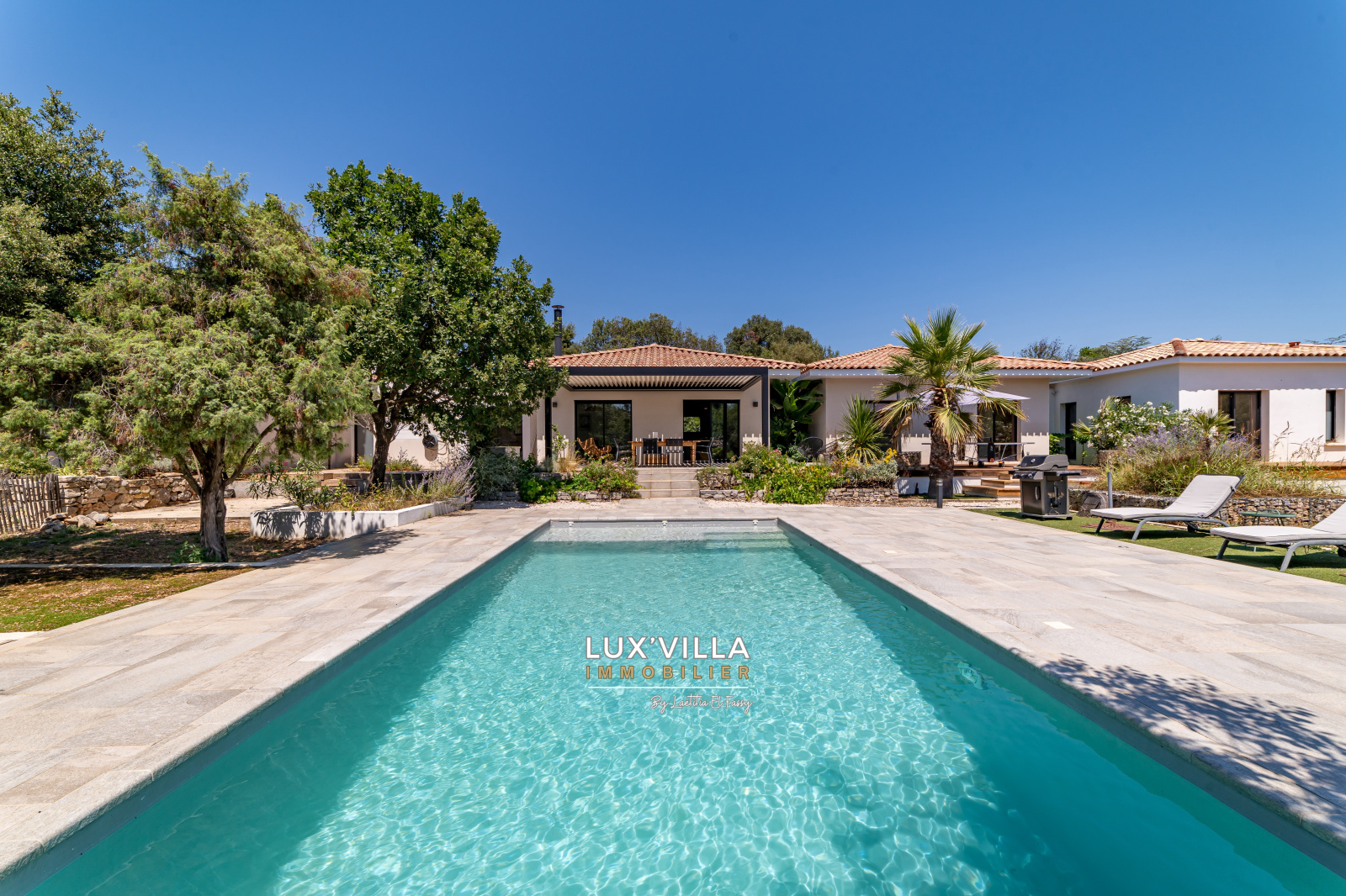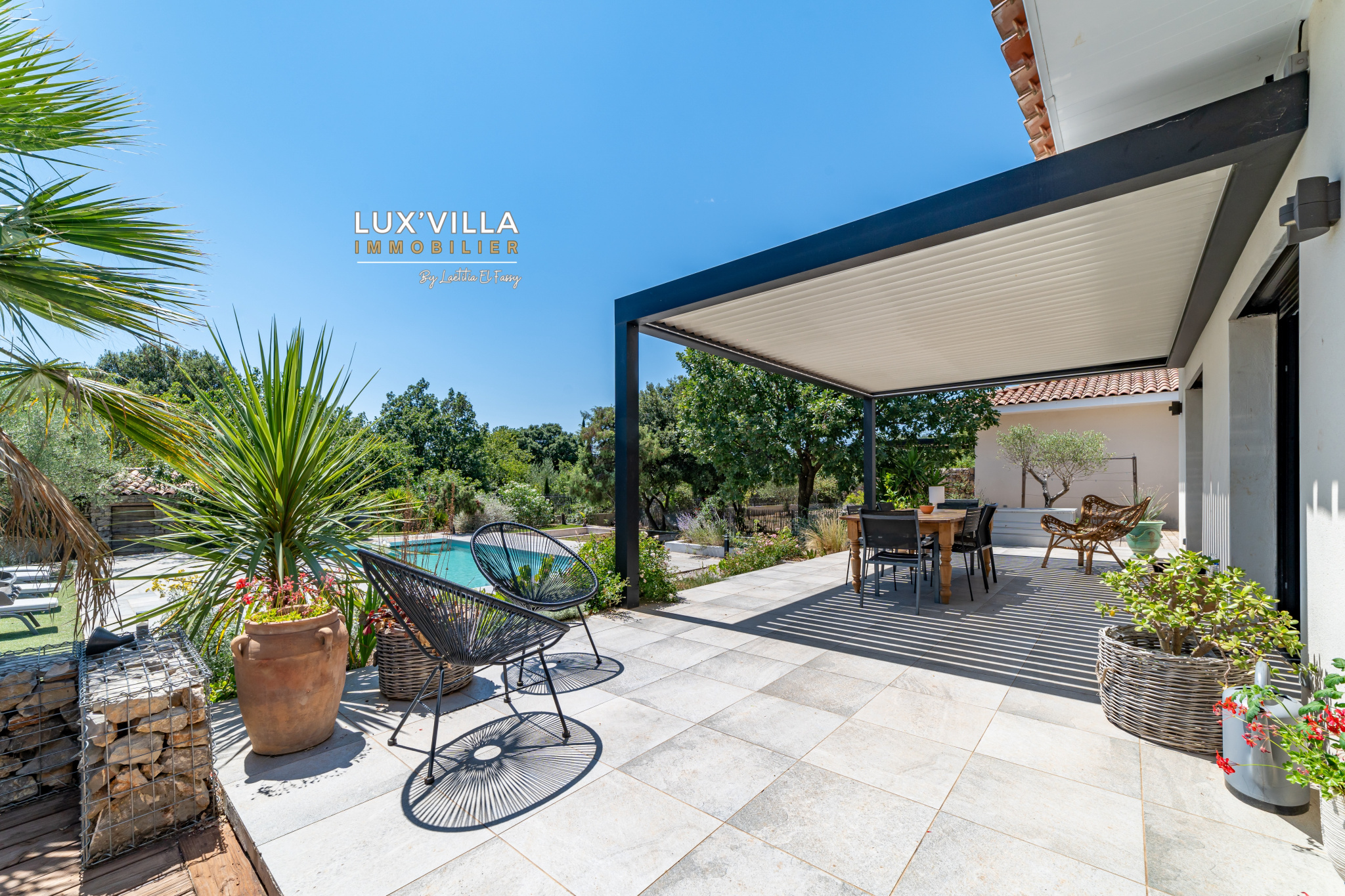Les extérieurs, soigneusement aménagés, offrent un art de vivre tourné vers la nature avec un jardin paysager sécurisé, des espaces lounge et coins ombragés, un terrain de pétanque, ainsi qu’une grande terrasse avec pergola bioclimatique dominant la piscine. La piscine 8 x 4 m, équipée d’un volet immergé et d’une pompe à chaleur, permet une utilisation confortable en toute saison.