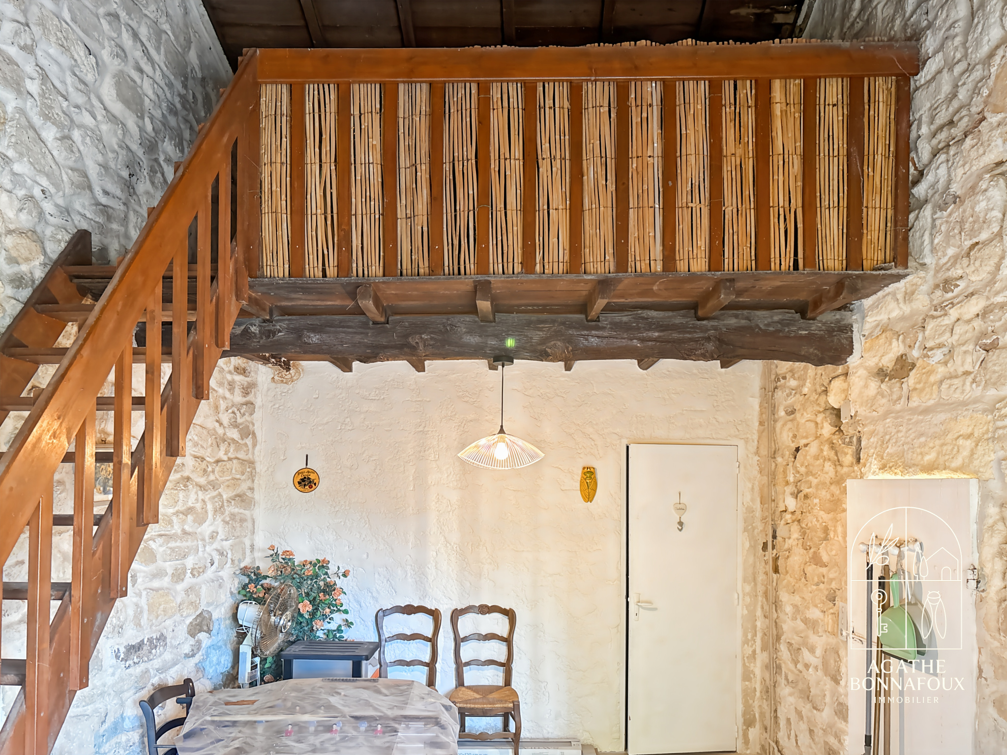 Celui-ci se compose d'une entrée, une salle à manger, un salon/séjour avec cheminée en pierre, une cuisine séparée, une grande chambre, une salle d'eau, wc, un atelier avec mezanine et une salle d'eau attentante.
