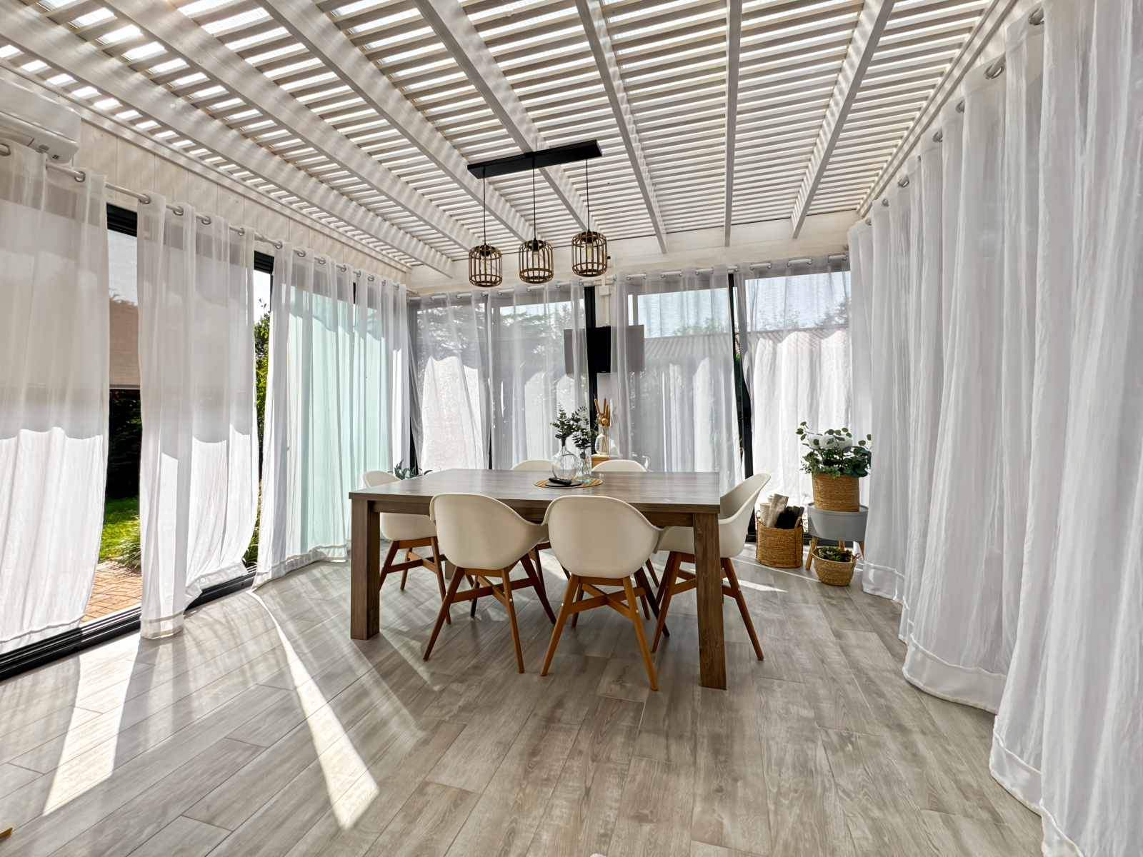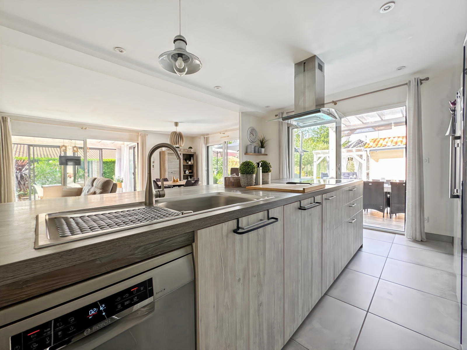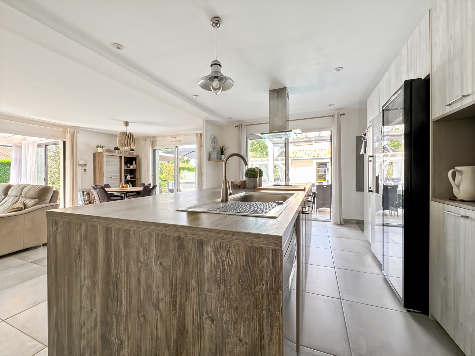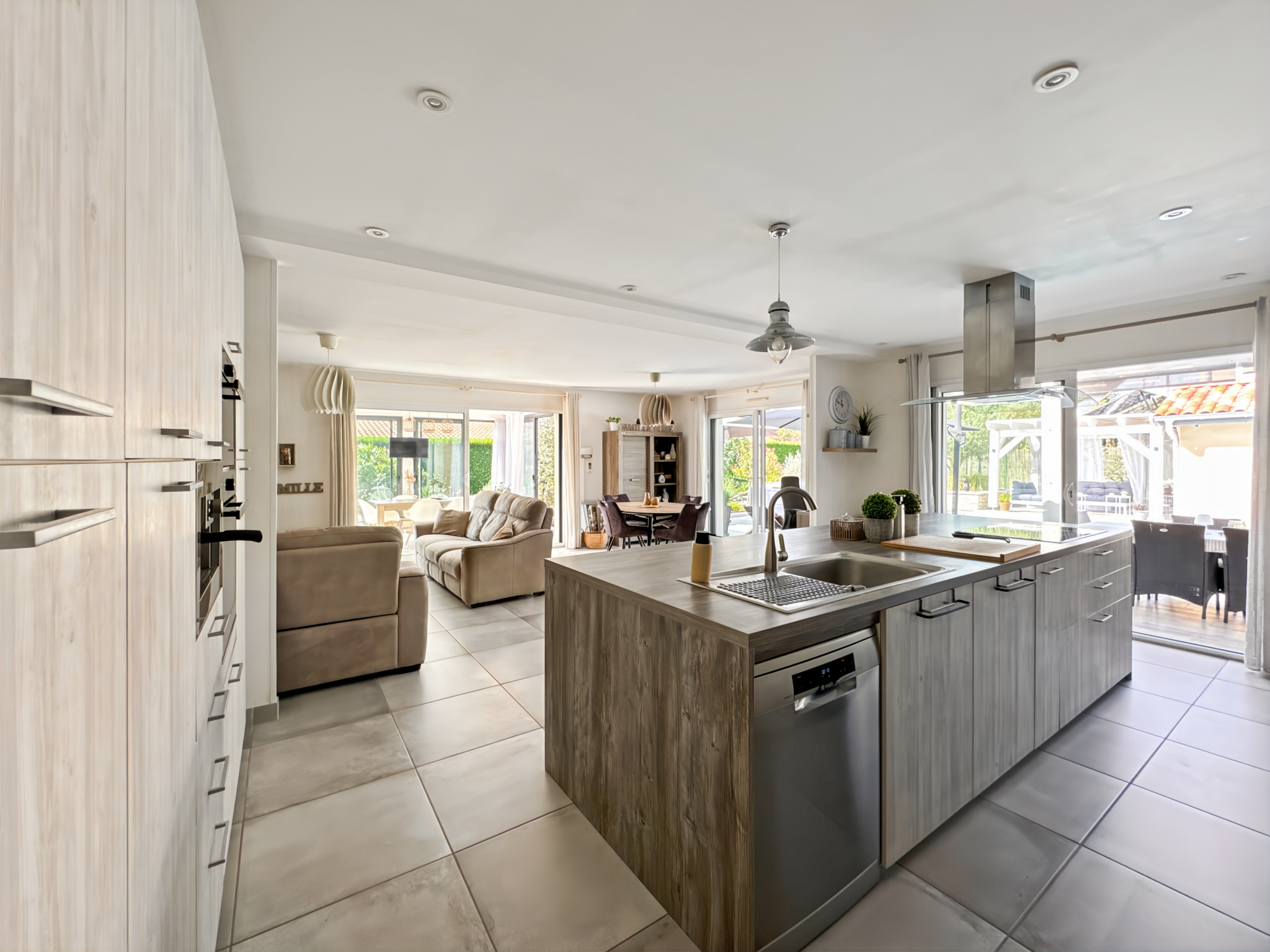 Spacieuse pièce de vie de 52 m² avec cuisine ouverte entièrement équipée et accès direct à une véranda de 15 m², chauffée.