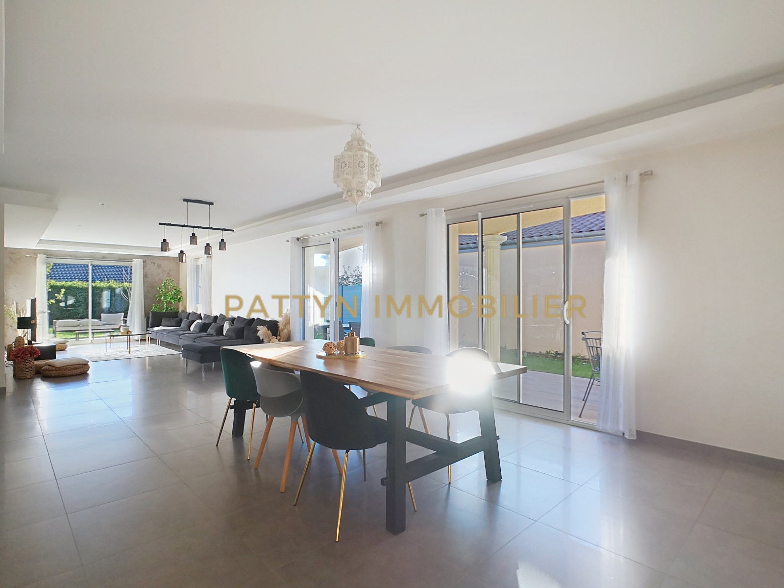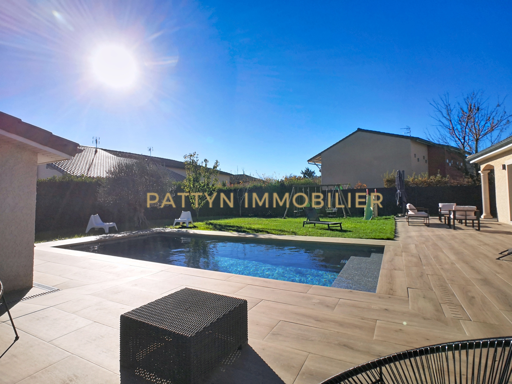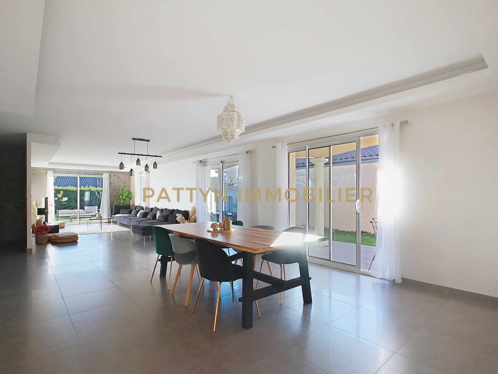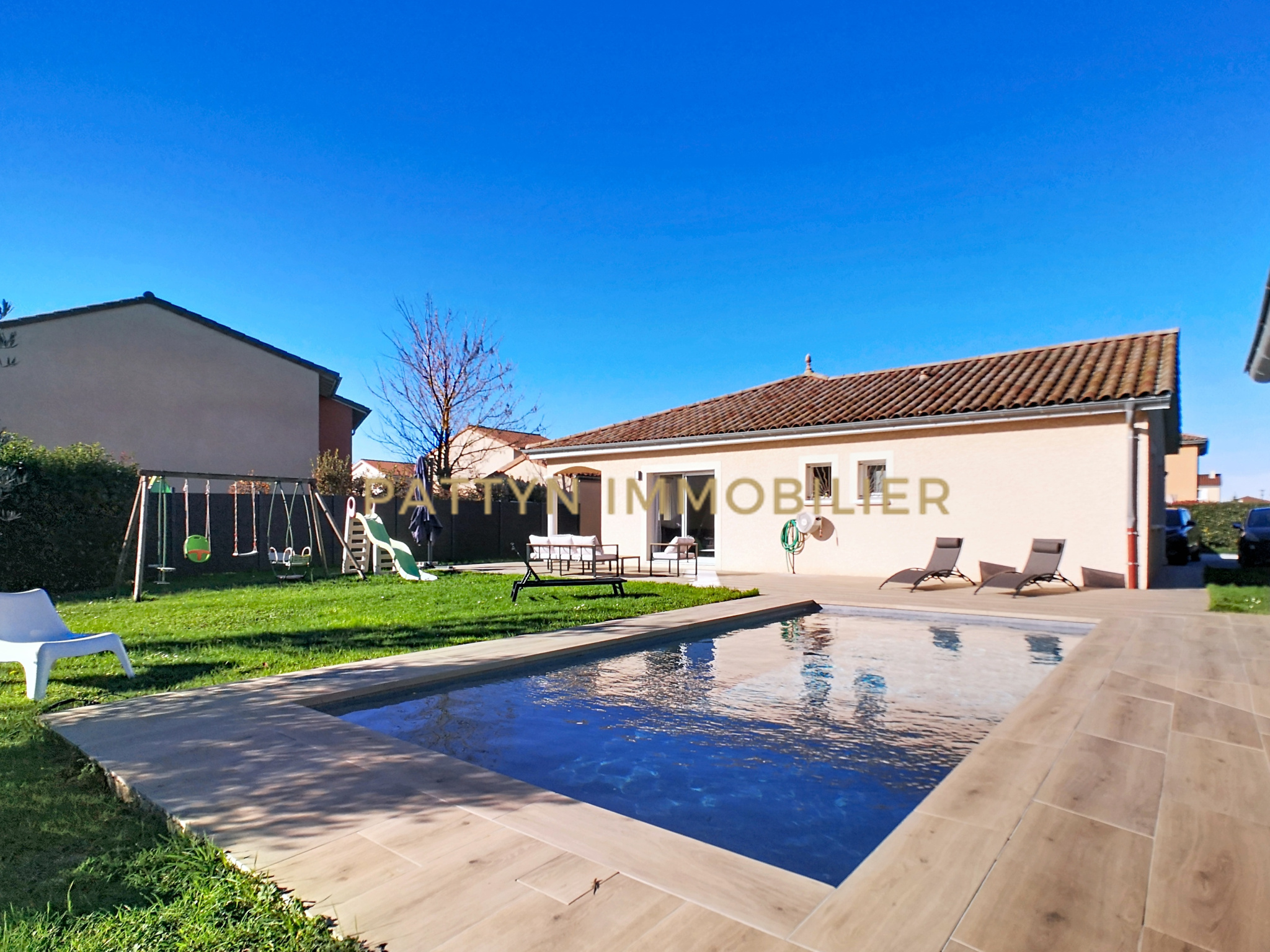 PATTYN IMMOBILIER vous présente en exclusivité cette élégante maison individuelle de plain-pied construite en 2012, offrant 159 m² habitables et 236 m² utiles, 7 pièces, 4 chambres et un garage. Elle est Idéalement située dans un quartier calme et apprécié du village de Civrieux (01390), à 5 mins en voiture de GENAY. Des commerces de proximité (boulangerie, boucherie, café tabac, coiffeur, sallon de thé) et l’école élémentaire Victor Hugo sont accessibles à 5 mins à pied. Aussi, un accès rapide à l’A46 ainsi qu’à deux gares TER reliant Lyon Part-Dieu et Perrache permettent de vivre à la campagne à moins de 30 mins de Lyon. Implantée sur une parcelle de 902 m² entièrement clôturée et sécurisée par un portail coulissant motorisé, cette maison offre un cadre de vie privilégié avec son jardin, sa piscine chauffée récente, son pool-house équipé avec cuisine d’été, ainsi que deux terrasses, dont une couverte permettant de profiter pleinement des espaces extérieurs.