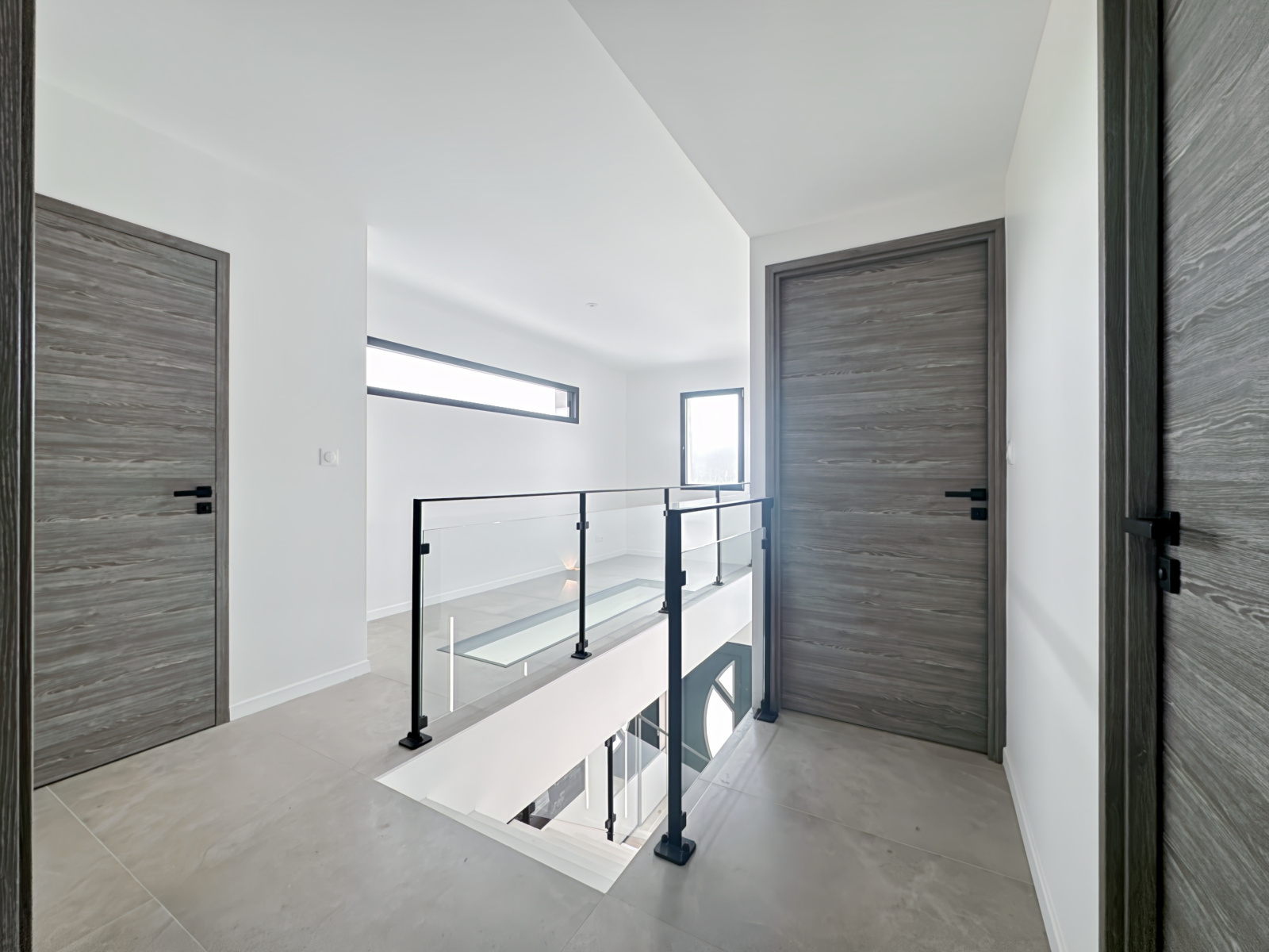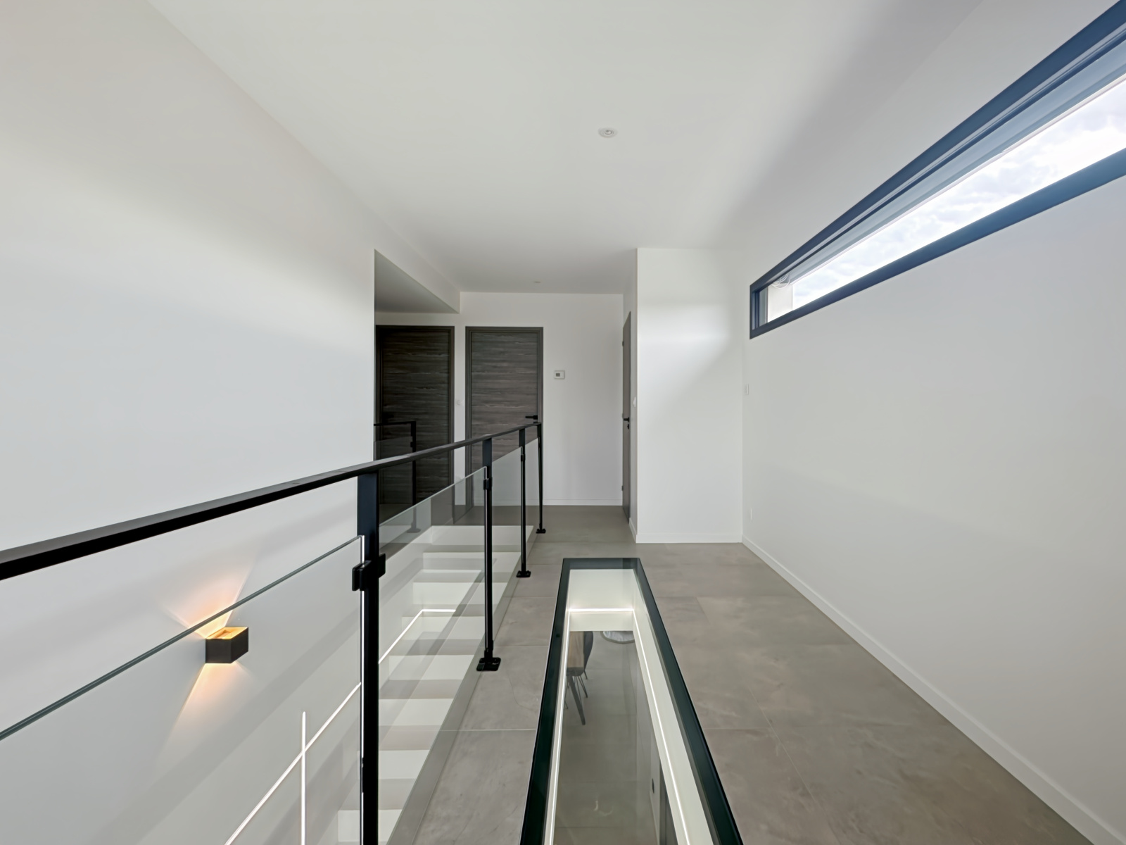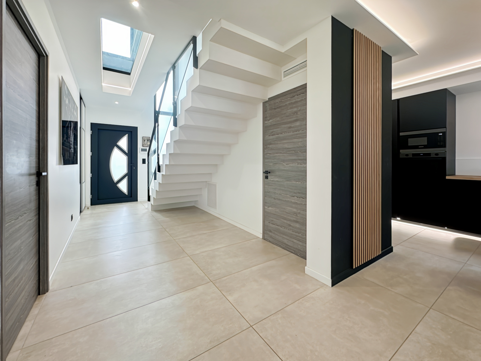 Elle propose des finitions modernes, telles qu'une grande baie a galandage, un vide sur l'entrée en verre intégré dans la dalle, ou des bandeaux LED lumineux incorporés dans les murs, pour un design épuré et travaillé.
