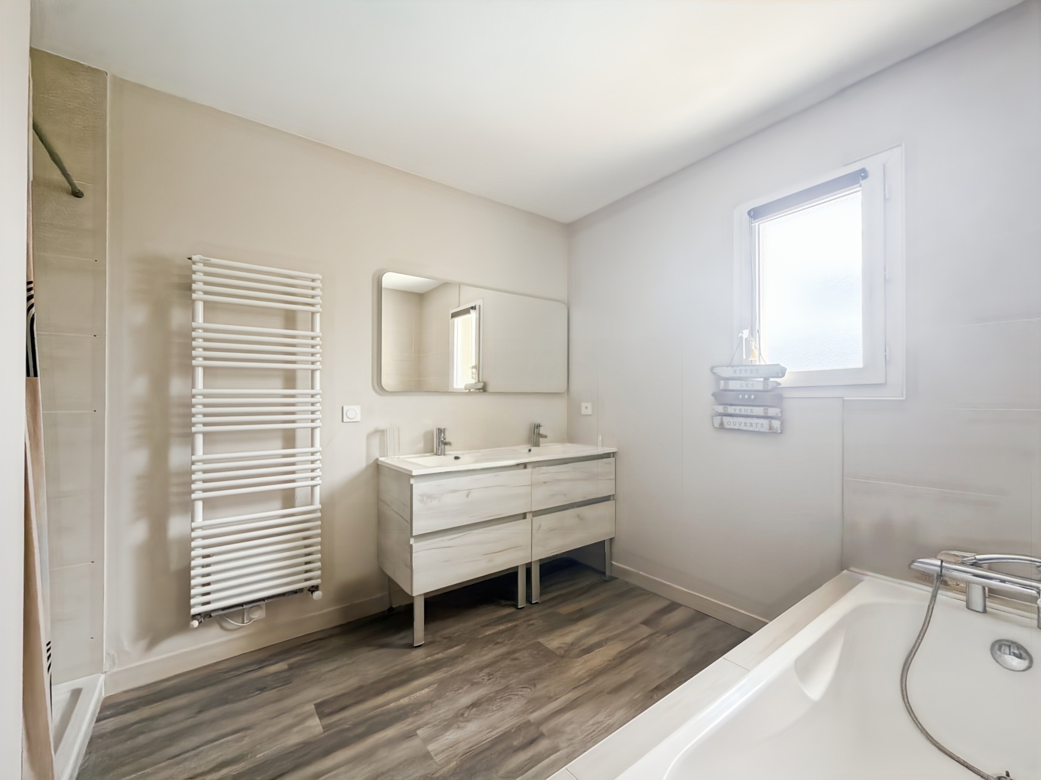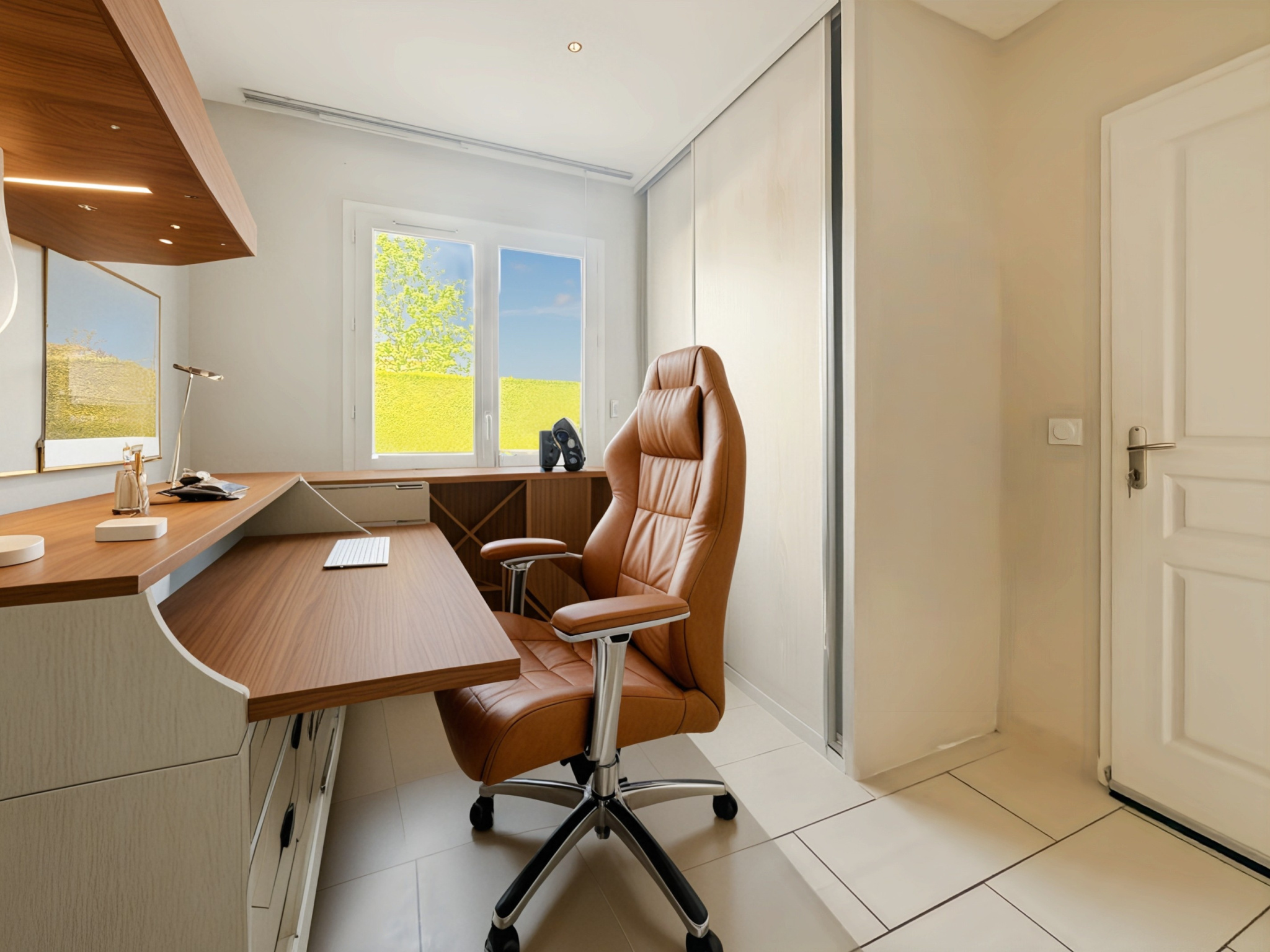 À l’étage, vous découvrirez 4 chambres, dont une suite parentale avec sa salle d’eau privative, et une chambre légèrement plus petite utilisée en second bureau, ainsi qu’une seconde salle de bain, idéal pour le télétravail ou un espace indépendant.