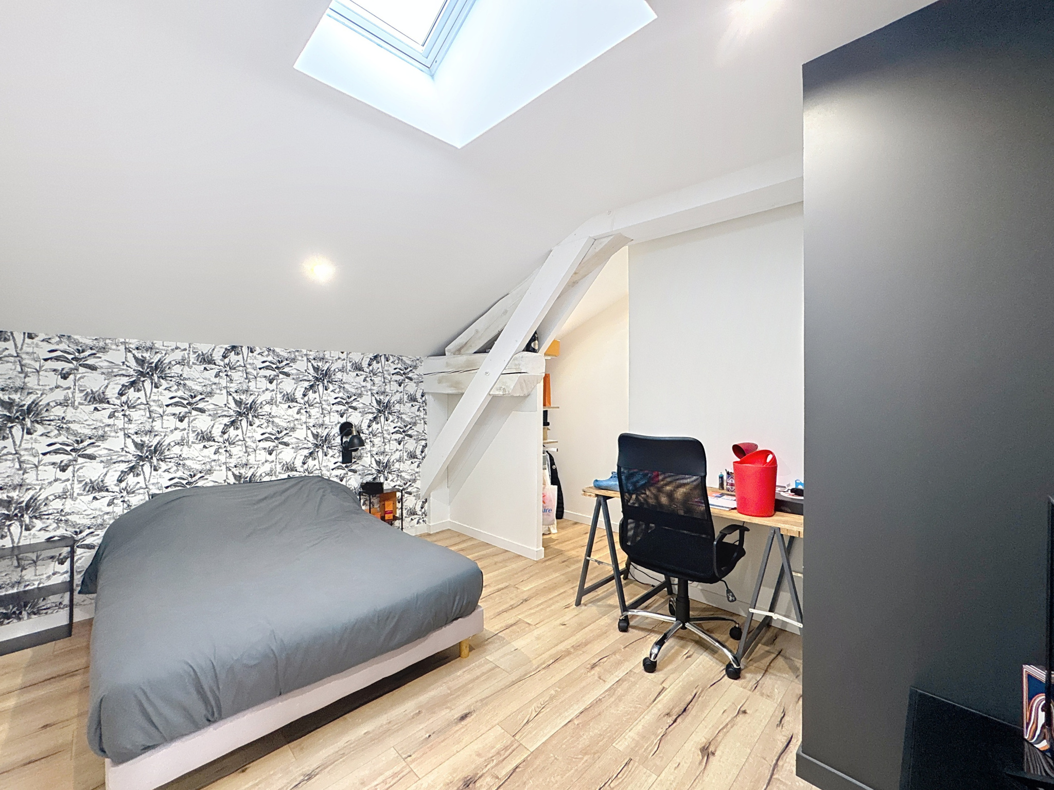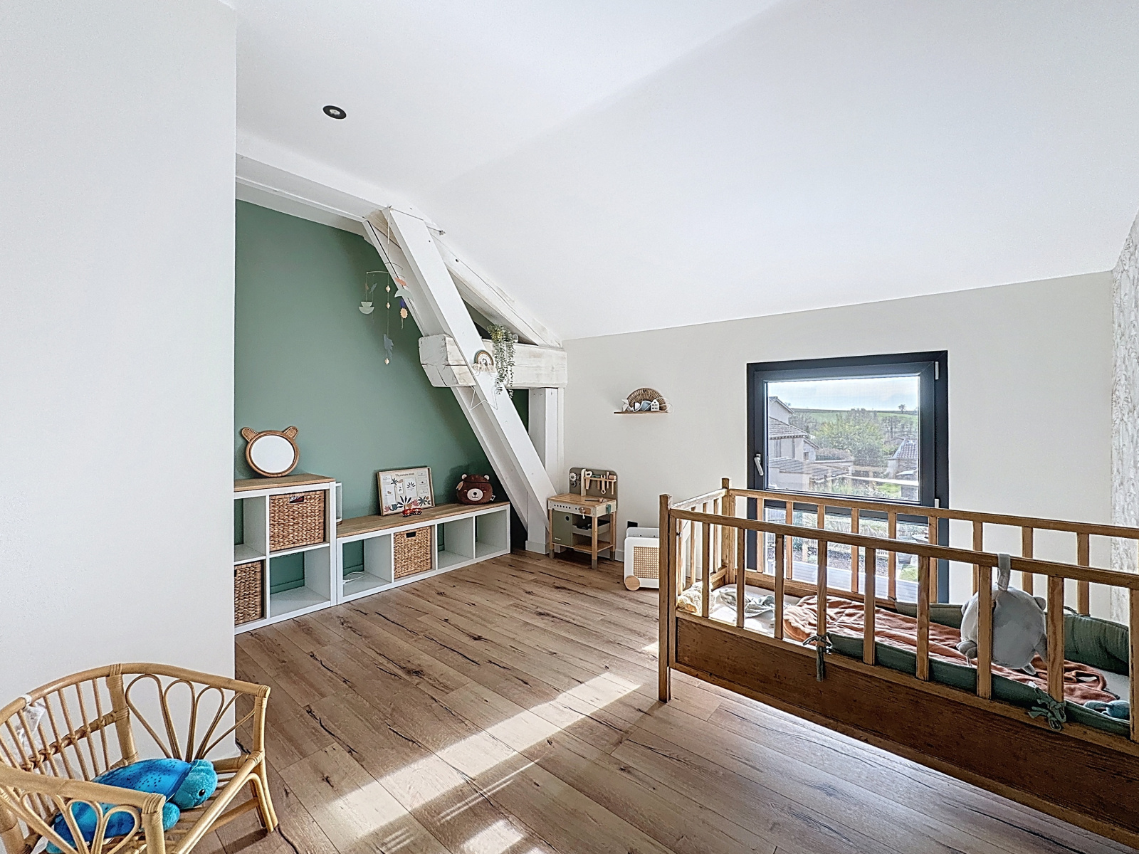 L’étage accueille cinq chambres confortables, pensées pour offrir à chacun son espace. Certaines disposent de placards ou d’un dressing, et l’ensemble est complété par une salle d’eau contemporaine et un wc. Le garage de 16 m² vient parfaire les prestations avec recharge électrique pour véhicule.
