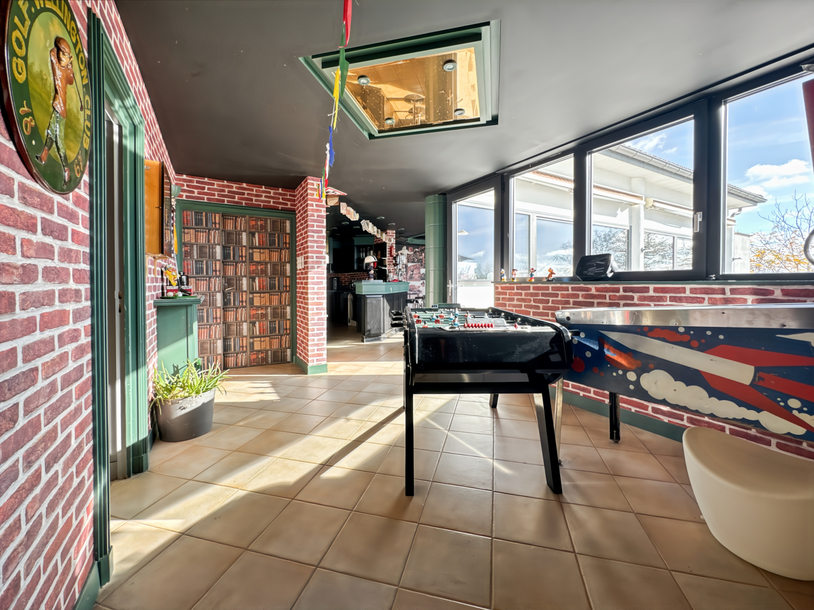 Un espace salle de jeux dessert les pièces, créant une atmosphère conviviale idéale pour une famille.