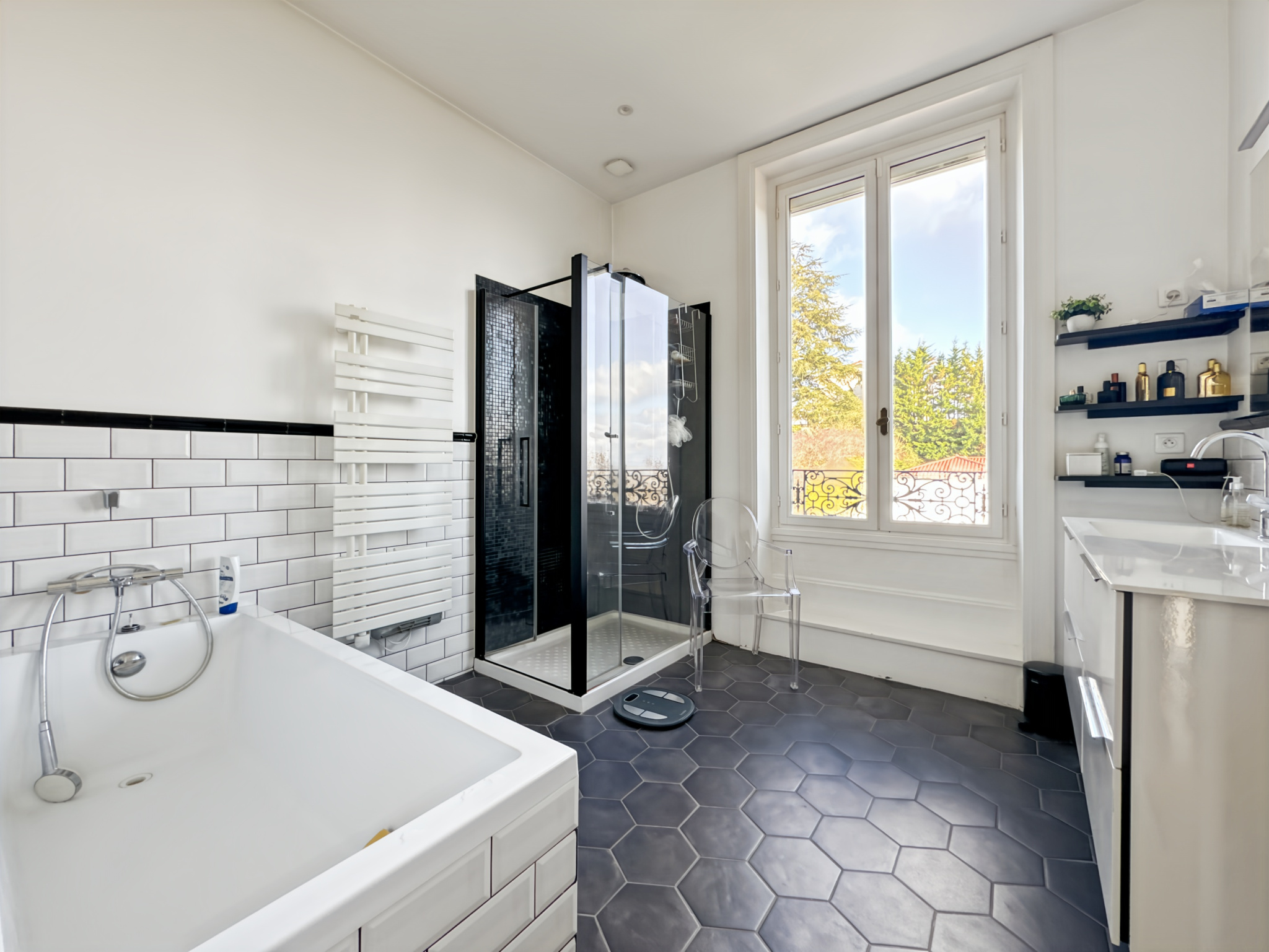 Dès l’entrée, un hall d’époque annonce le ton : volumes généreux et élégance intemporelle.