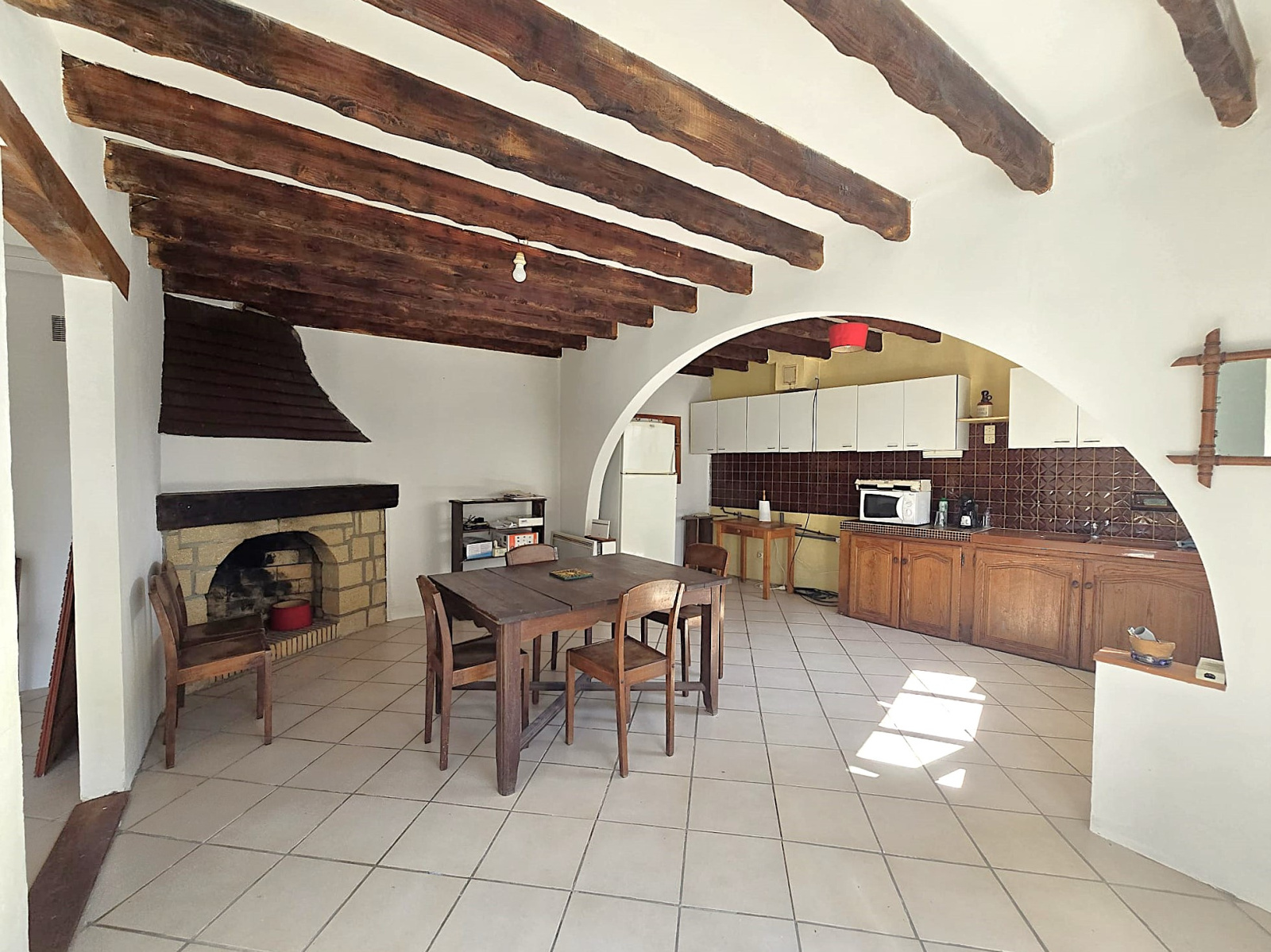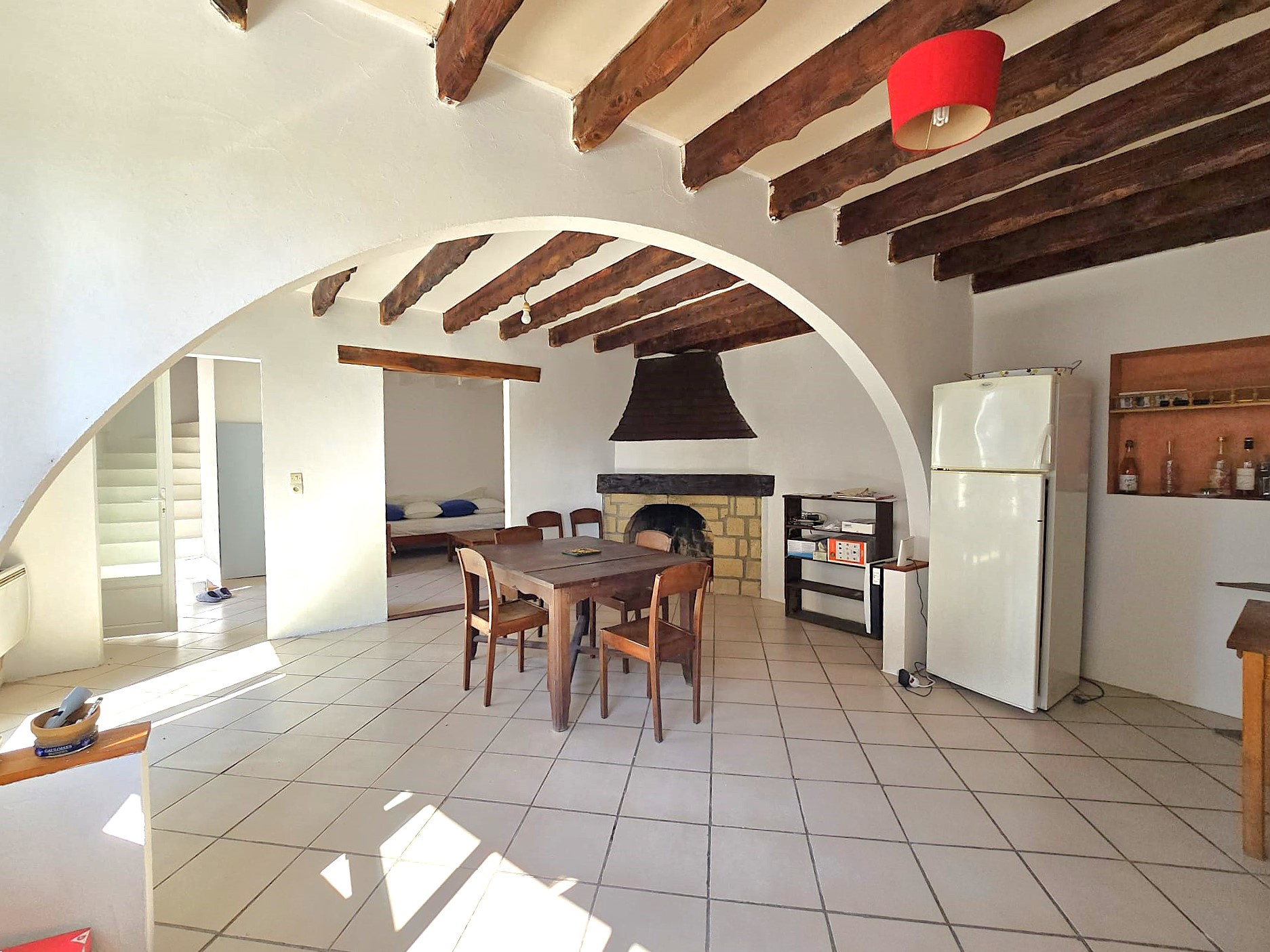 Une arcade élégante mène à l’espace dinatoire agrémenté d’une cheminée, ainsi qu’au salon, créant un ensemble coconning. Un bel escalier en béton peint mène à l’étage.