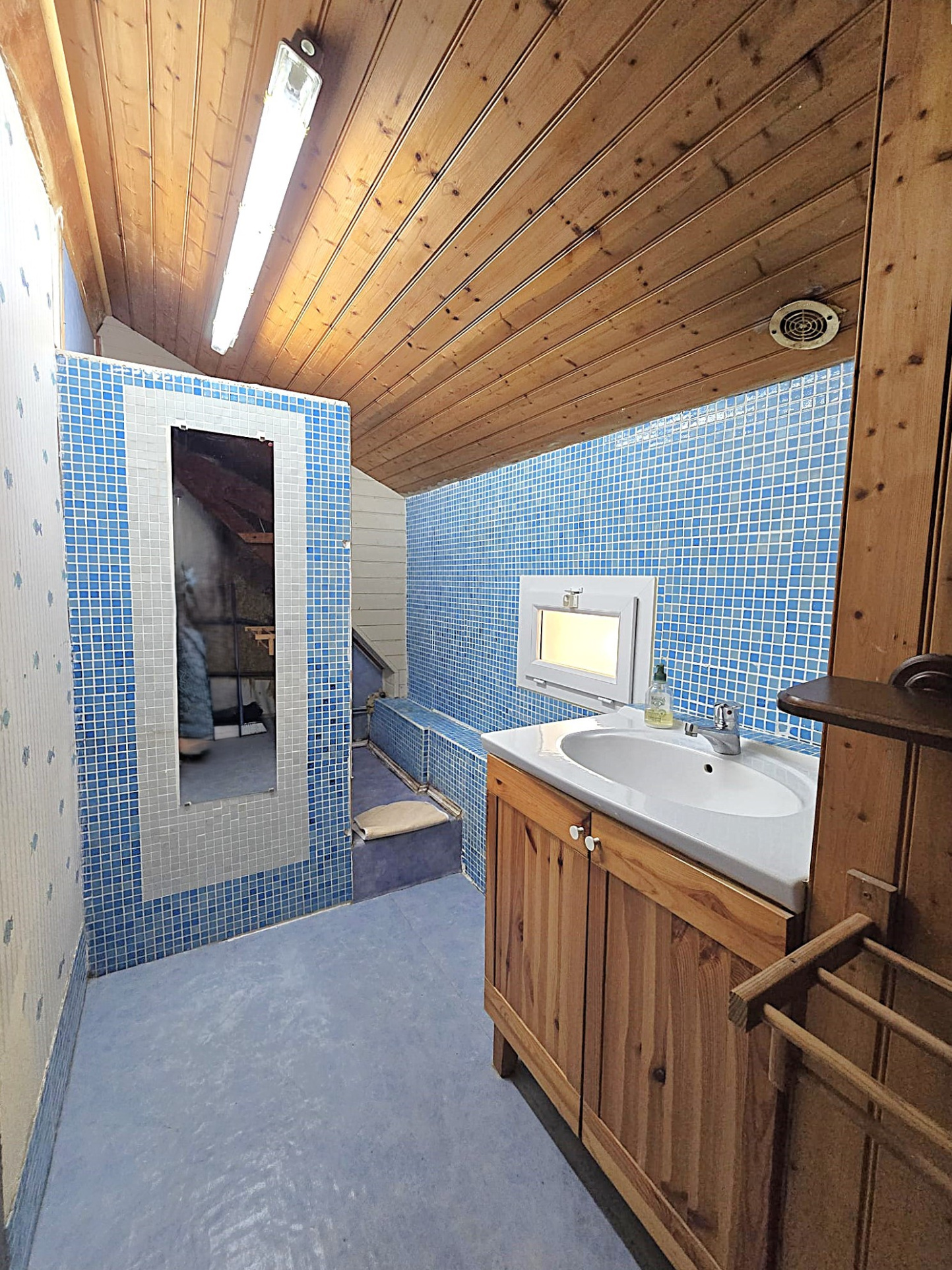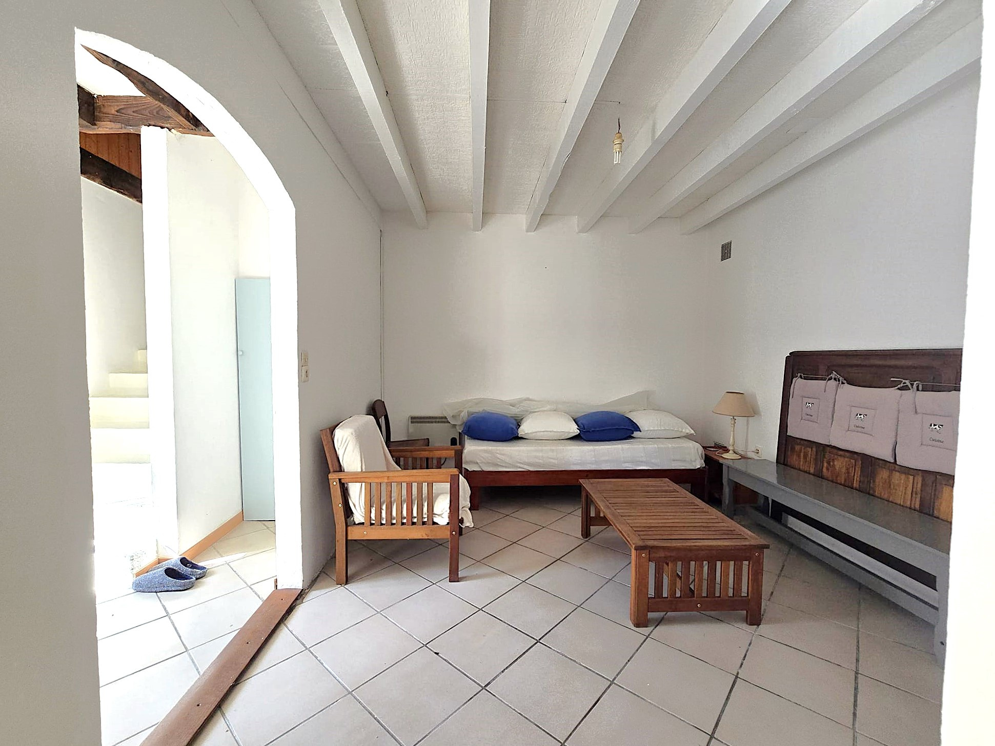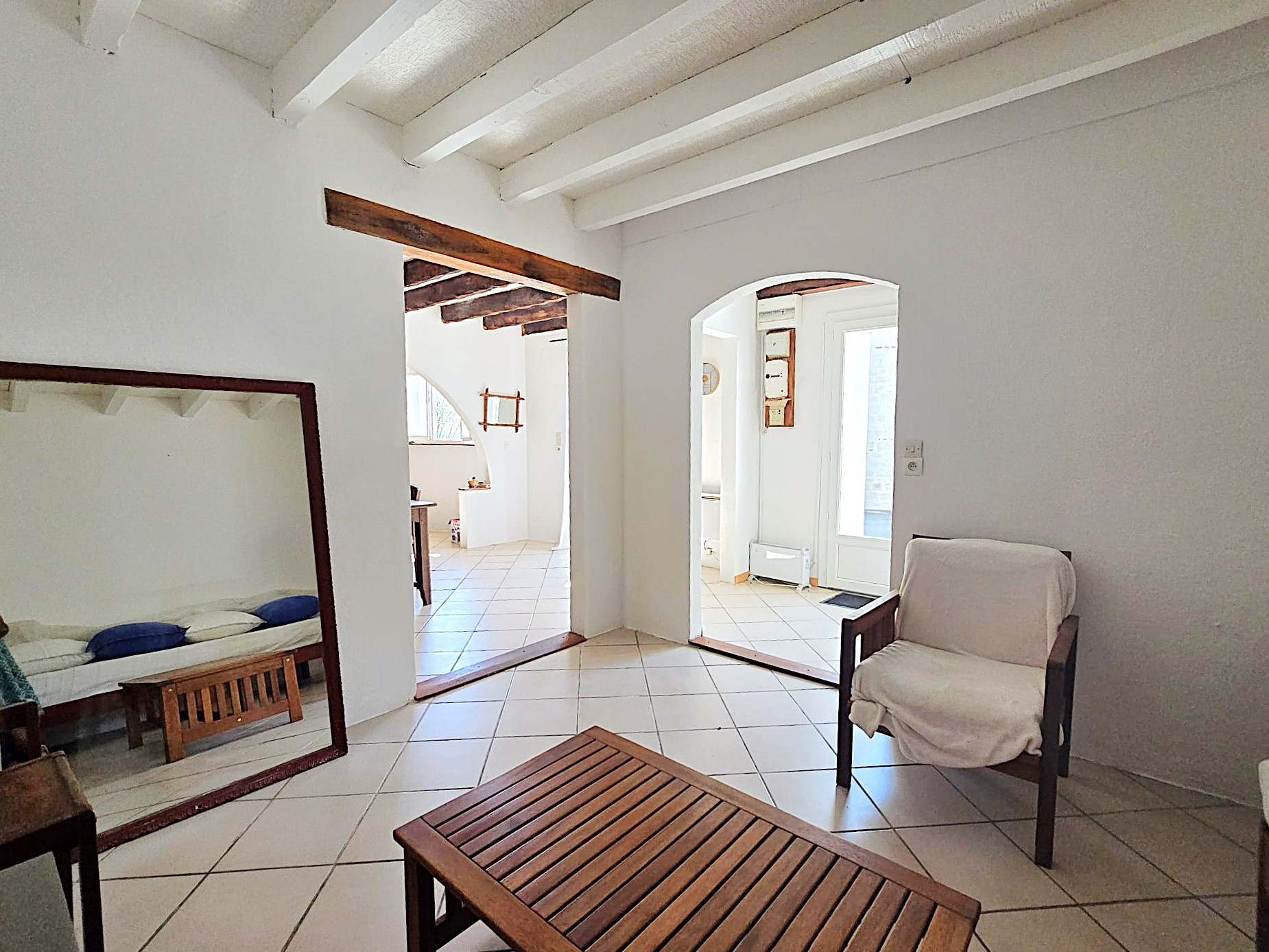 À l’extérieur, une cour carrelée et arborée d’environ 50 m² offre un espace intime et agréable, idéal pour profiter des beaux jours. une salle d'eau et des wc