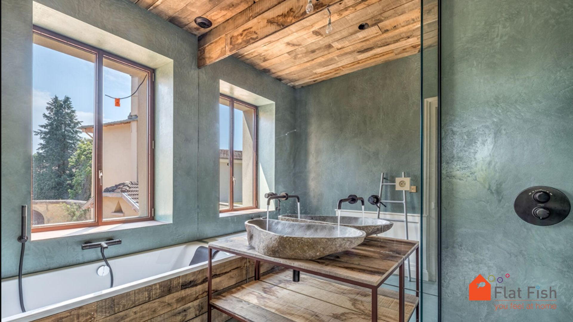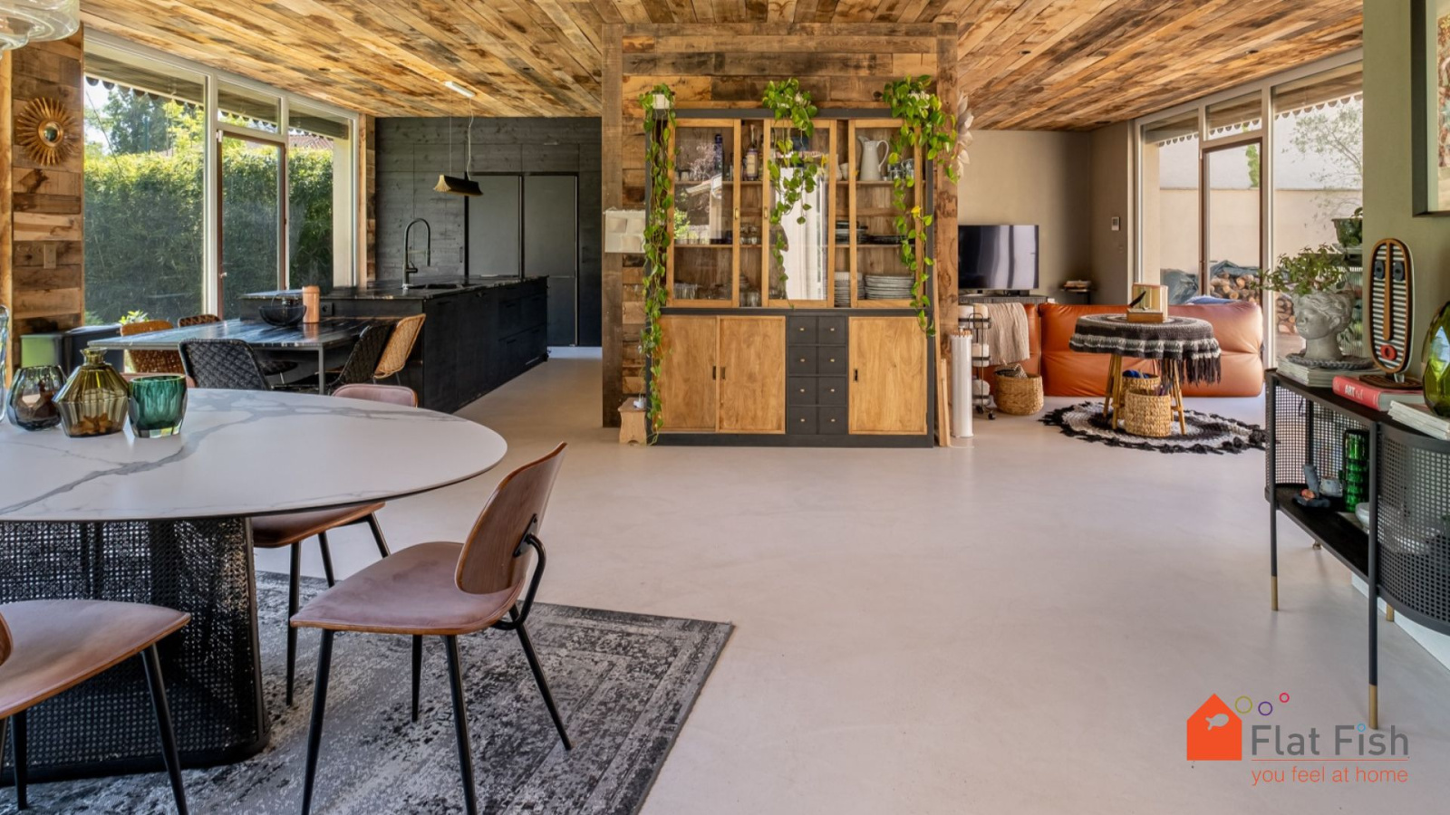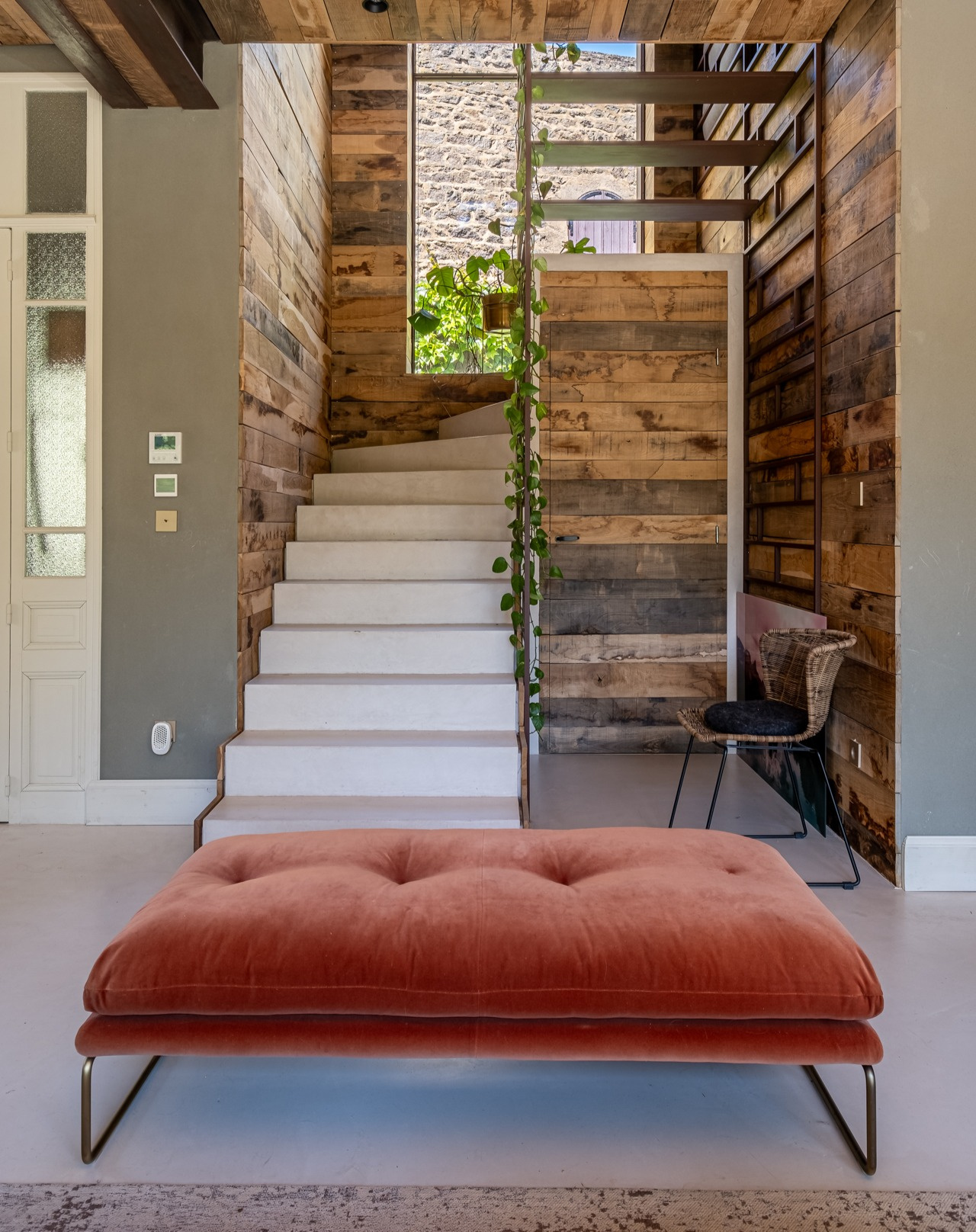 Dès l’entrée, le ton est donné : les matériaux nobles tels que le béton ciré, les plafonds en chêne massif ou encore la peinture à l’argile s’harmonisent parfaitement, offrant un subtil équilibre entre authenticité et modernité.